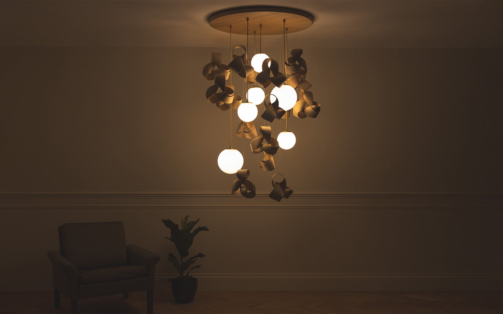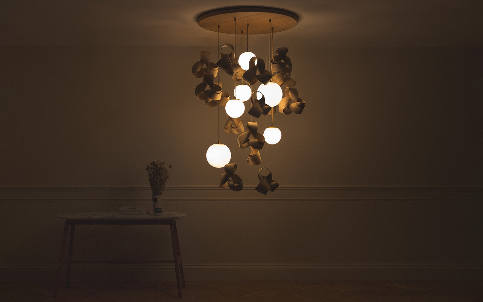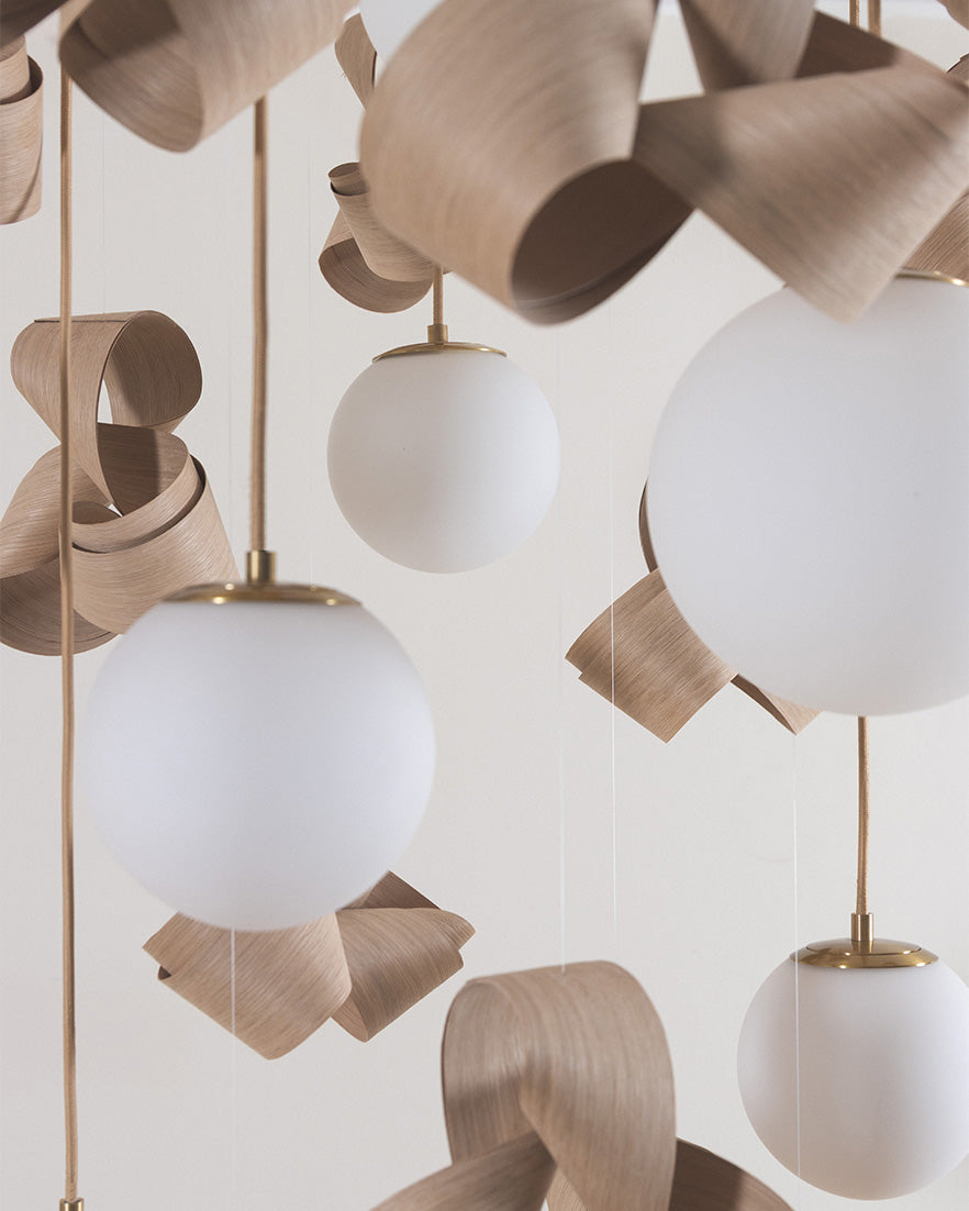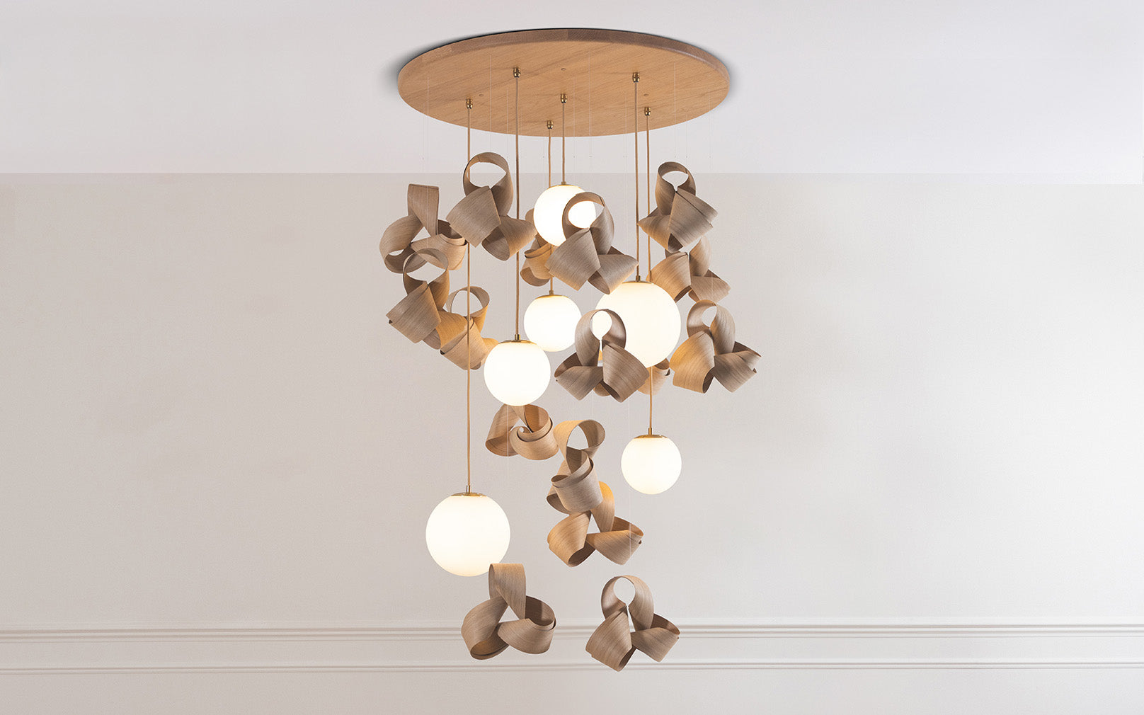Taking inspiration from the lunar constellations seen on the Cornish coastline, the oak Luna Chandelier is composed of six translucent glass spheres that bring weightless illumination to any space they reach. These spheres hang alongside fifteen impressive, double-layered, twisted wooden wings that appear weightless, soaring together to create a dynamic visual display.