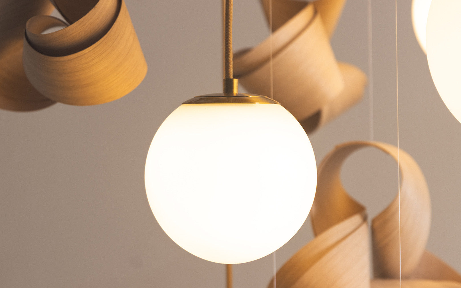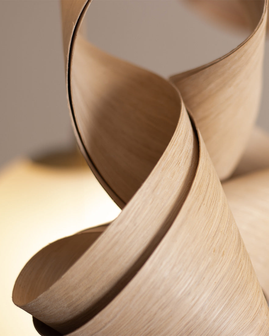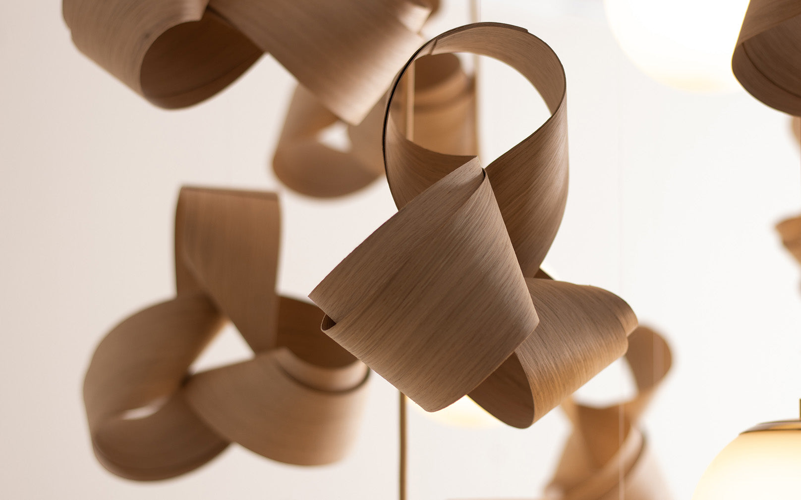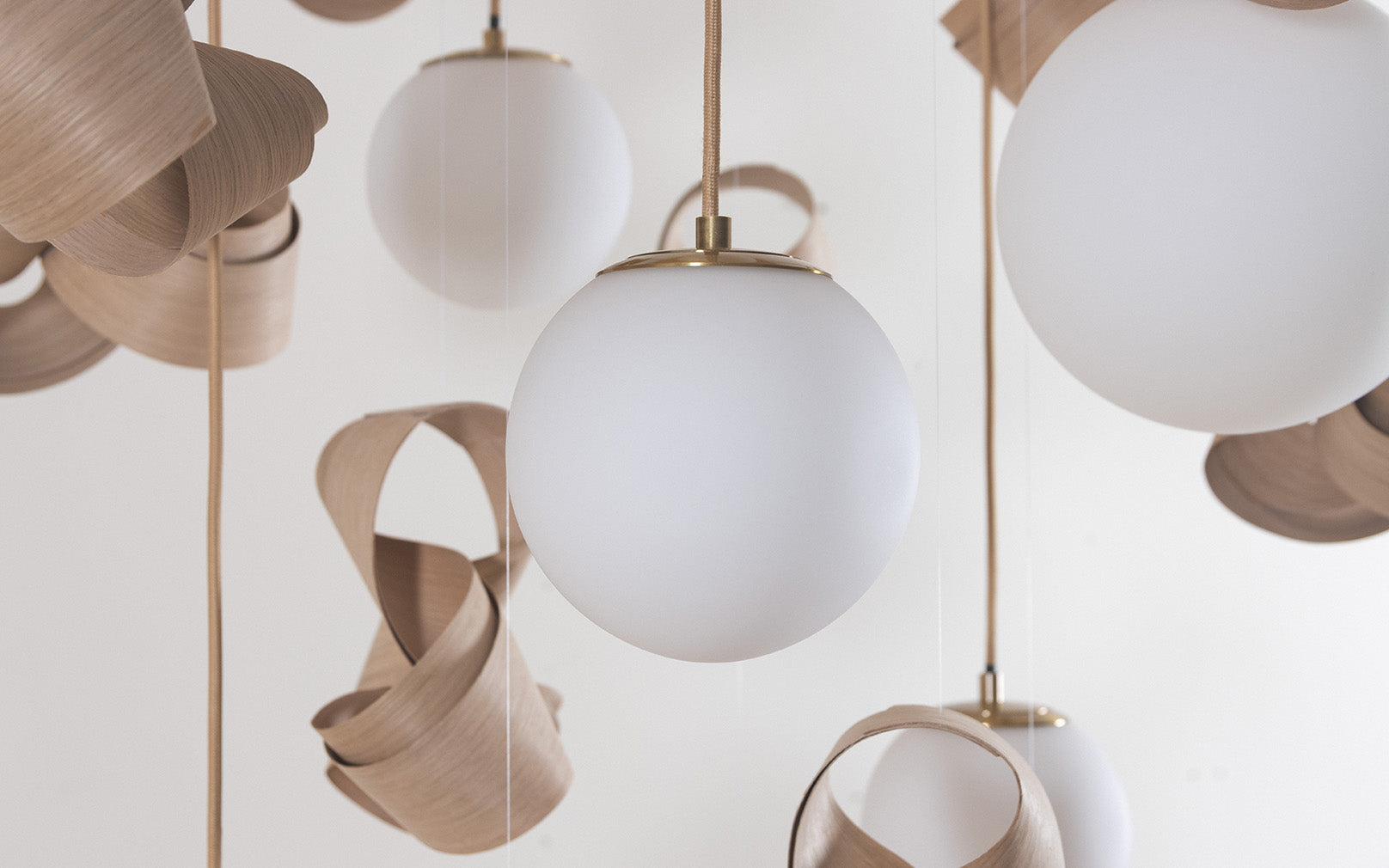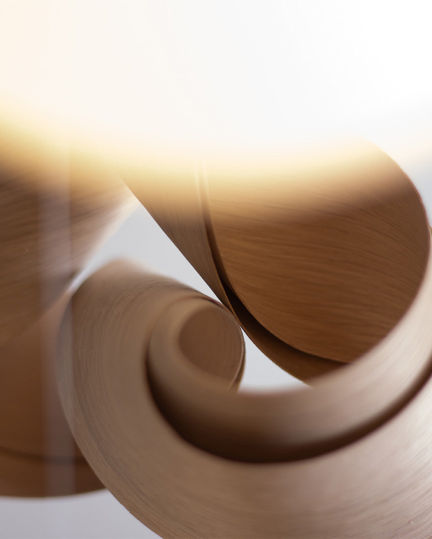 Taking inspiration from the lunar constellations seen on the Cornish coastline, the oak Luna Chandelier is composed of six translucent glass spheres that bring weightless illumination to any space they reach. These spheres hang alongside fifteen impressive, double-layered, twisted wooden wings that appear weightless, soaring together to create a dynamic visual display.