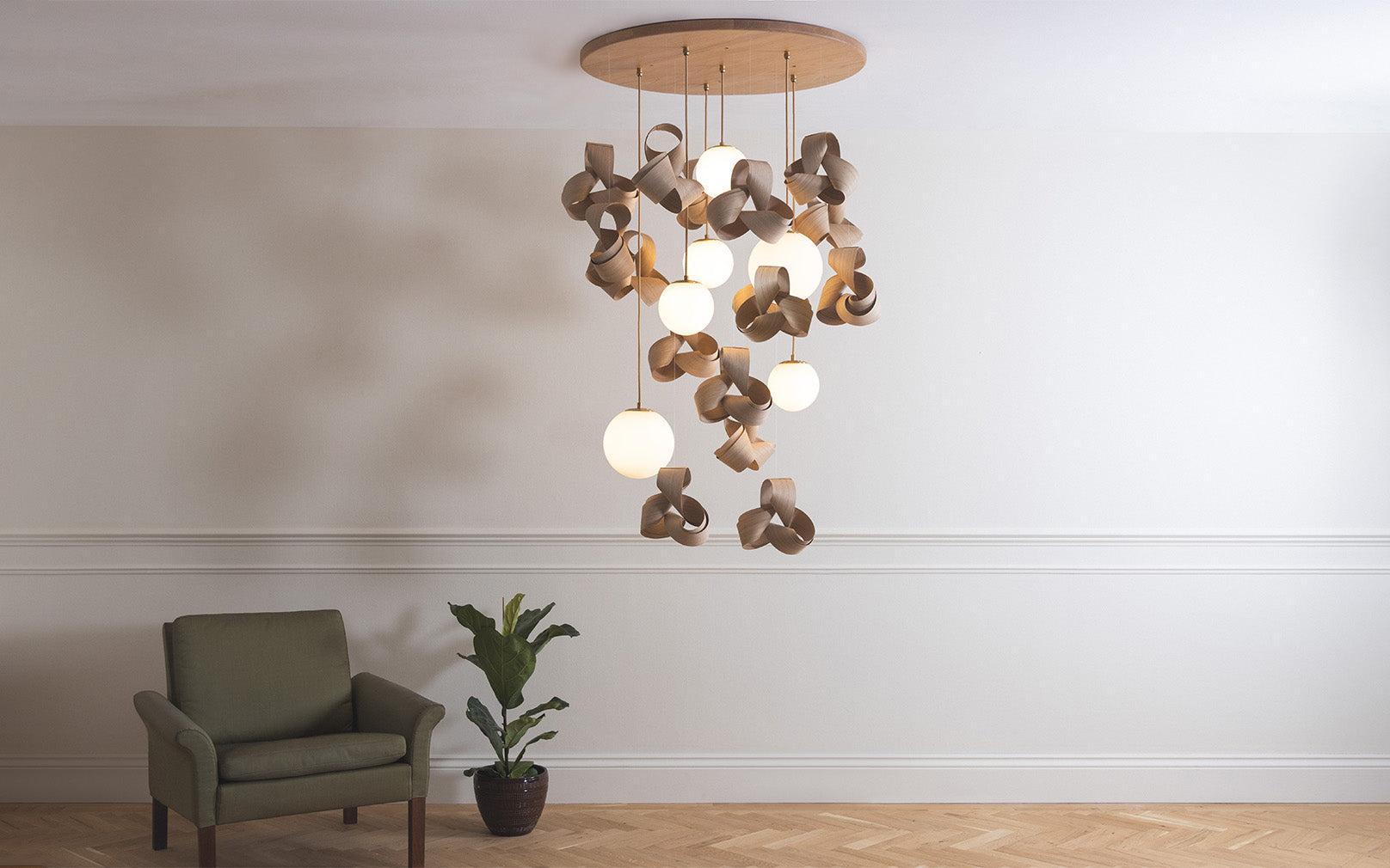 Discover a range of contemporary, nature-inspired chandeliers from Tom Raffield. Designed to suit a range of spaces and property styles, our statement wooden chandeliers are steam bent by hand and come in a variety of sizes and wood types to create a spectacle in any room.