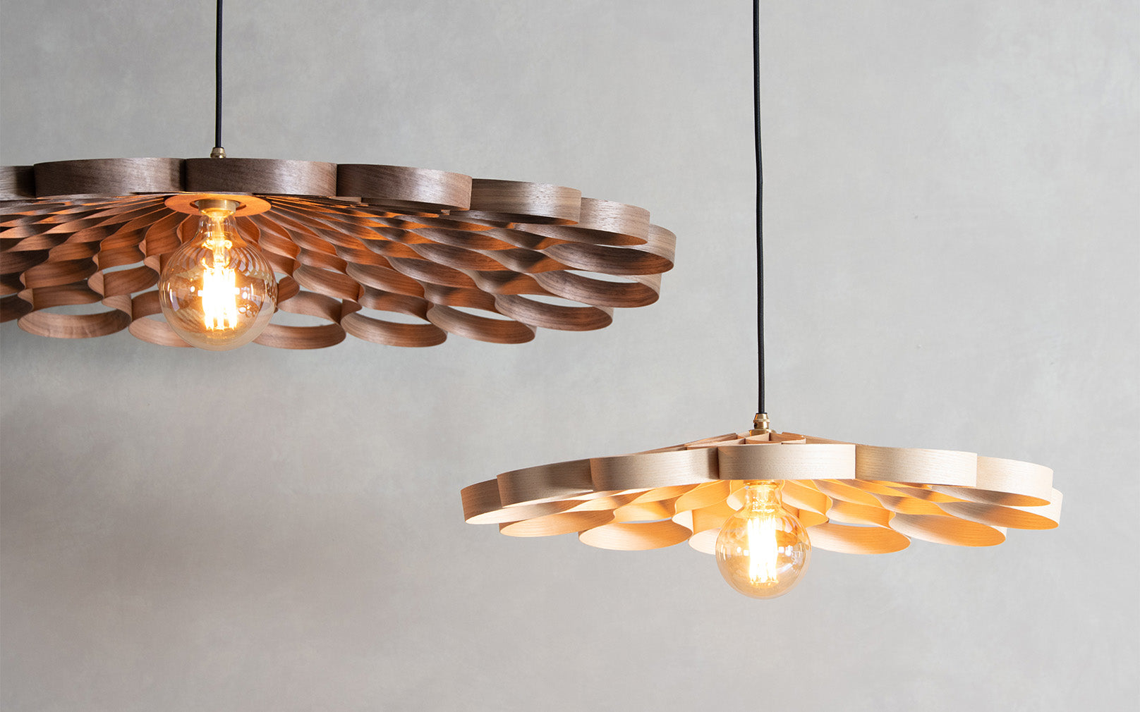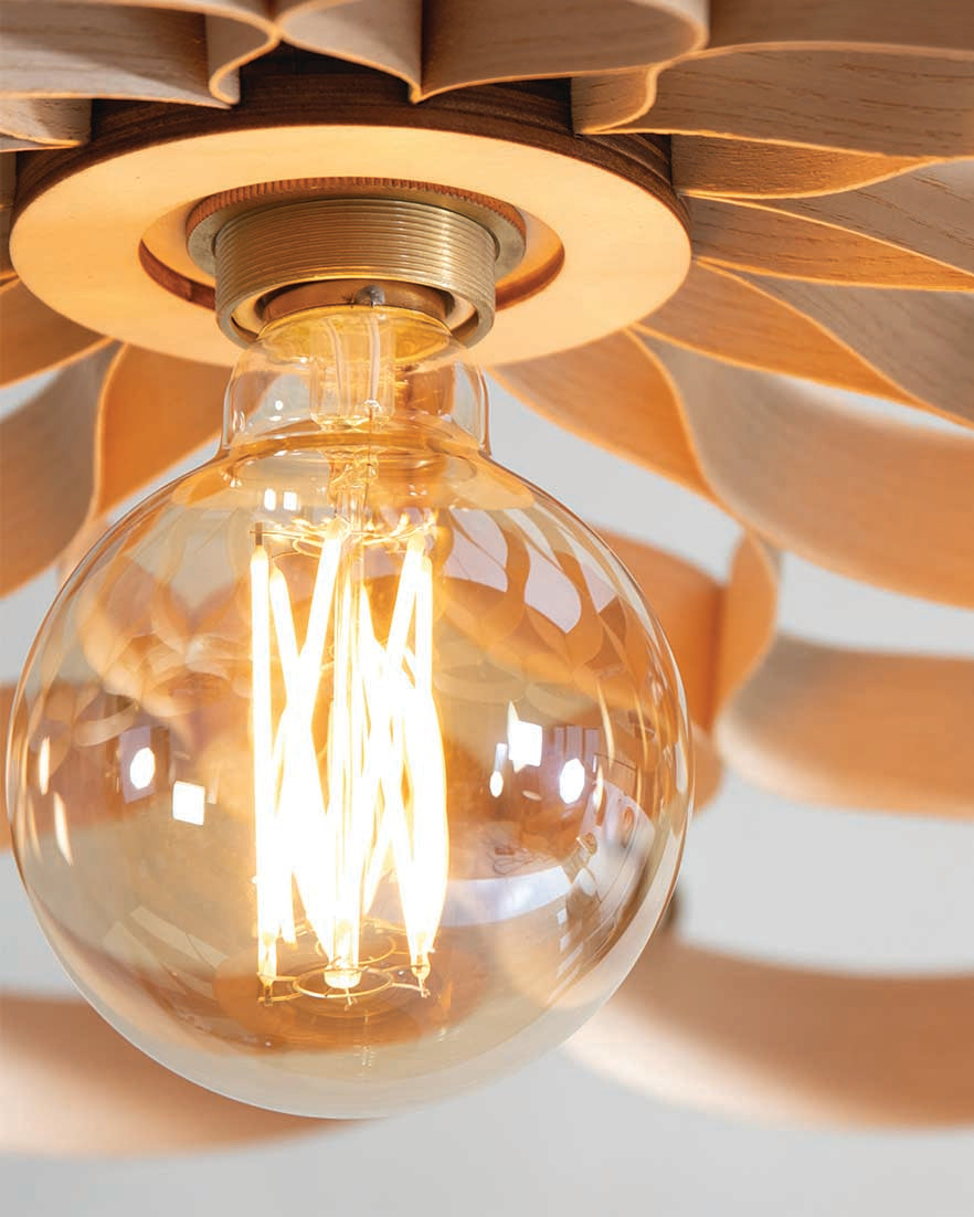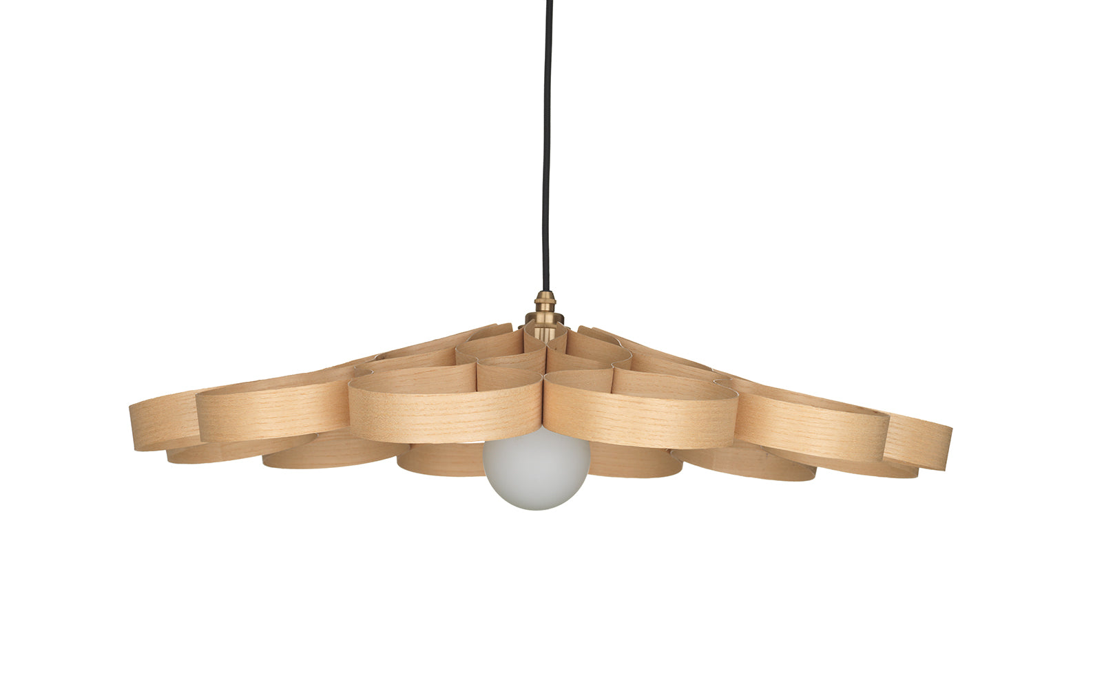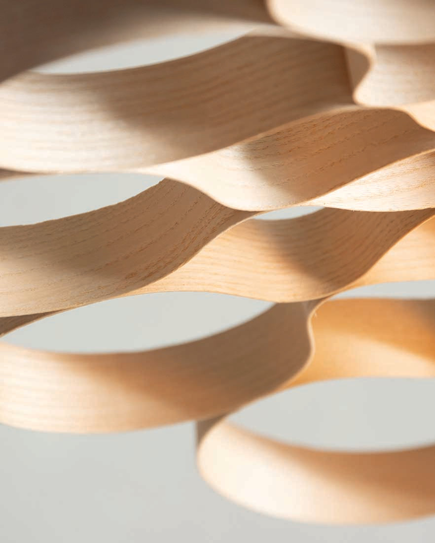 Elemental, geometric, sequential. A surge of optical energy; a silhouette of sustainable craftsmanship. Switched on or off, boundless shadows unfurl, pirouette and tumble in kaleidoscopic tessellation creating an extraordinary spectacle in your space. When illuminated, an abundance of golden glow diffuses from the Small Arame Pendant’s steam bent core - casting an aura of light that's truly transfixing.