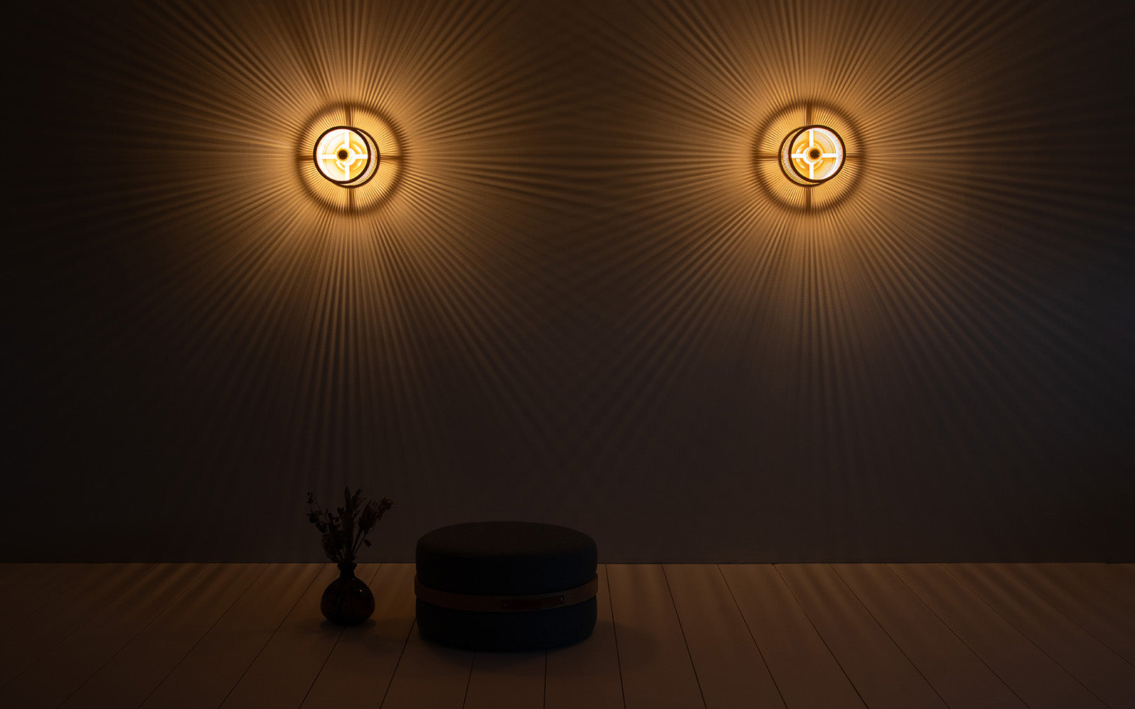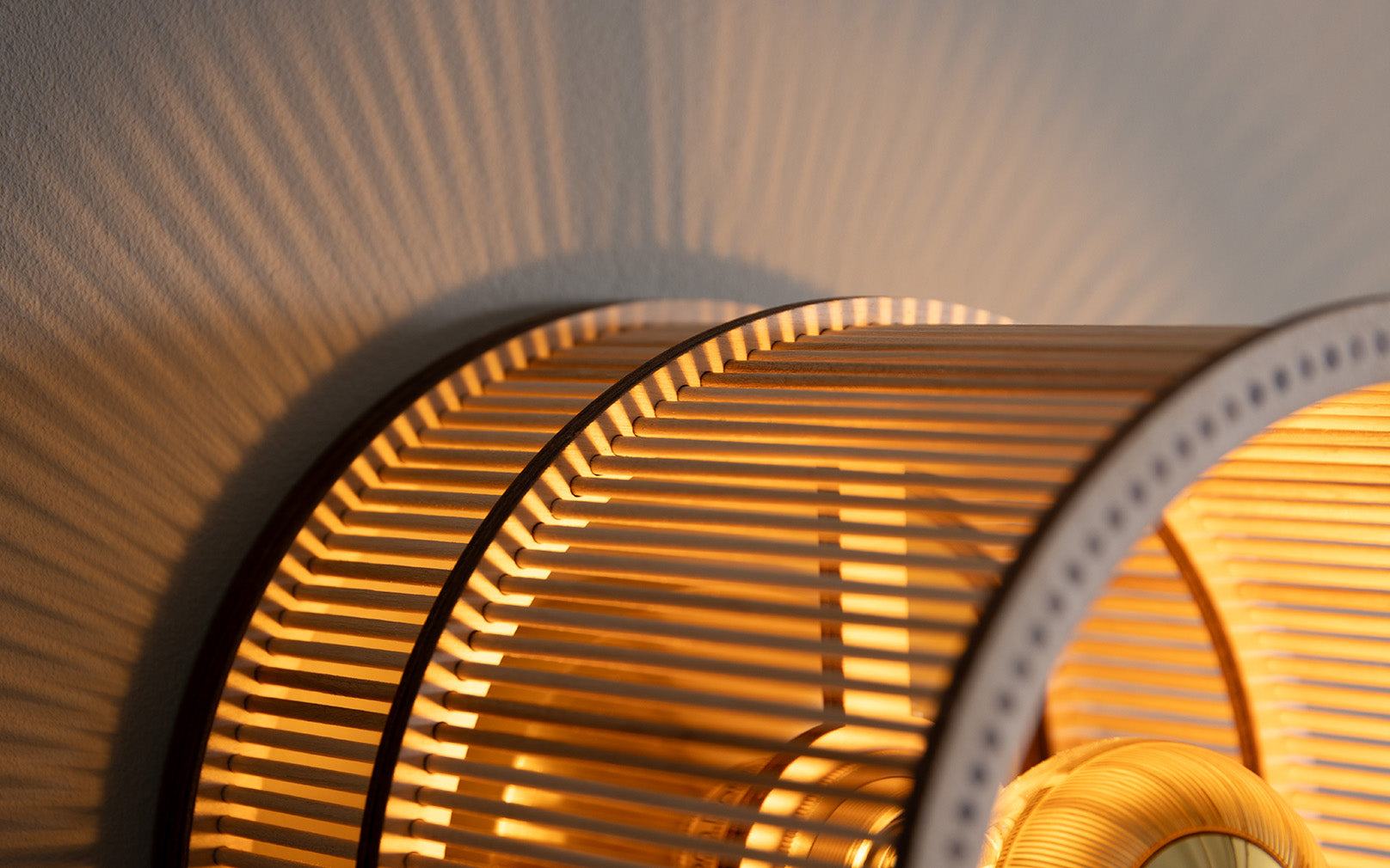 Ethereal dowels are slotted into a complex birch plywood frame that shrouds an exposed filament bulb. Intricately placed, each illuminated pillar distributes kaleidoscopic, vertical shadows that delights the eye of the beholder. Handcrafted from sustainably sourced wood, this wooden wall light provides eccentric beauty to any bedroom, hallway, or living space alike.