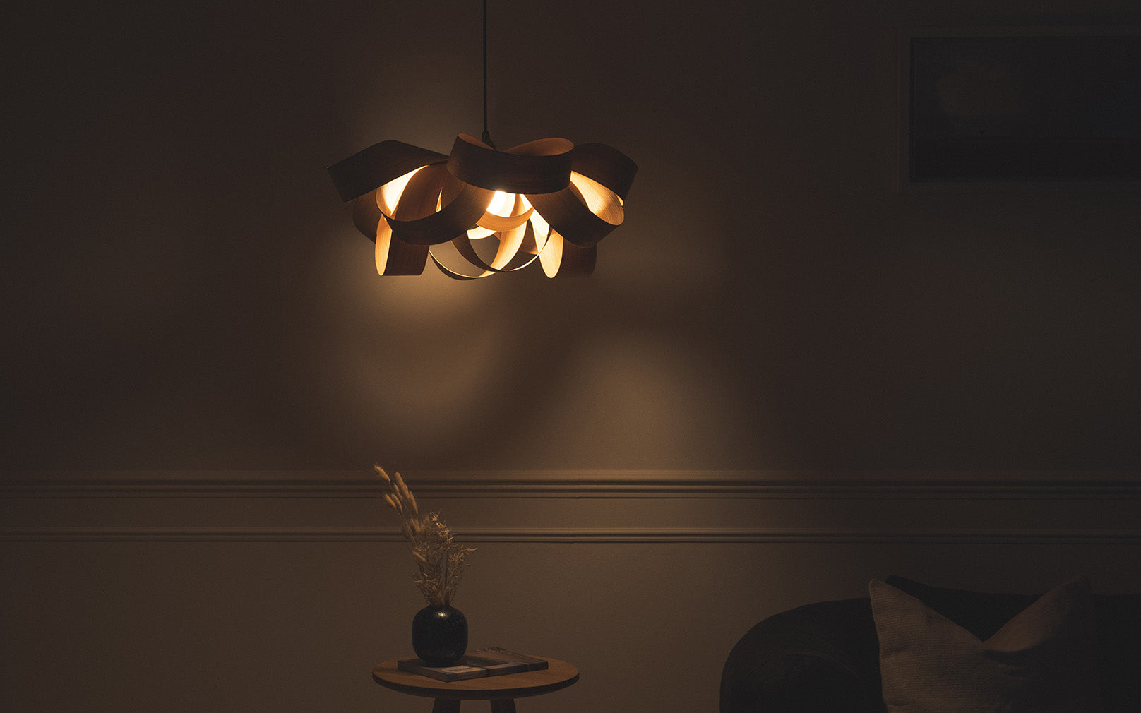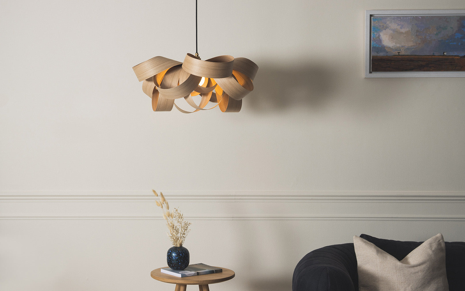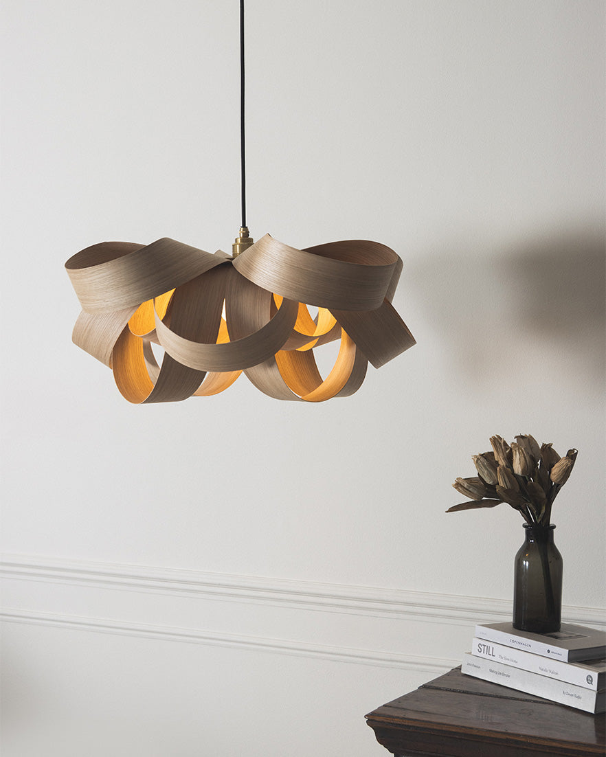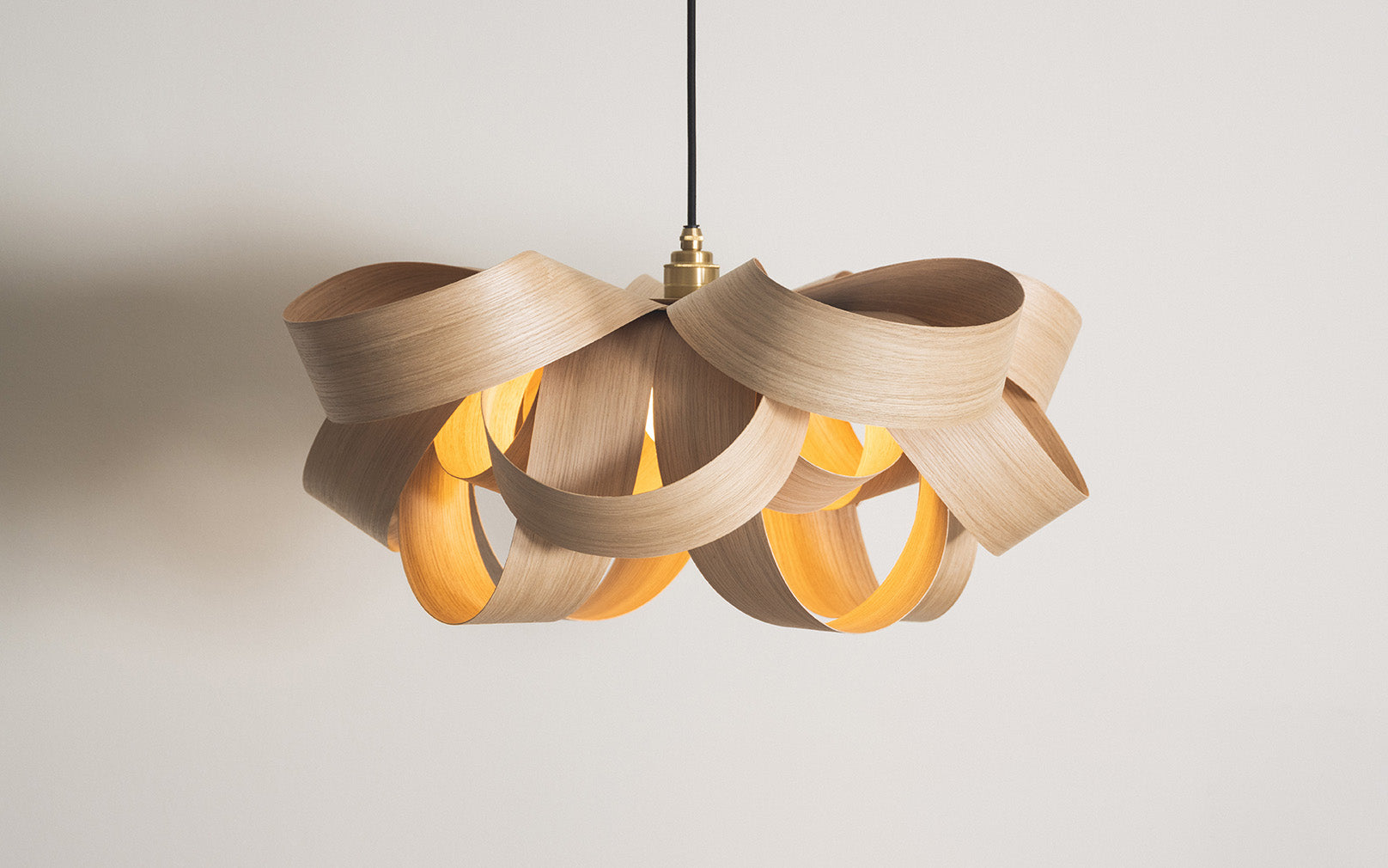 Hand curved from 16 lengths of sustainably sourced wood to provide an organic shape that emits a wonderful array of light and shadow. Creating a beautiful ornate centrepiece, this statement wooden lampshade hangs beautifully above a dining table, bed or create a welcoming radiance in your entranceway.