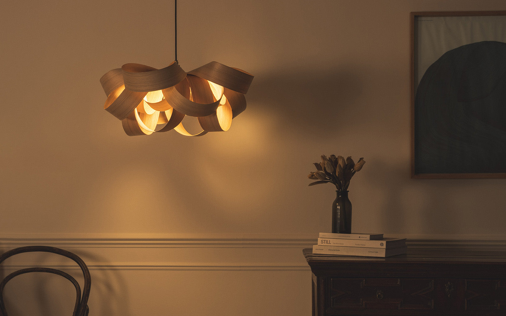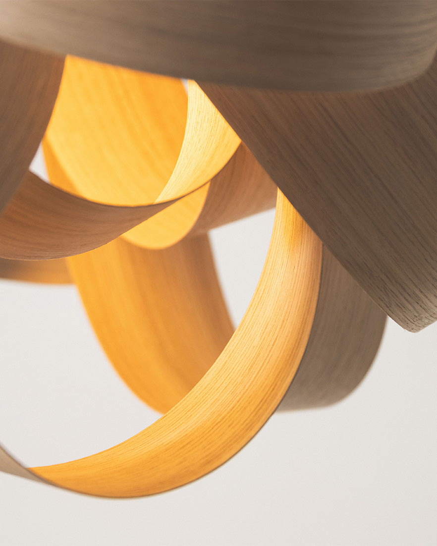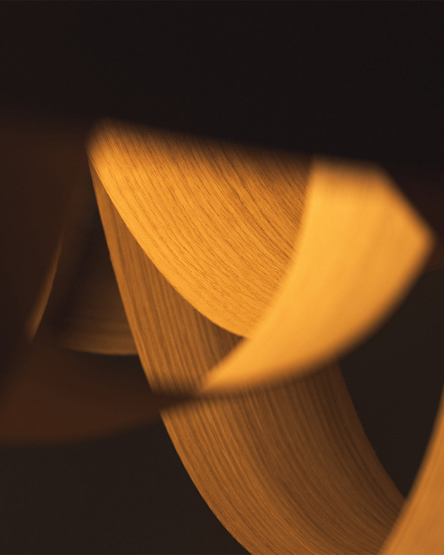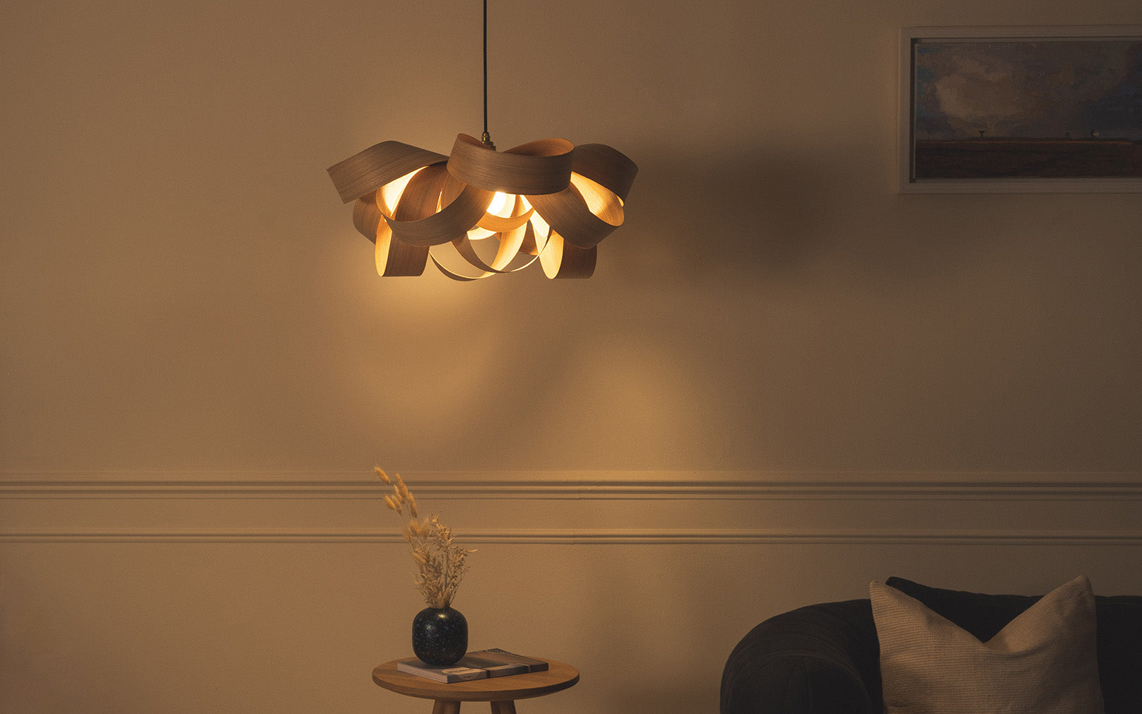 Hand curved from 16 lengths of sustainably sourced wood to provide an organic shape that emits a wonderful array of light and shadow. Creating a beautiful ornate centrepiece, this statement wooden lampshade hangs beautifully above a dining table, bed or create a welcoming radiance in your entranceway.