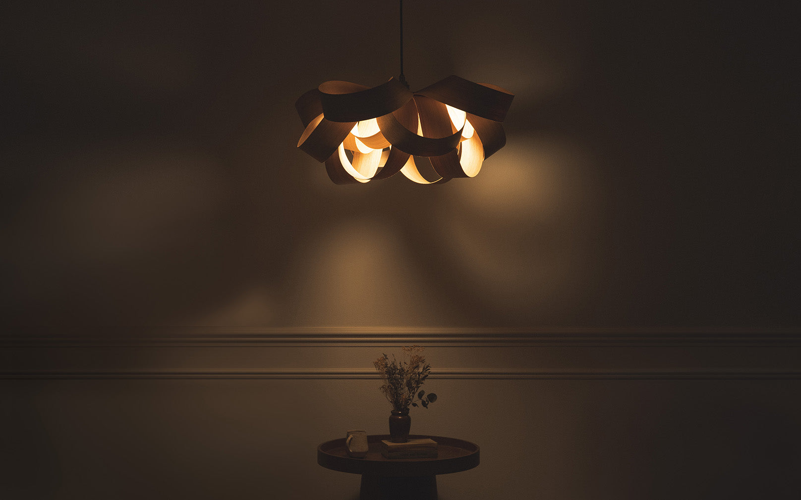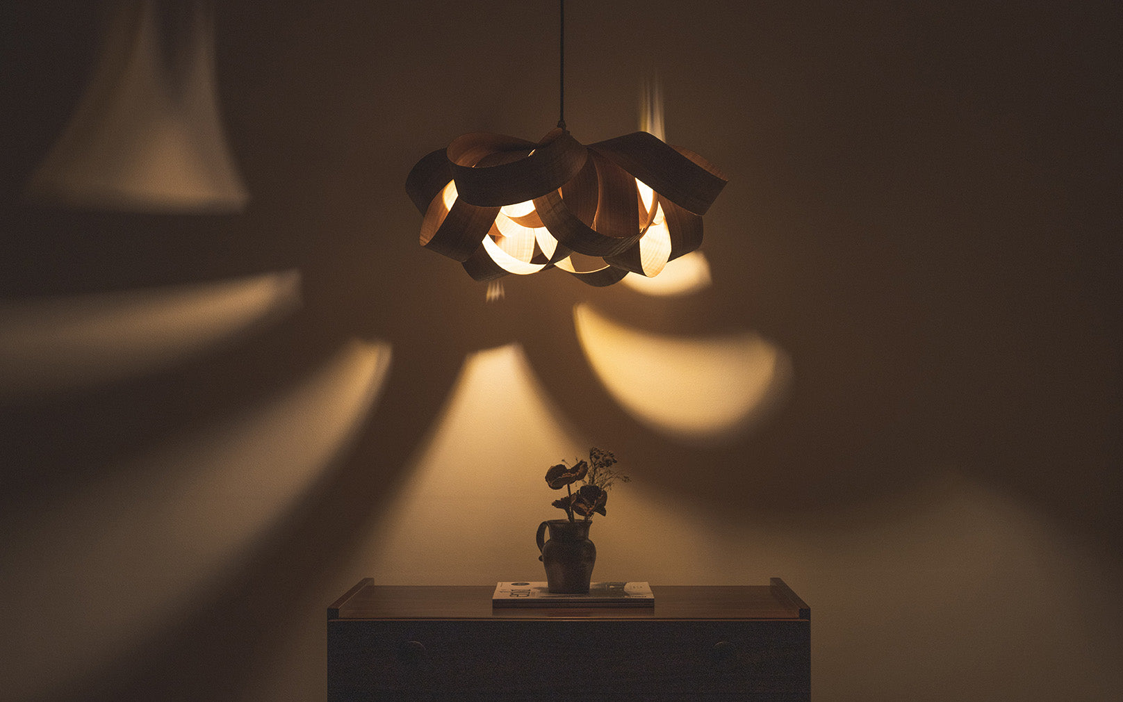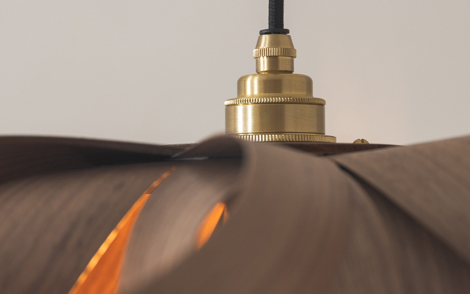 Hand curved from 16 lengths of sustainably sourced wood to provide an organic shape that emits a wonderful array of light and shadow. Creating a beautiful ornate centrepiece, this statement wooden lampshade hangs beautifully above a dining table, bed or create a welcoming radiance in your entranceway.