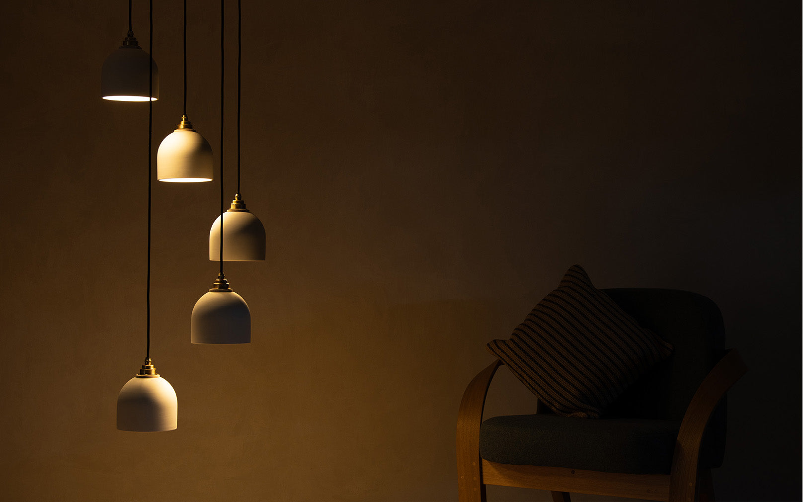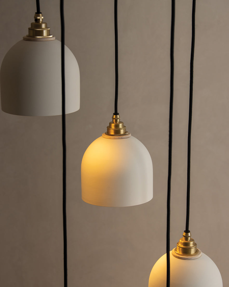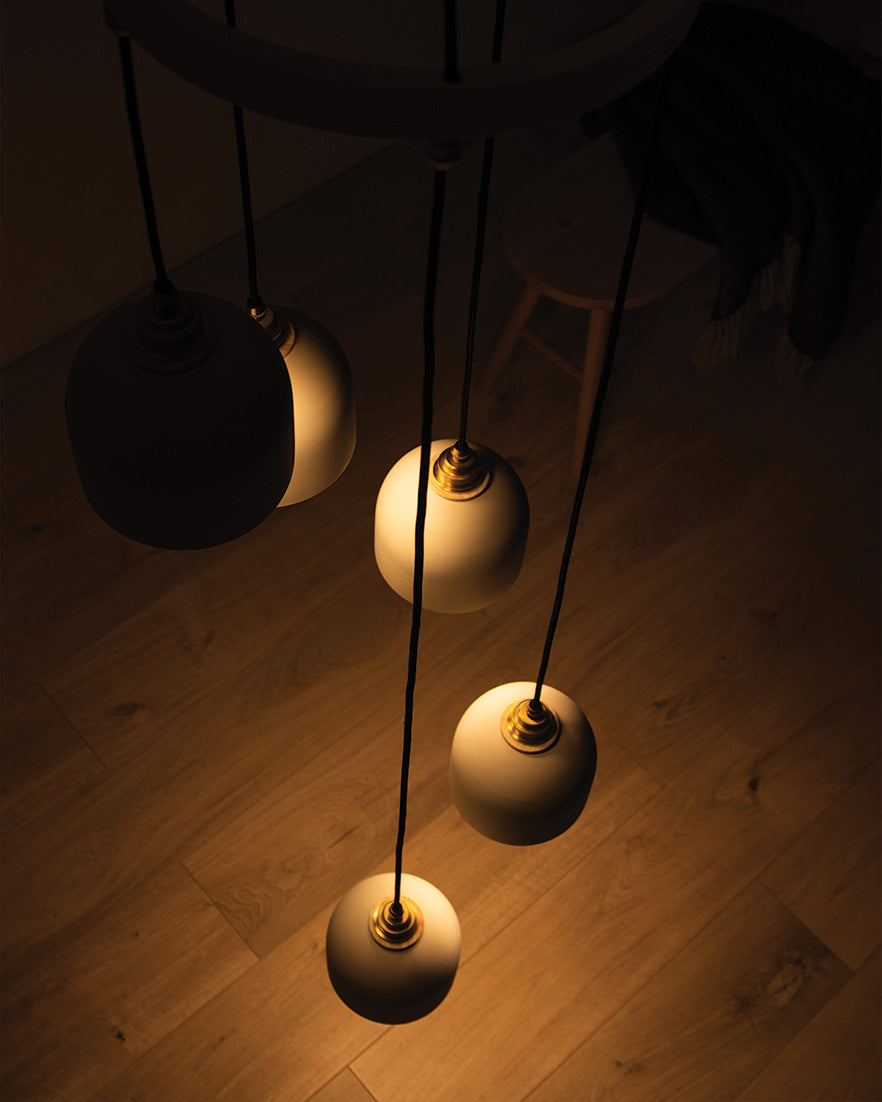 Five hand glazed, ceramic Bue Pendants cascade to cast a calming collection of warm spotlights upon your space. United by a steam bent, sustainably sourced, ash ring, the sleek lighting design showcases understated beauty through a neutral colour palette and minimalist profile. Perfect for creating a statement within entrances, stairwells and high-ceiling spaces, the modern chandelier complements an array of interiors.