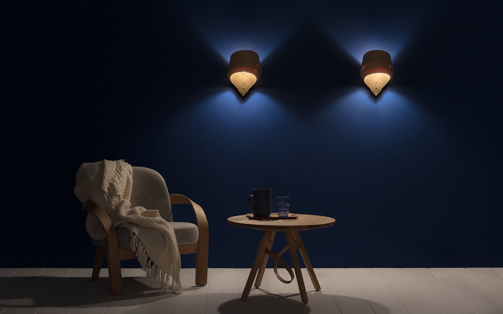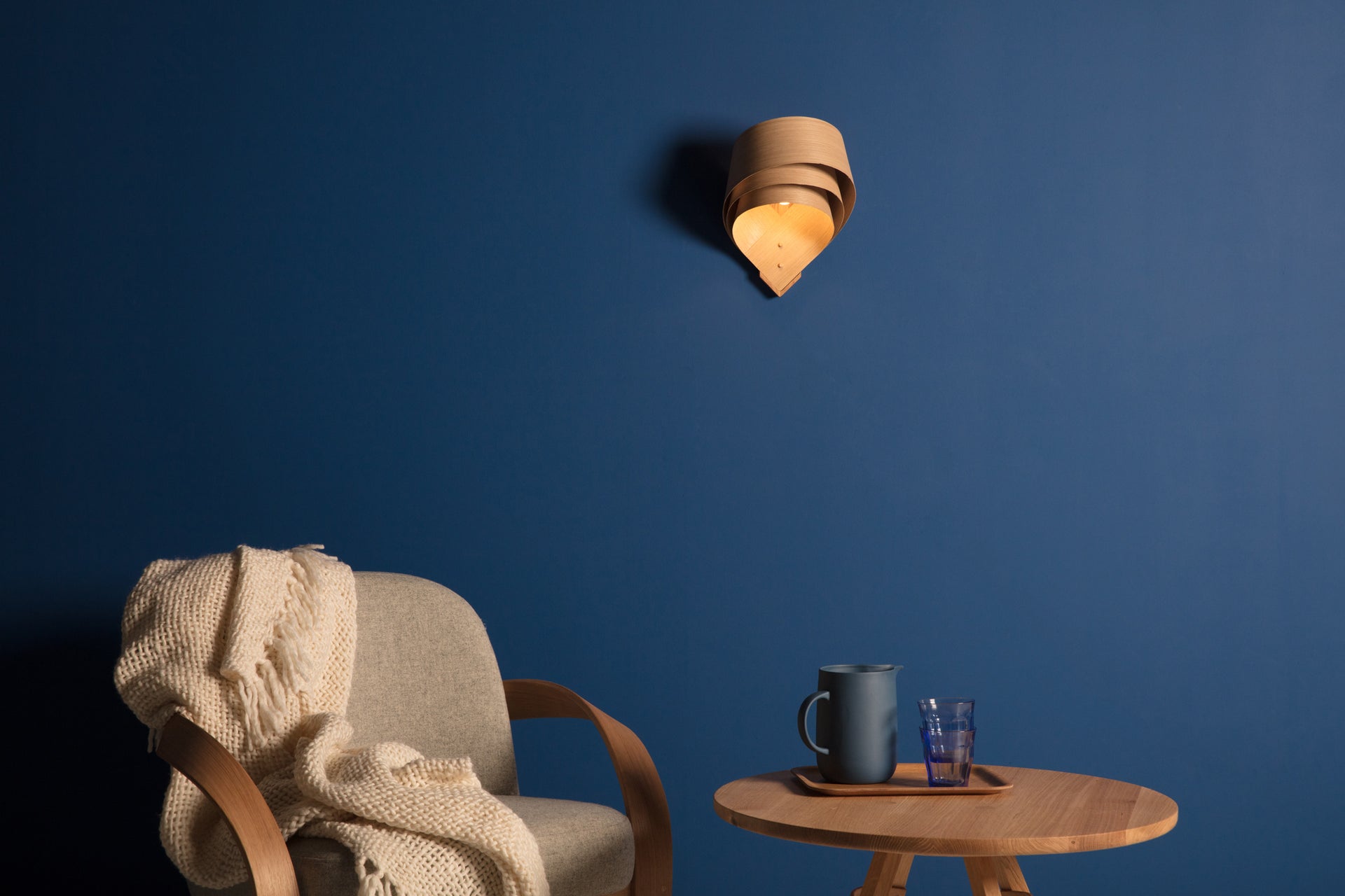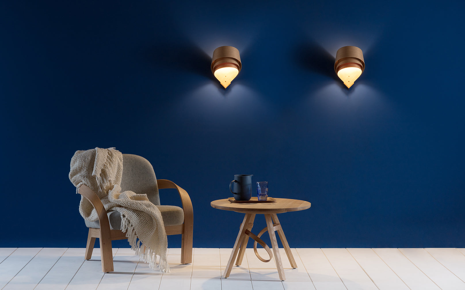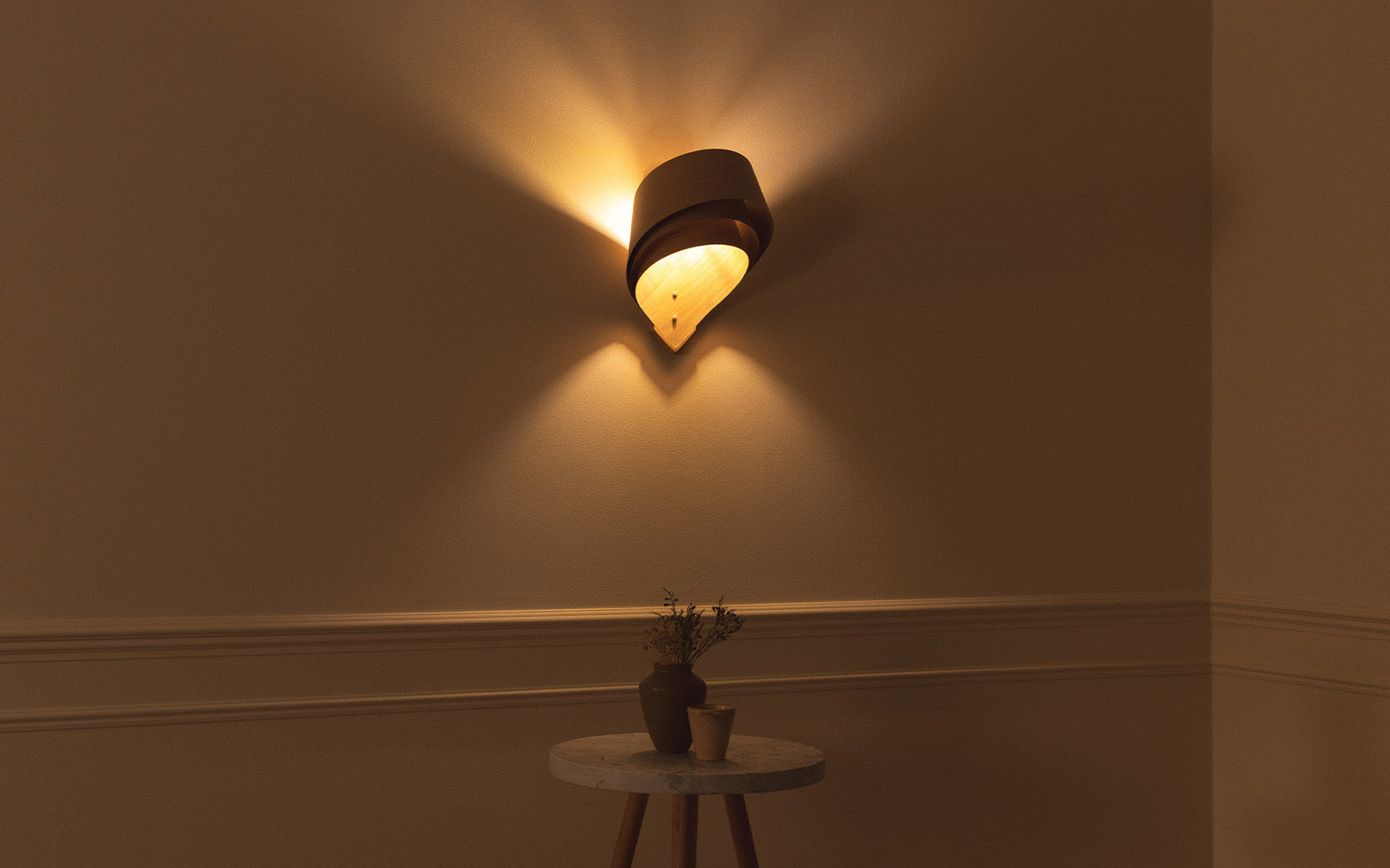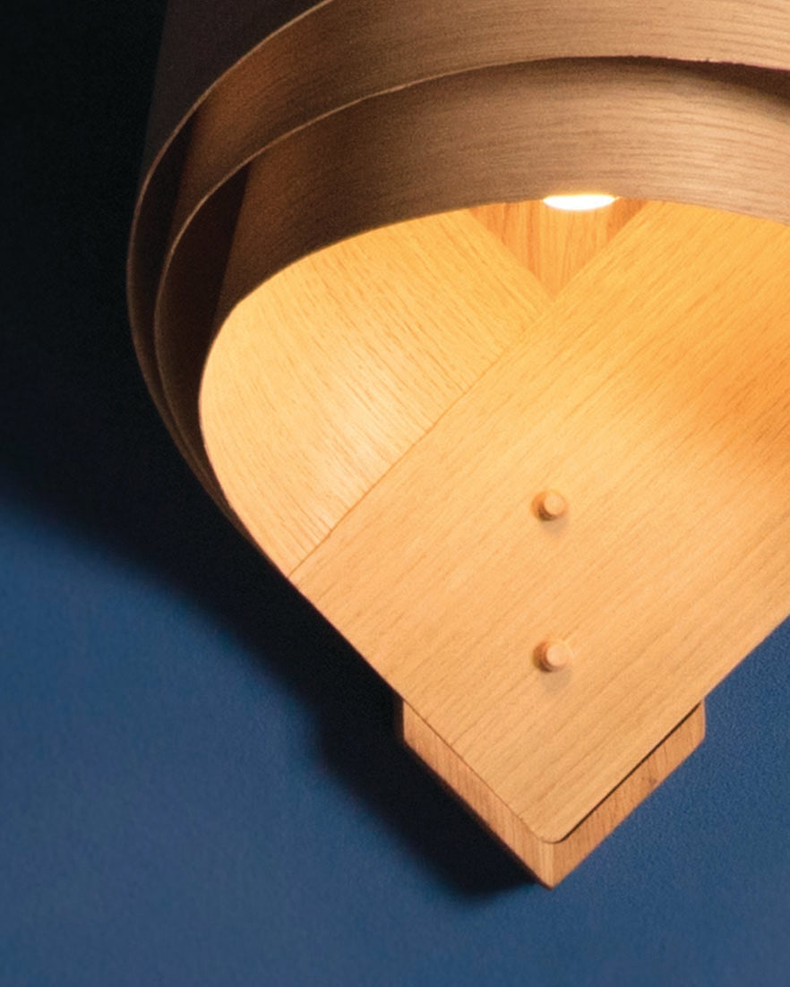 Handcrafted timber peaks and barrels. In its folds, light gathers and shadows are cast, creating focus and atmosphere. Sustainably sourced ash, oak or walnut loop in layers to compliment, emphasise or elevate the space it claims.