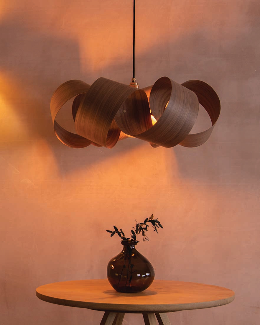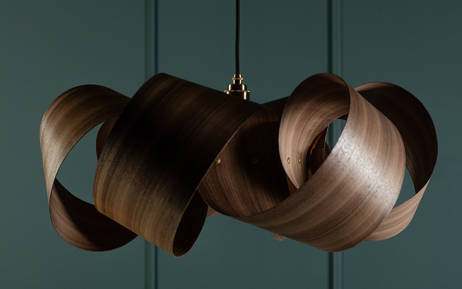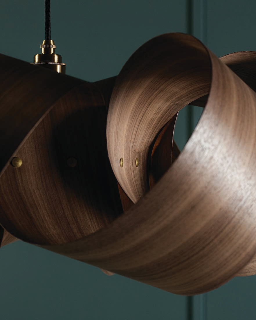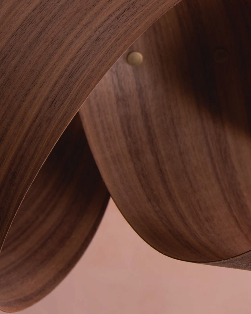 Six swells of sustainable, steam bent oak or walnut wood rise up and flow in undulating grace to create the Drift Pendant. Interwoven and underpinned by brass rivets to a striking central structure of seasoned plywood, each hand crafted timber wave bends to mesmerise and delight. Casting shadows that seamlessly float and settle in buoyant tranquillity, the Drift Pendant creates a light show that disperses softly; rippling, cresting and breaking around the room, then pooling in tidal calm.
