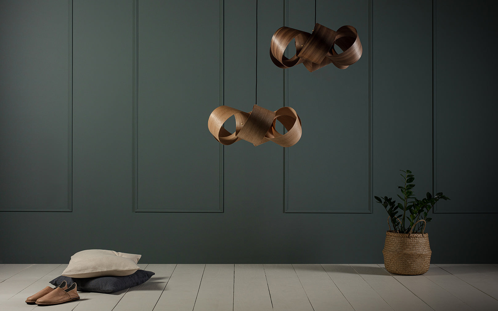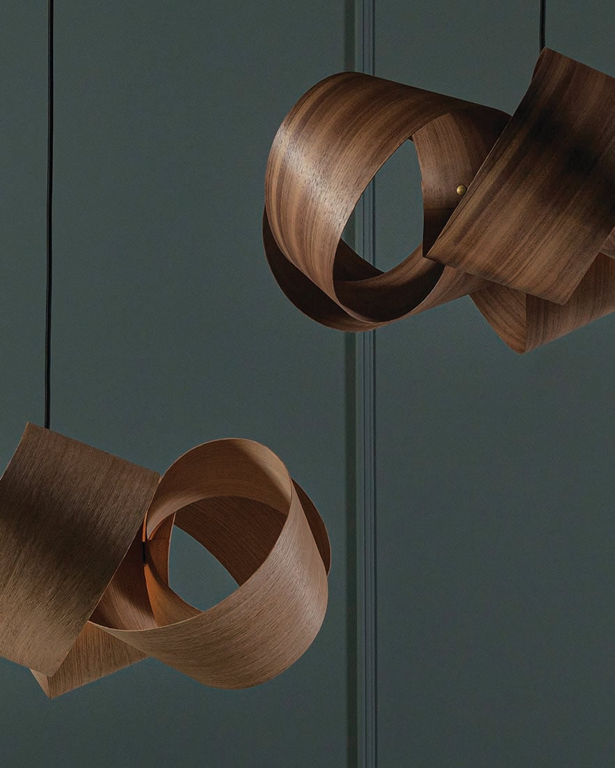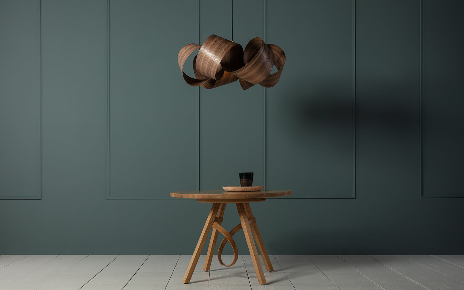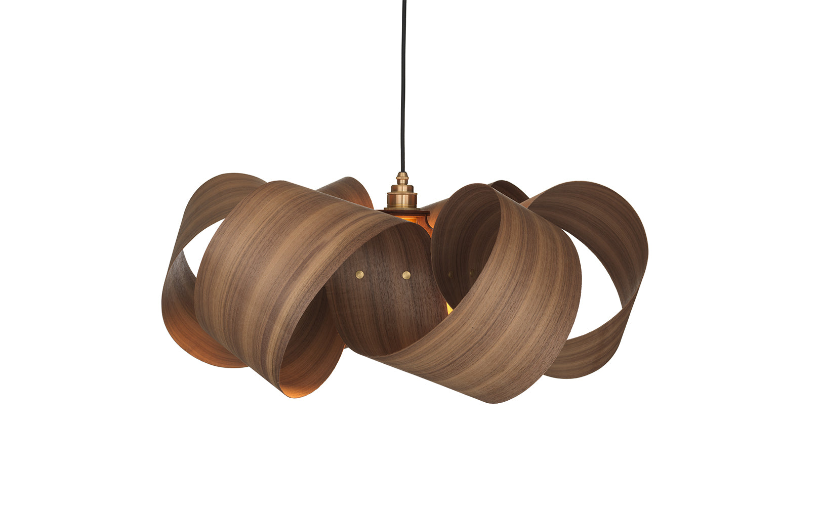 Six swells of sustainable, steam bent oak or walnut wood rise up and flow in undulating grace to create the Drift Pendant. Interwoven and underpinned by brass rivets to a striking central structure of seasoned plywood, each hand crafted timber wave bends to mesmerise and delight. Casting shadows that seamlessly float and settle in buoyant tranquillity, the Drift Pendant creates a light show that disperses softly; rippling, cresting and breaking around the room, then pooling in tidal calm.