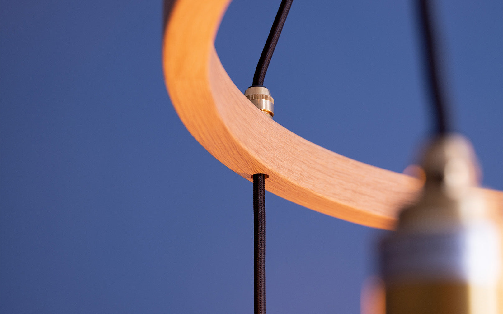 Minimalist design at its most powerful, the Kern's bold confidence belies its complexity. Demanding precision, strength and craftsmanship to achieve its smooth circumference, the result is modern, architectural, powerful. With exposed flex tethering five bulbs to its sustainably sourced oak frame, the Kern starts a new chapter in lighting design. Igniting conversation, this wooden ceiling design is well suited to friendly dining spaces and welcoming entranceways.