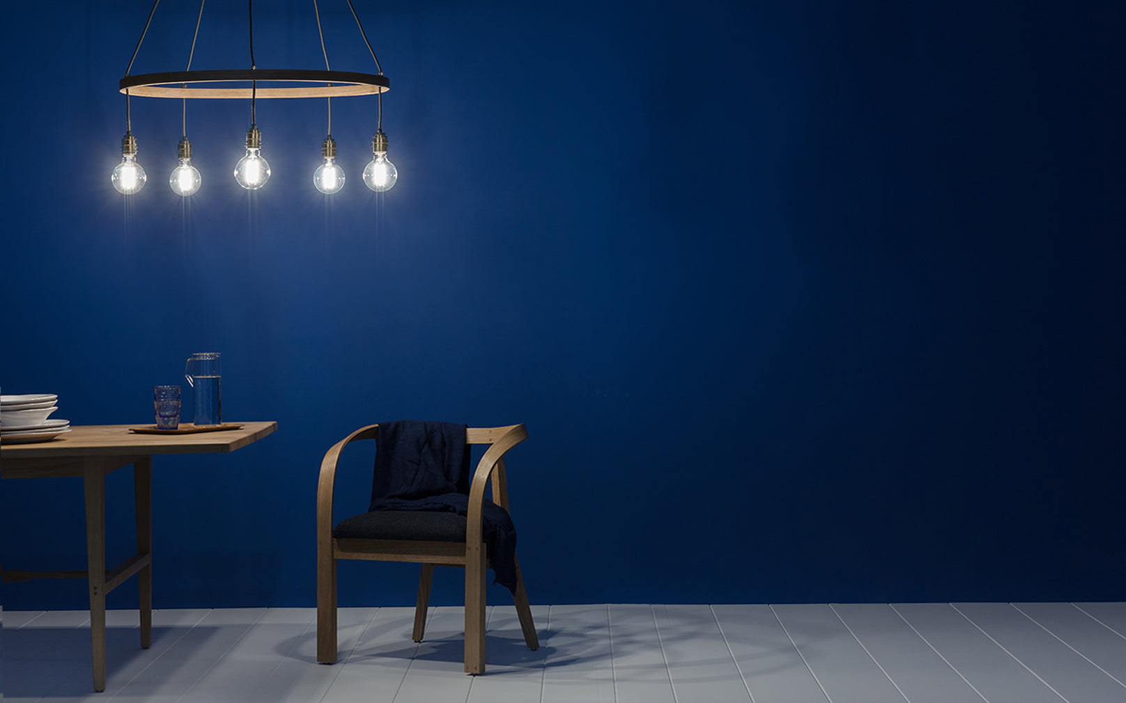 A steam bent hoop of solid oak suspended, filament bulbs laid bare. Striking, pure and clean, the Kern redefines the chandelier.