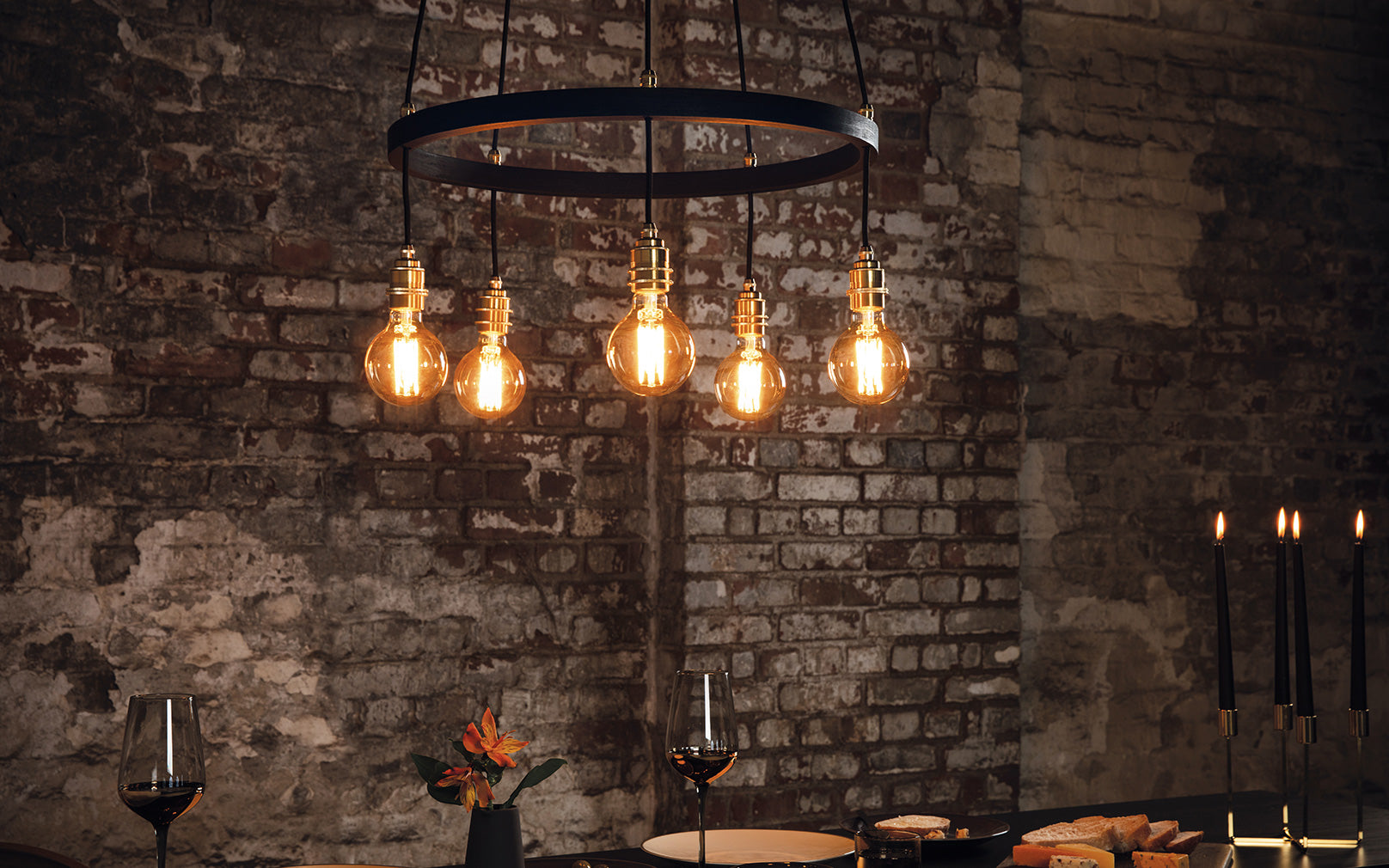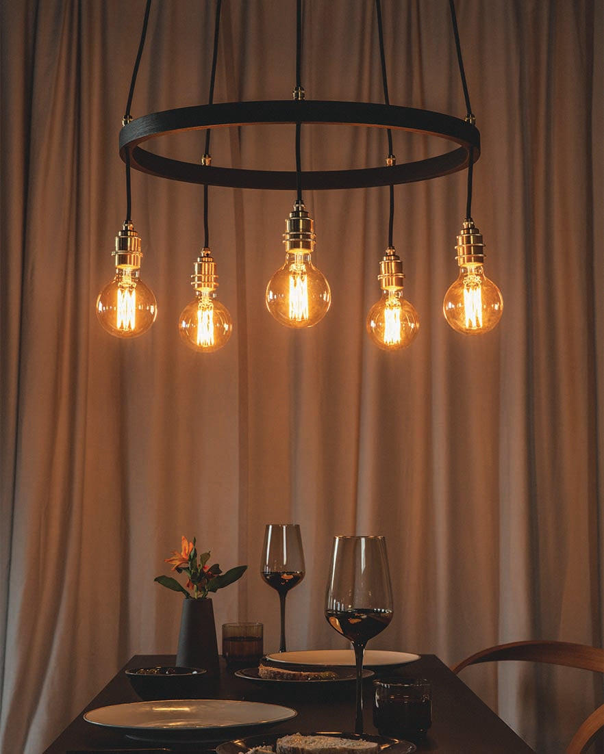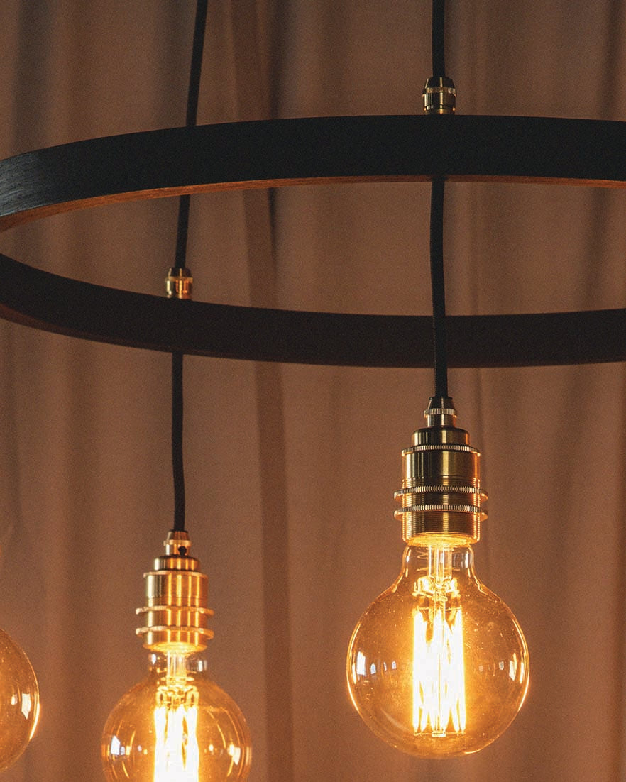 The Kern’s minimalist, steam bent shape takes on a sleek new identity. Demanding precision, strength and craftsmanship to achieve its smooth circumference, the result is modern, architectural, powerful. With exposed flex tethering five bulbs to its ebonised oak frame, the Kern ensures your space is remembered.