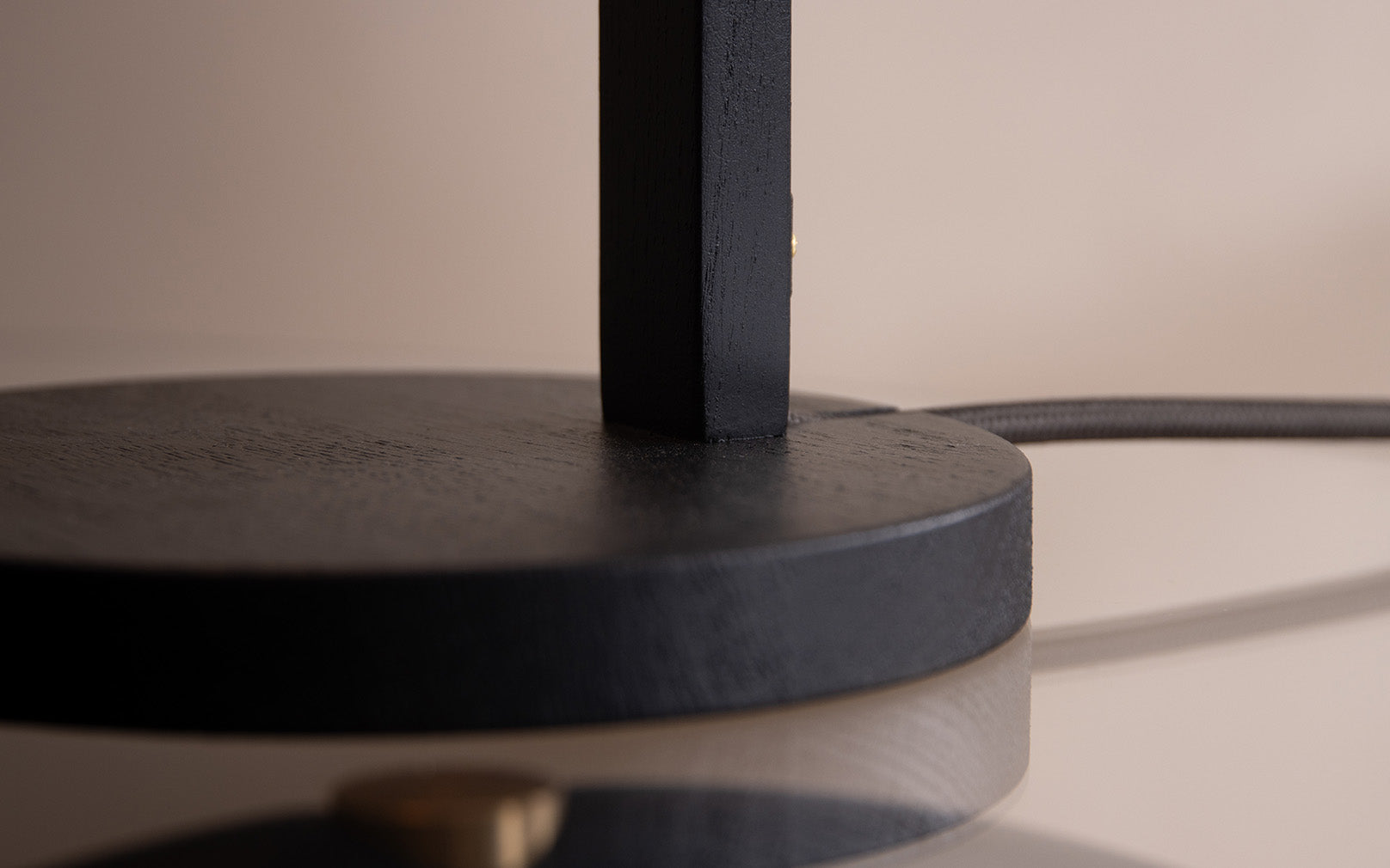 Modern. Refined. Enticing. An arching curve of steam bent, black ebonised oak towers up from a robust circular base, to showcase an exposed bulb which casts a boundless glow. Use the statement Noctis Mooring Table Light to restore calm within bustling kitchens, hallways or living spaces. This minimalist wooden table light puts the lustre back in illumination and brings sophistication into any space.