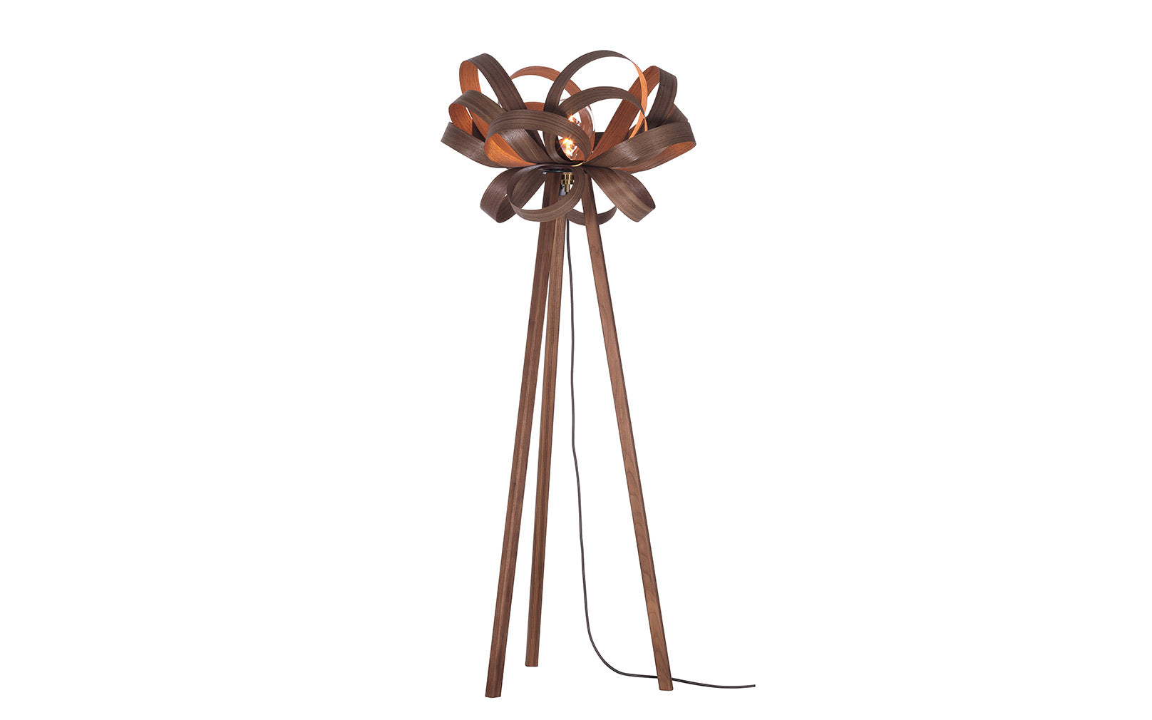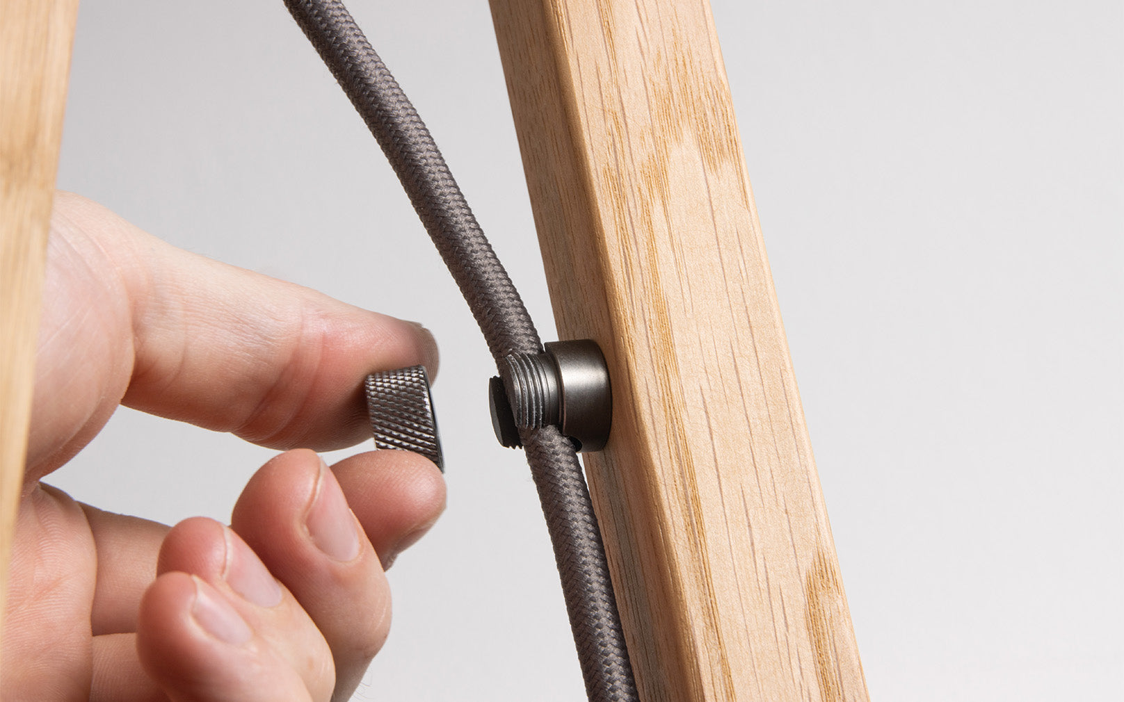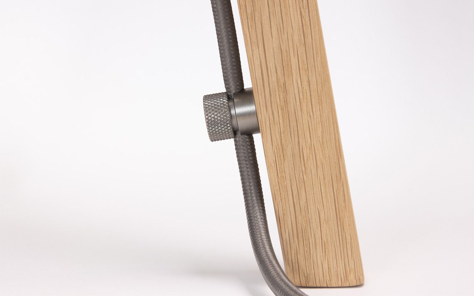 Main materials: Sustainably sourced oak or walnut. Brass lamp holder. Grey fabric flex with inline foot switch