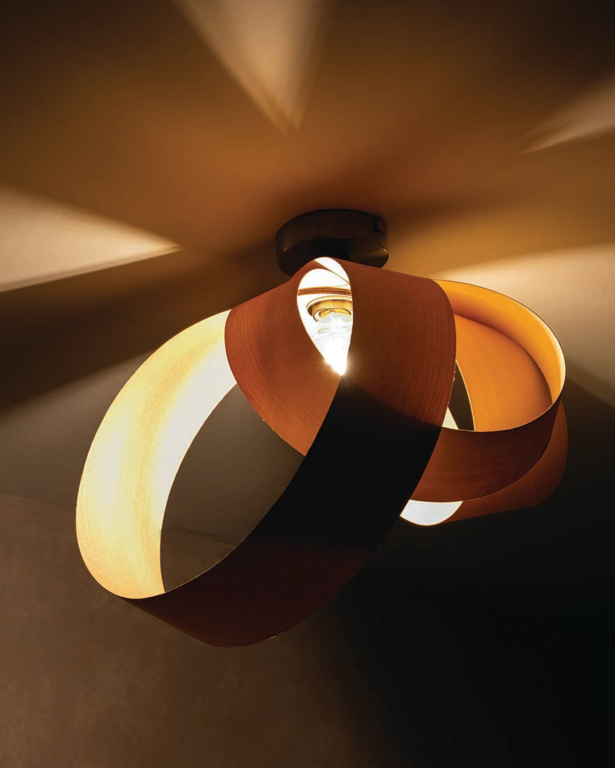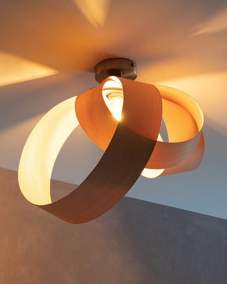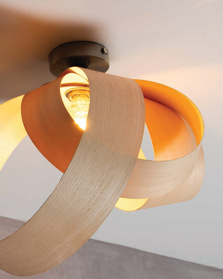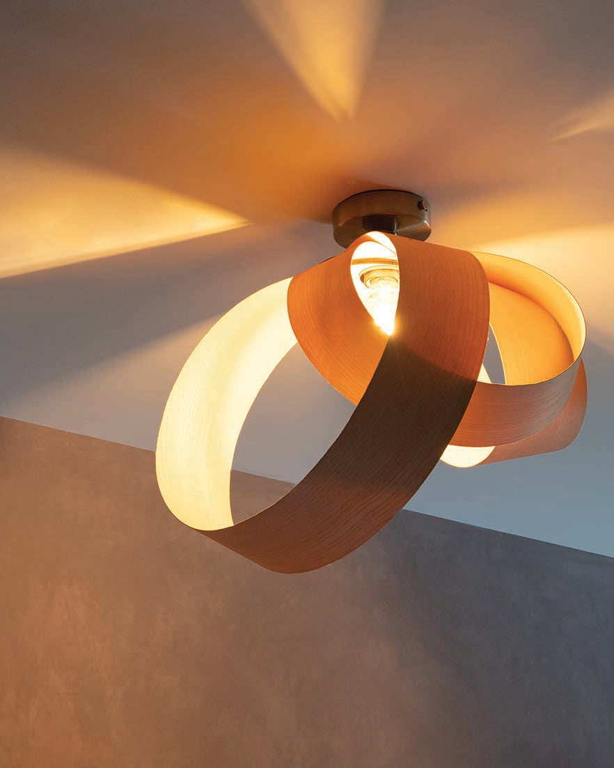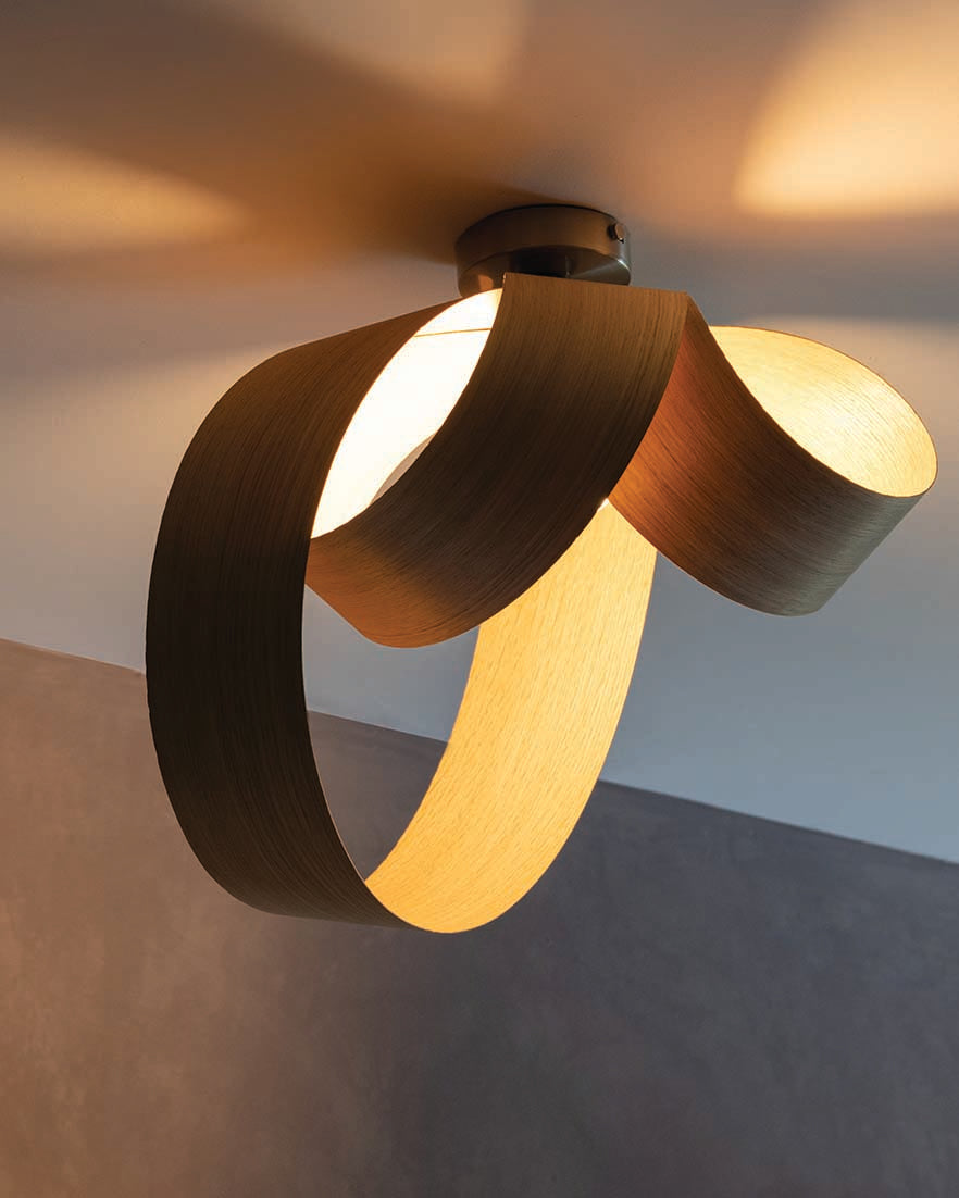 Looping to create eye-catching asymmetry, the Verso Flush Ceiling Light is cleverly crafted from one continuous length of sustainably sourced timber that soars around the warm glow of an exposed bulb to cast a beautiful blend of light and shadow across hallways, living spaces and bedrooms alike. Igniting creativity within your space, the Verso Range looks different from every angle and exhibits its varying form to add playful personality to a wide range of interiors.