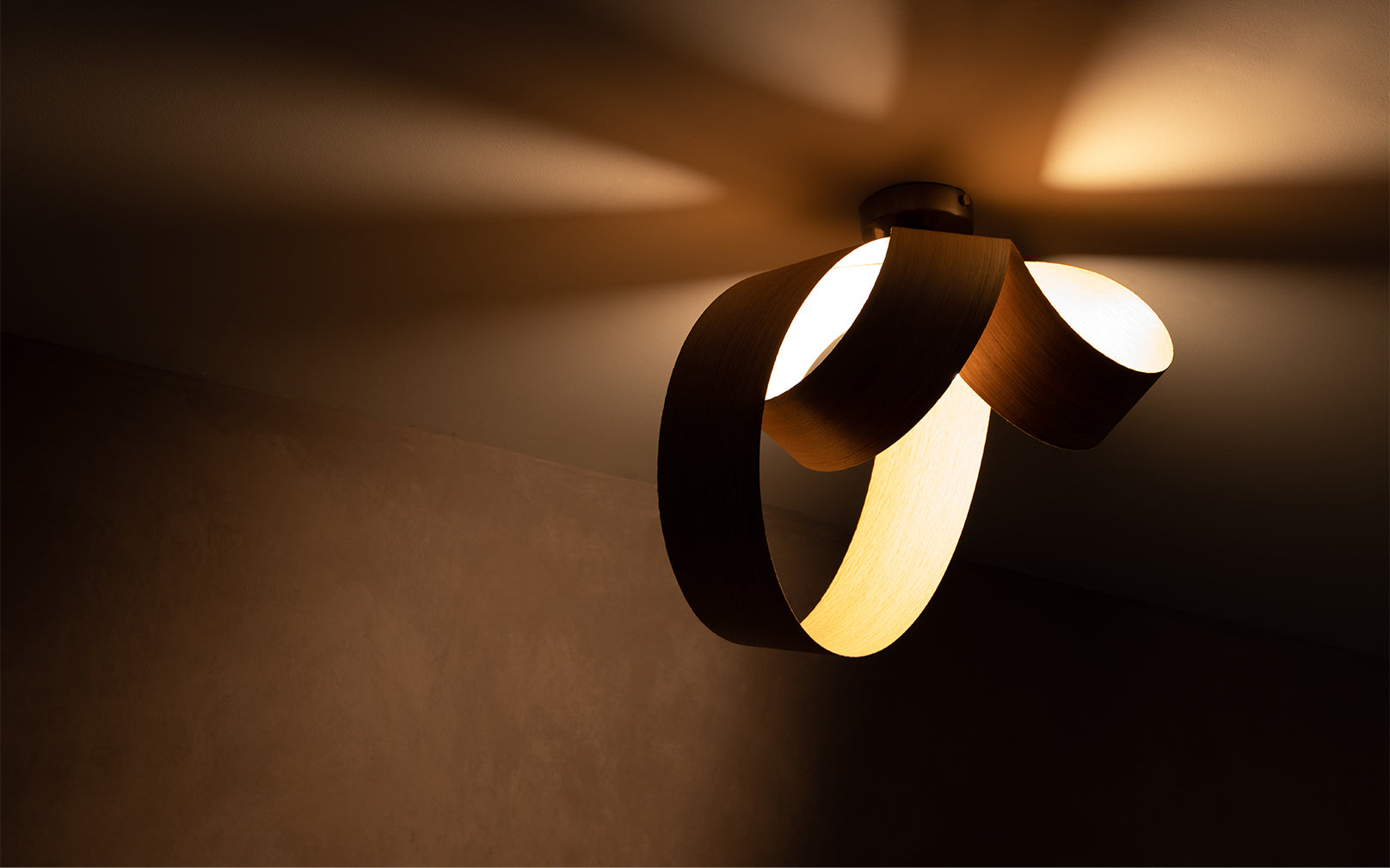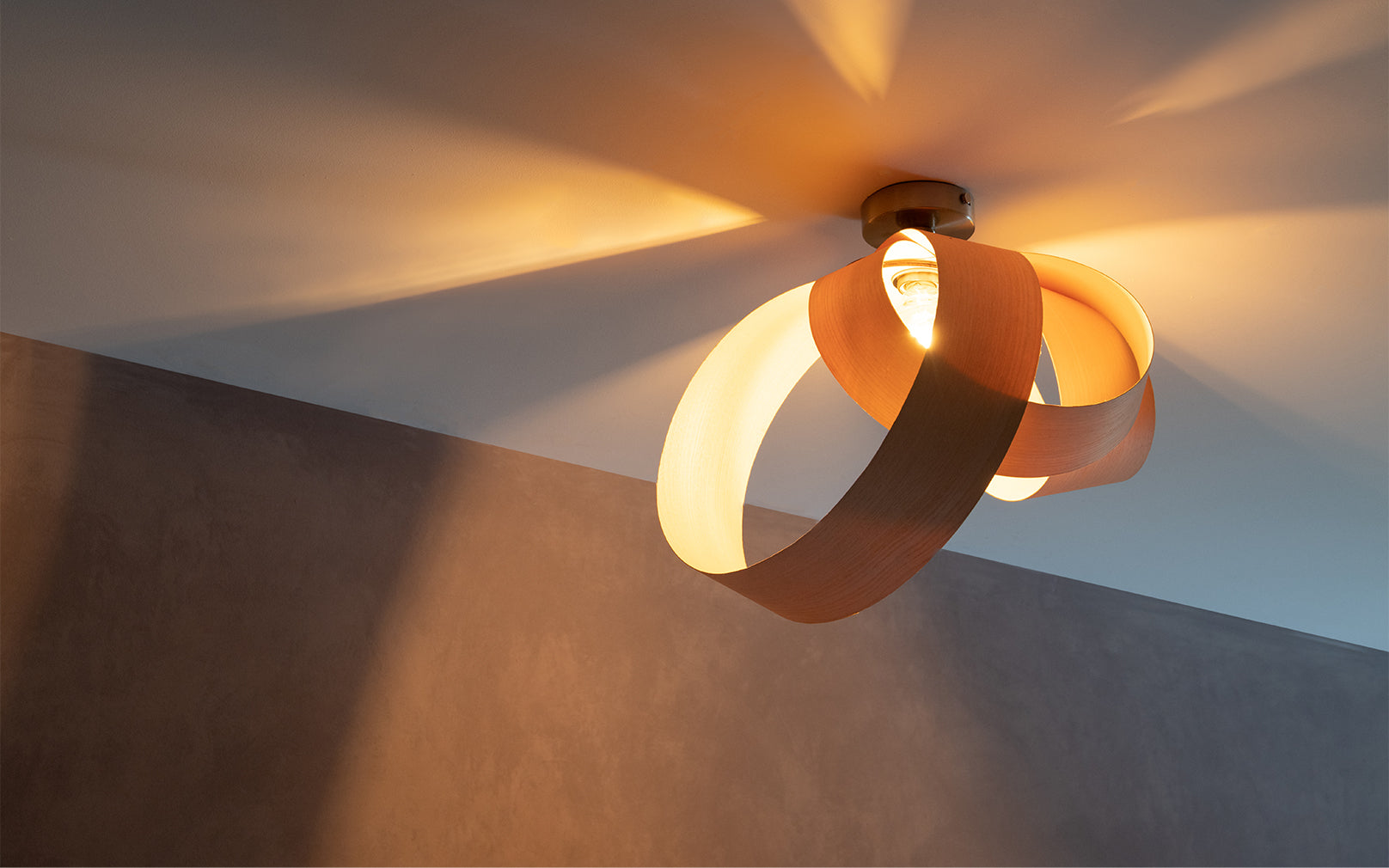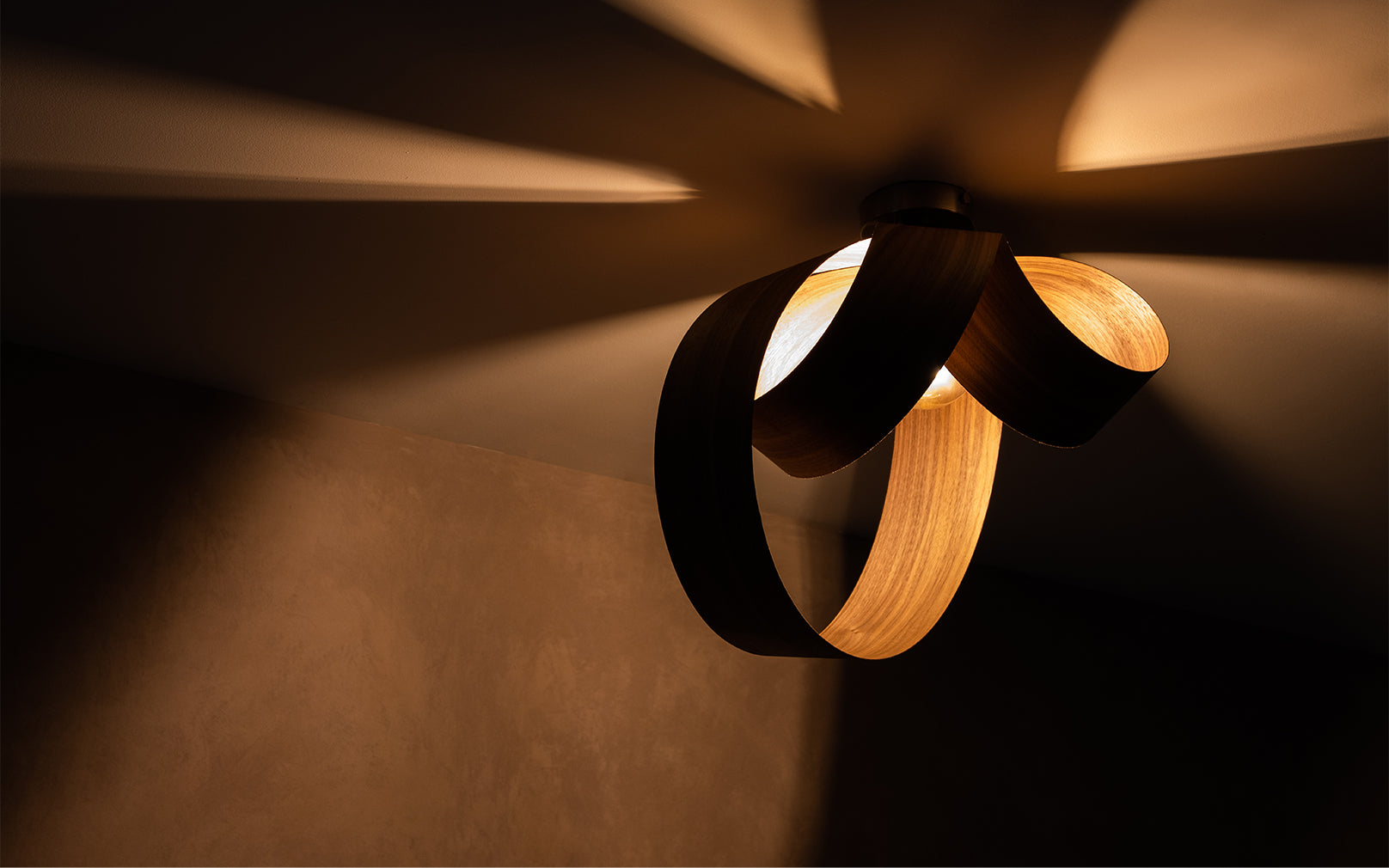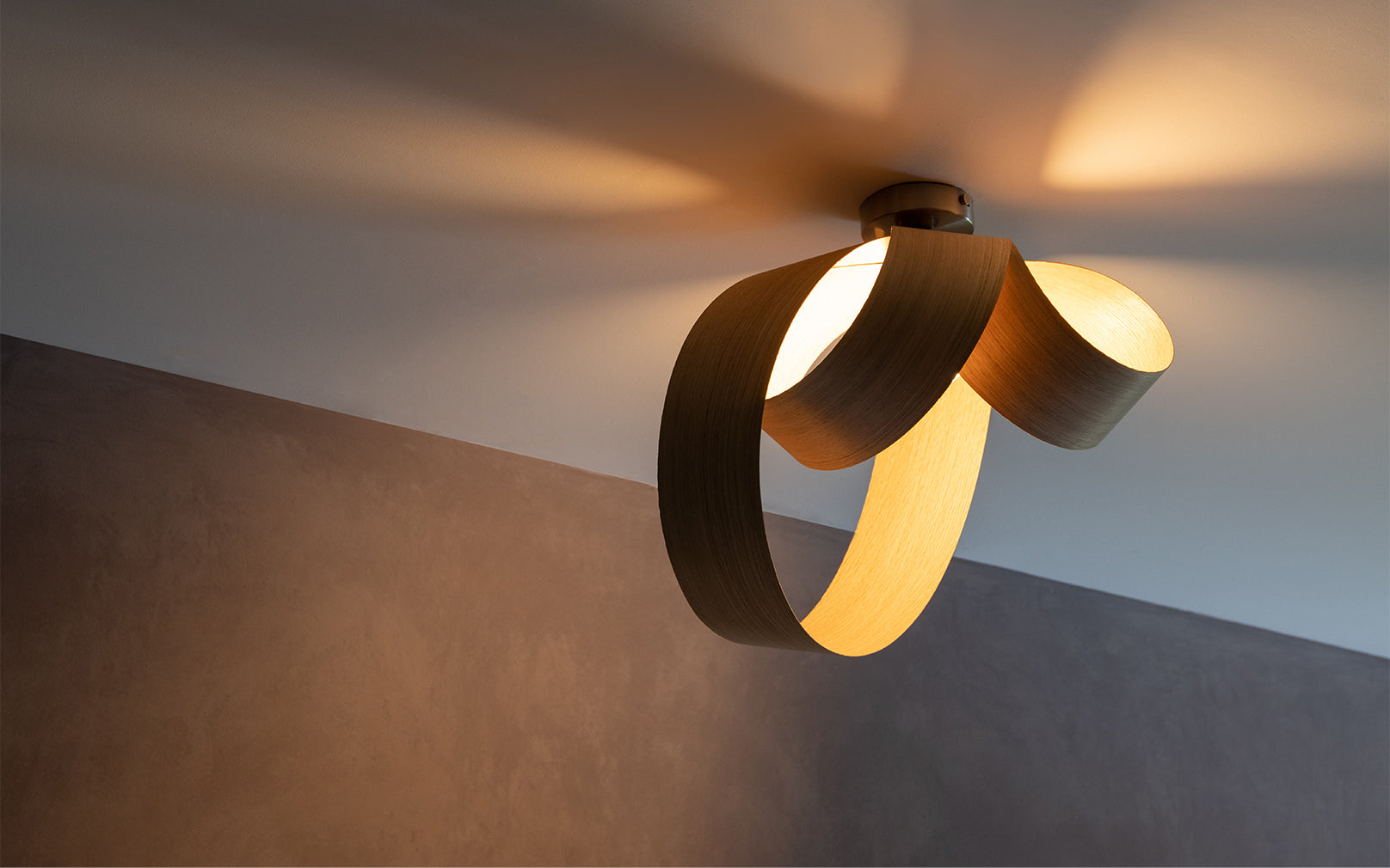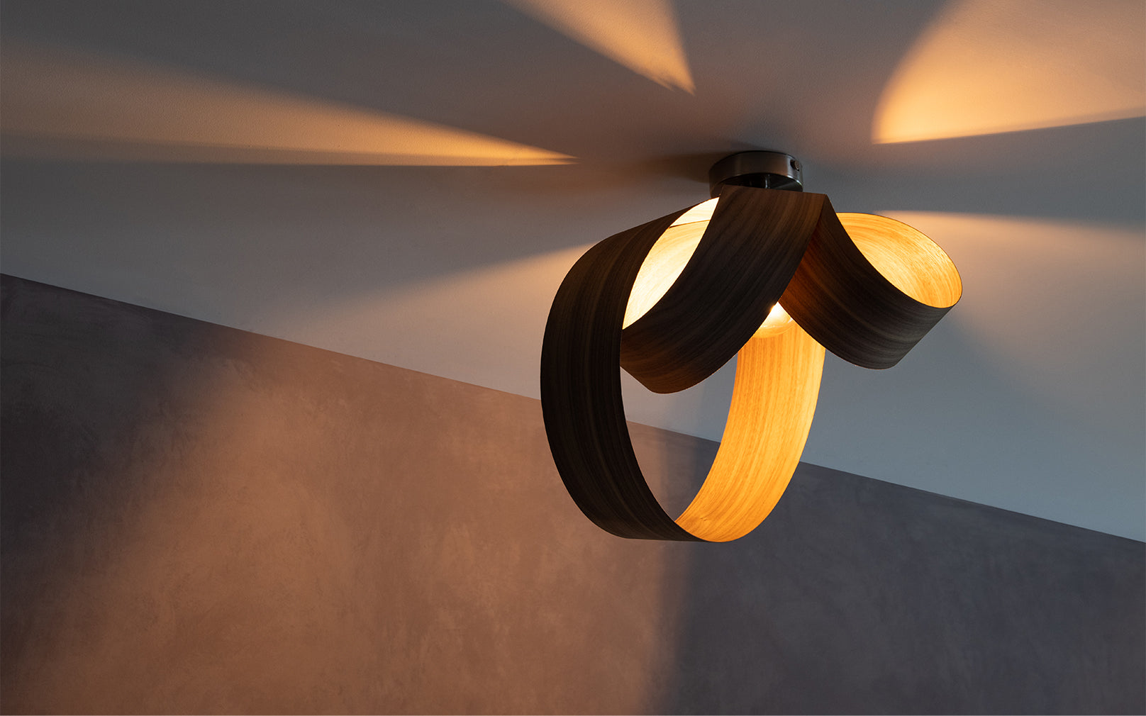 Looping to create eye-catching asymmetry, the Verso Flush Ceiling Light is cleverly crafted from one continuous length of sustainably sourced timber that soars around the warm glow of an exposed bulb to cast a beautiful blend of light and shadow across hallways, living spaces and bedrooms alike. Igniting creativity within your space, the Verso Range looks different from every angle and exhibits its varying form to add playful personality to a wide range of interiors.