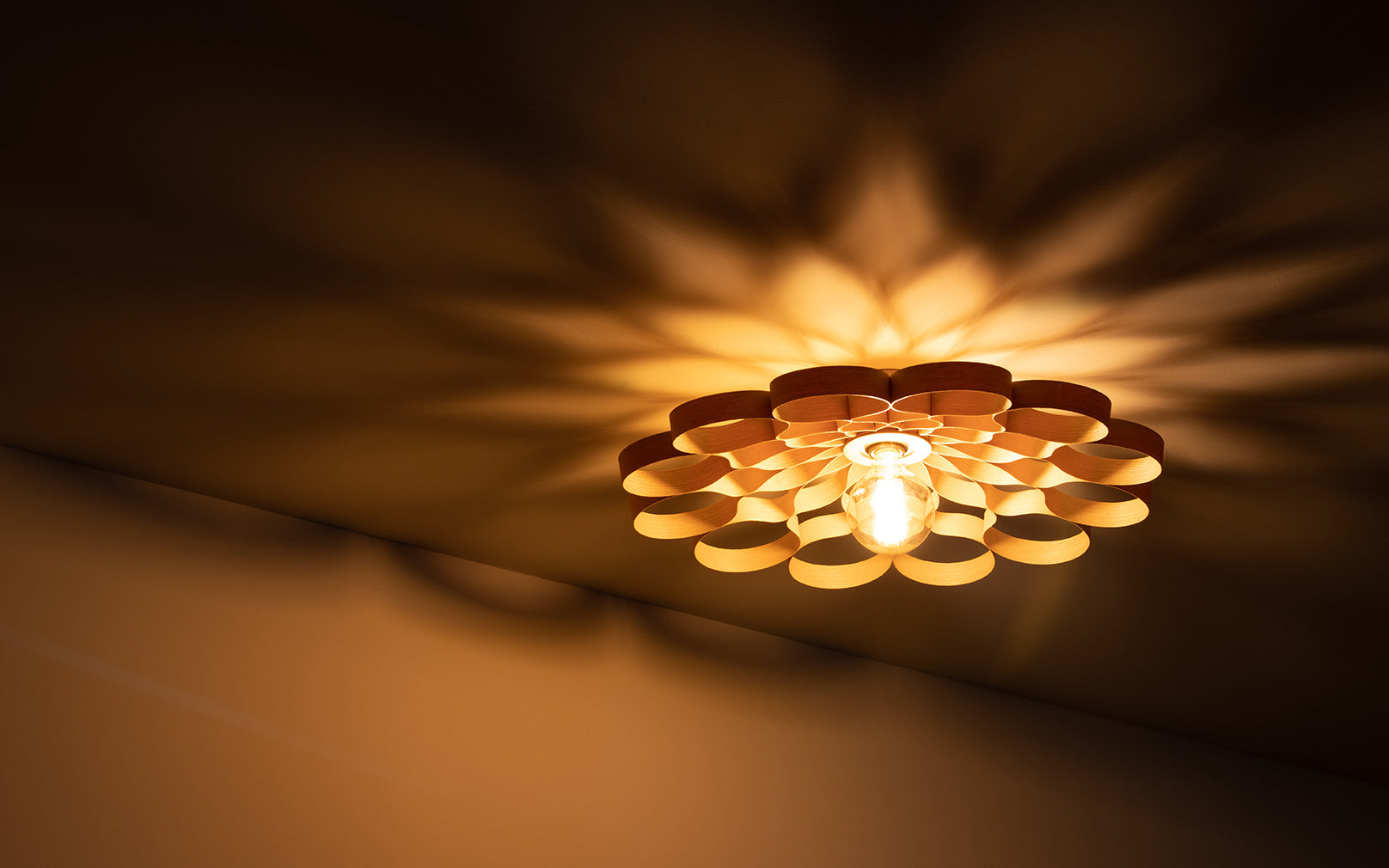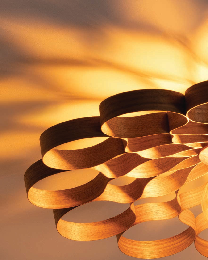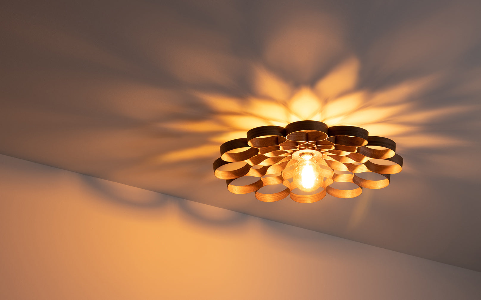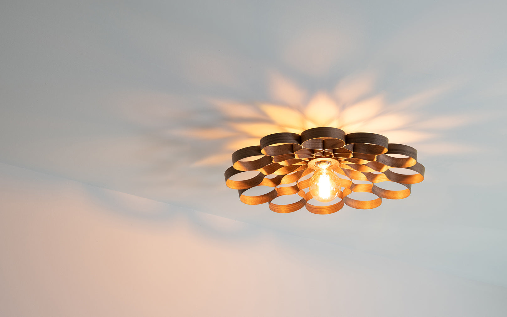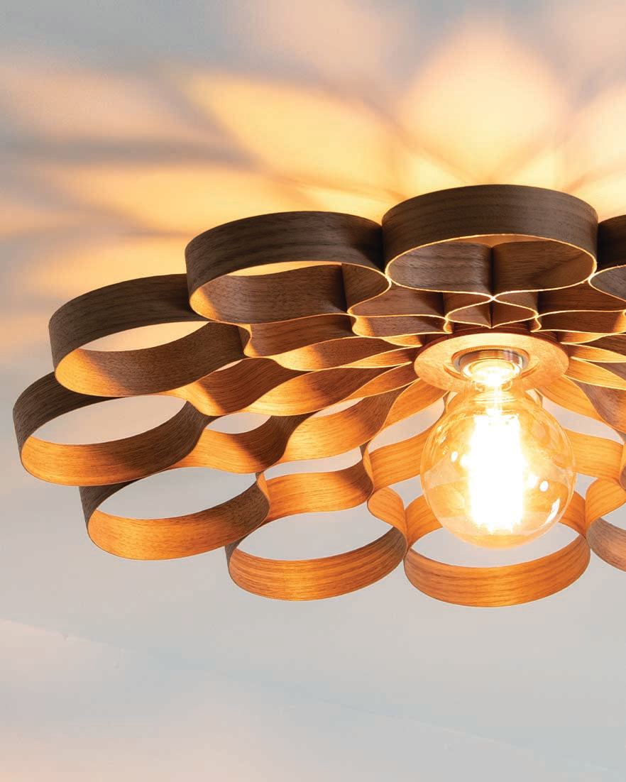 Switched on or off, the eye catching, organic form of the Arame Small Flush Ceiling Light creates an extraordinary spectacle in your space. With a shallow silhouette made up of twelve oscillating ash or walnut timber petals, the Arame’s steam bent core produces a diffused golden glow when illuminated. Perfect for interiors with low ceilings and bedroom or living spaces calling out for a feature lighting piece.