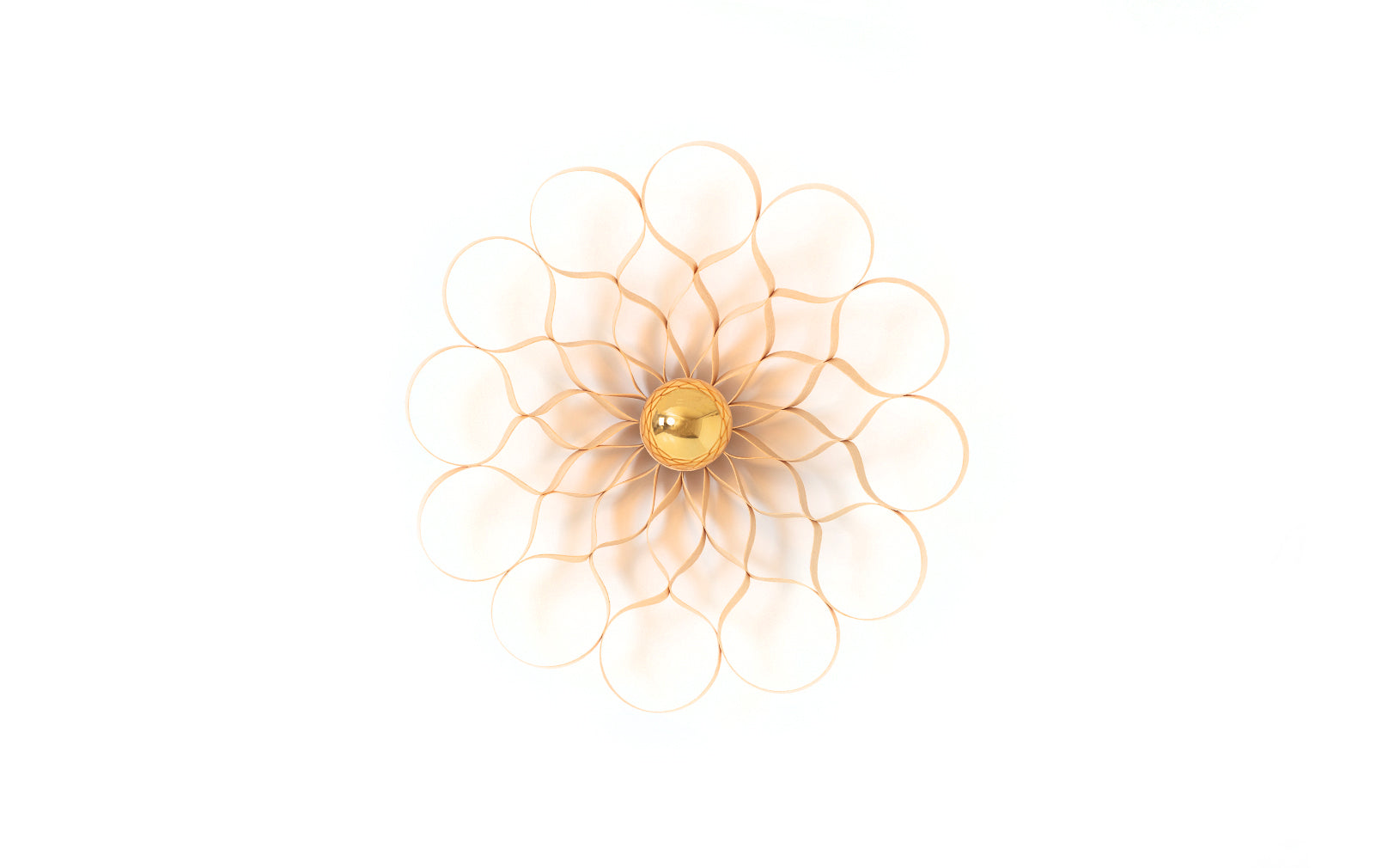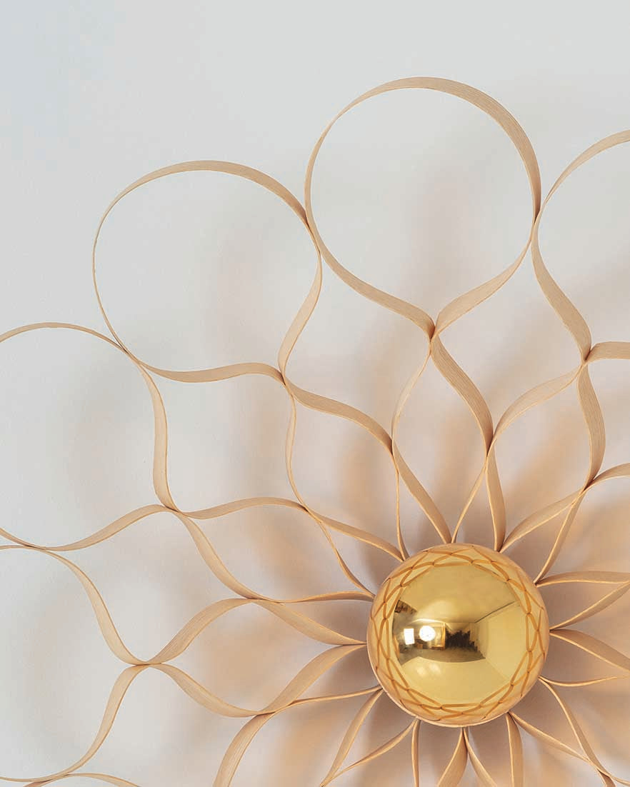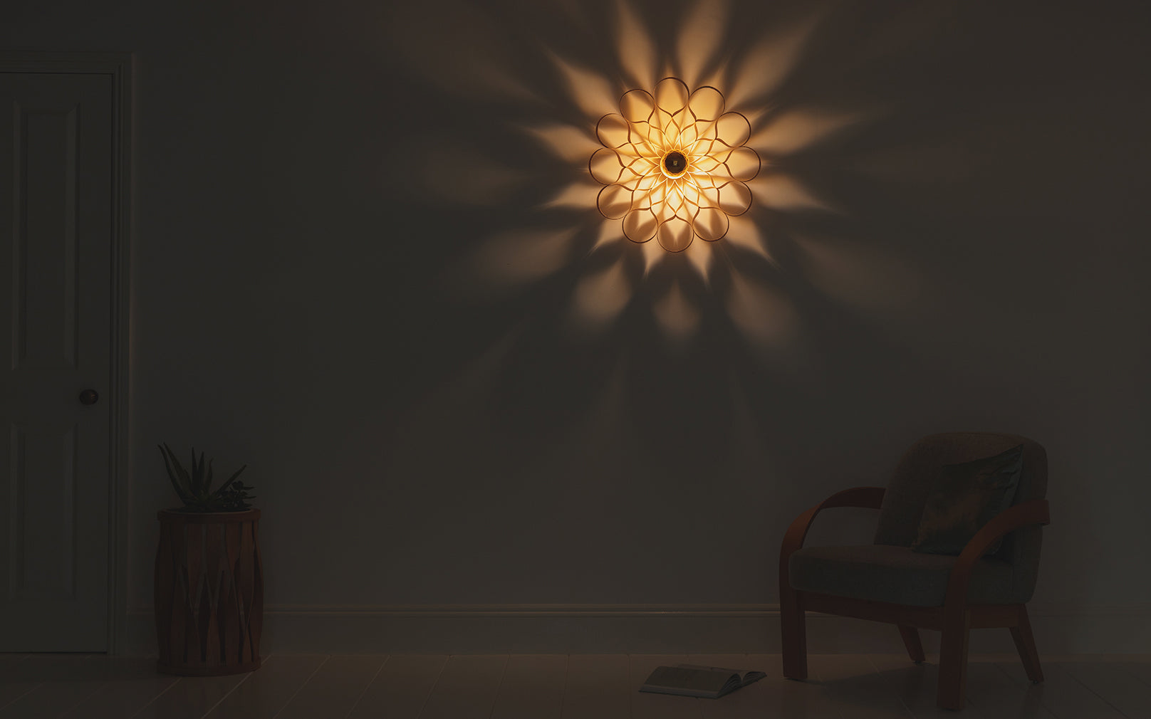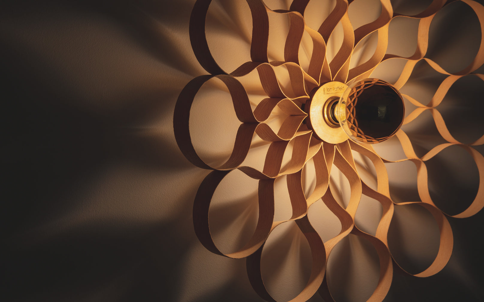 Elemental, geometric, sequential. A surge of optical energy; a silhouette of sustainable craftsmanship. Switched on or off, boundless shadows unfurl, pirouette and tumble in kaleidoscopic tessellation creating an extraordinary spectacle in your space. When illuminated, an abundance of golden glow diffuses from the Arame's steam bent core - casting an aura of light that's truly transfixing.