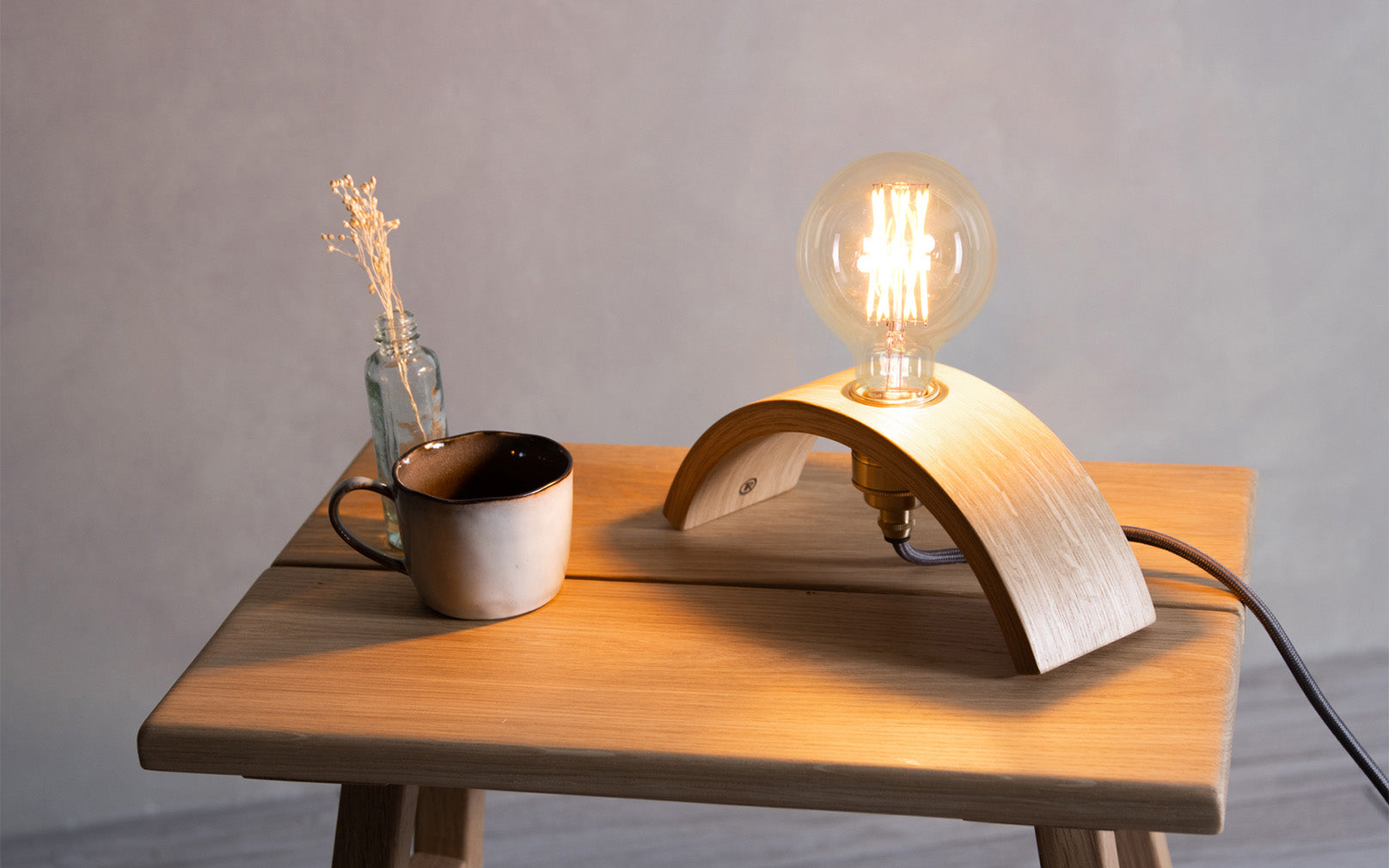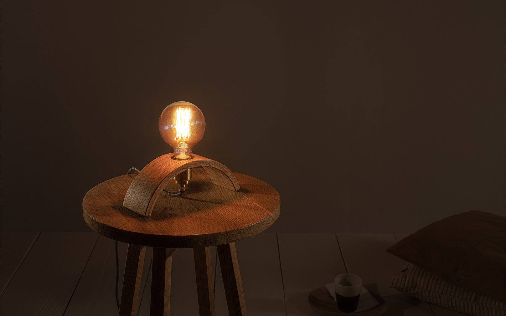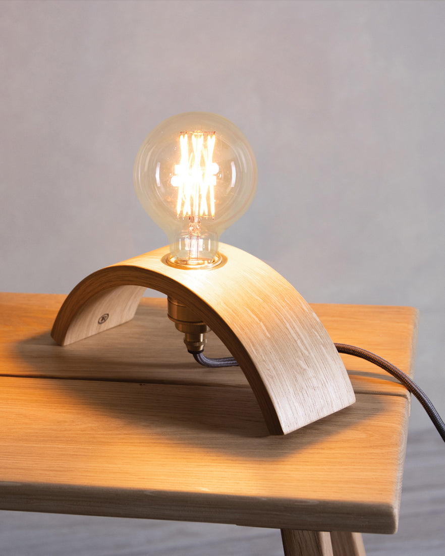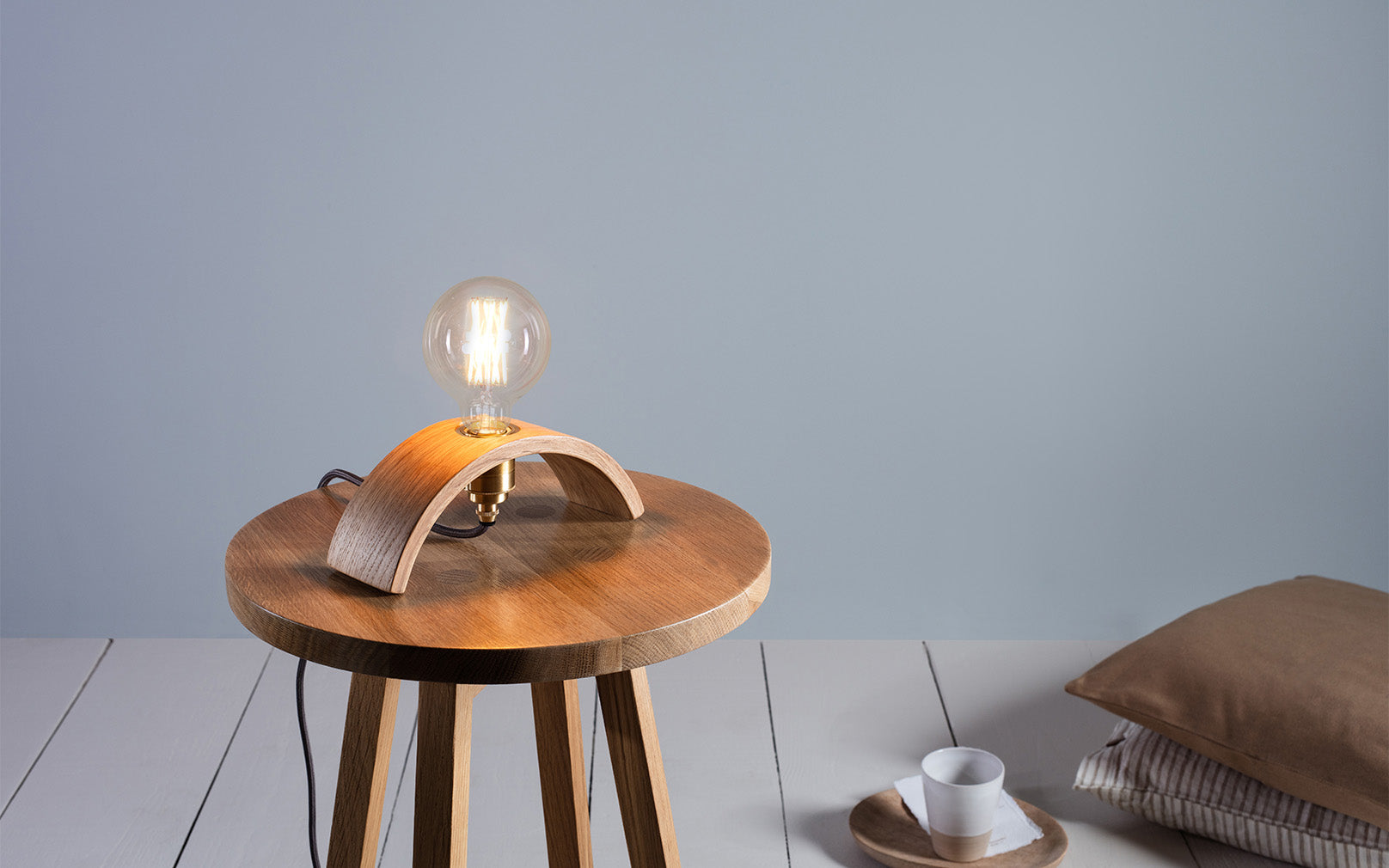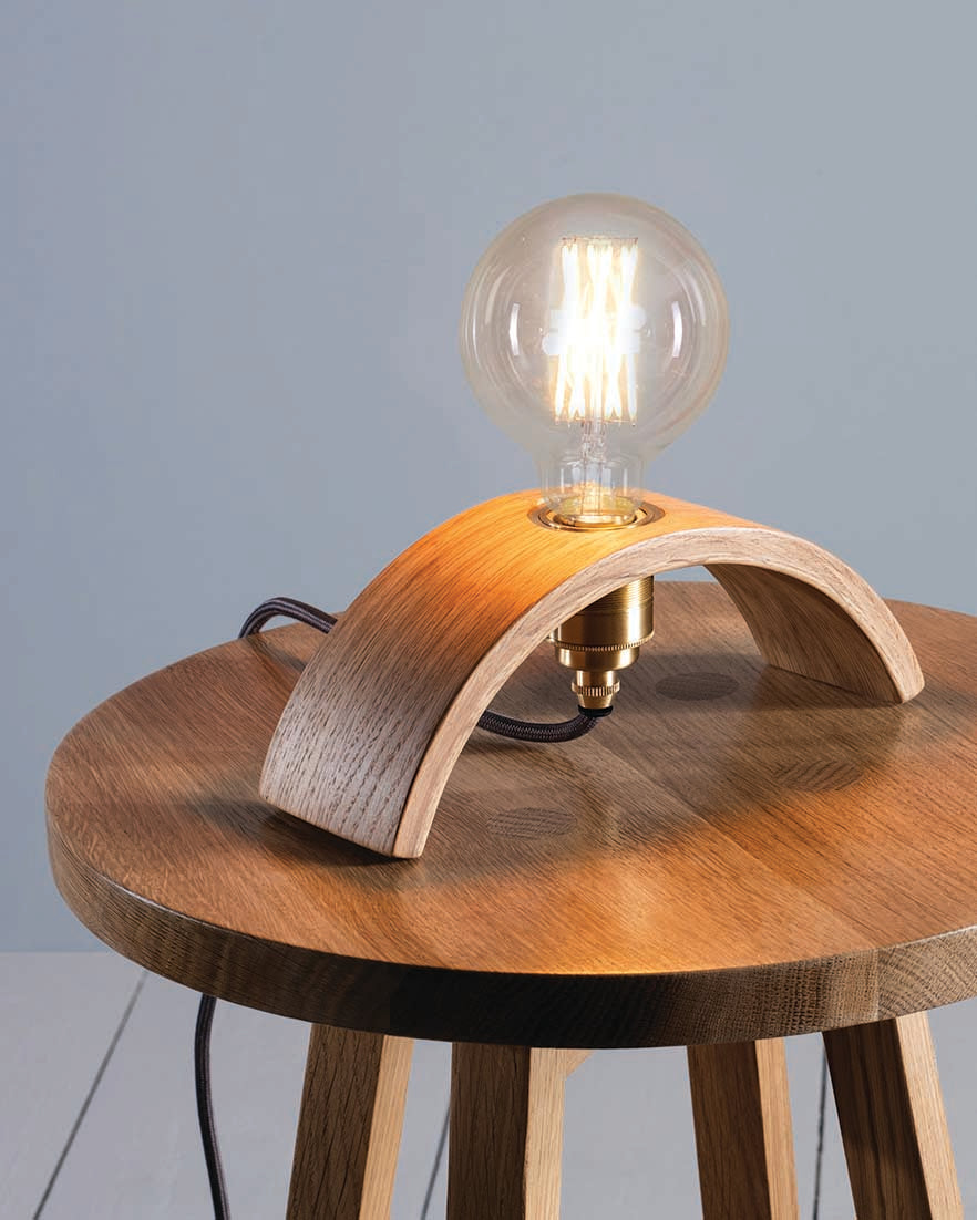 A taut, arching crescent of sustainably sourced oak shoulders a decorative LED bulb. Strong and sleek, the Archer Table Light emanates pared back elegance whilst producing ambient task lighting.
