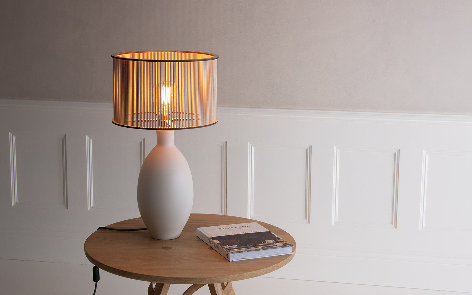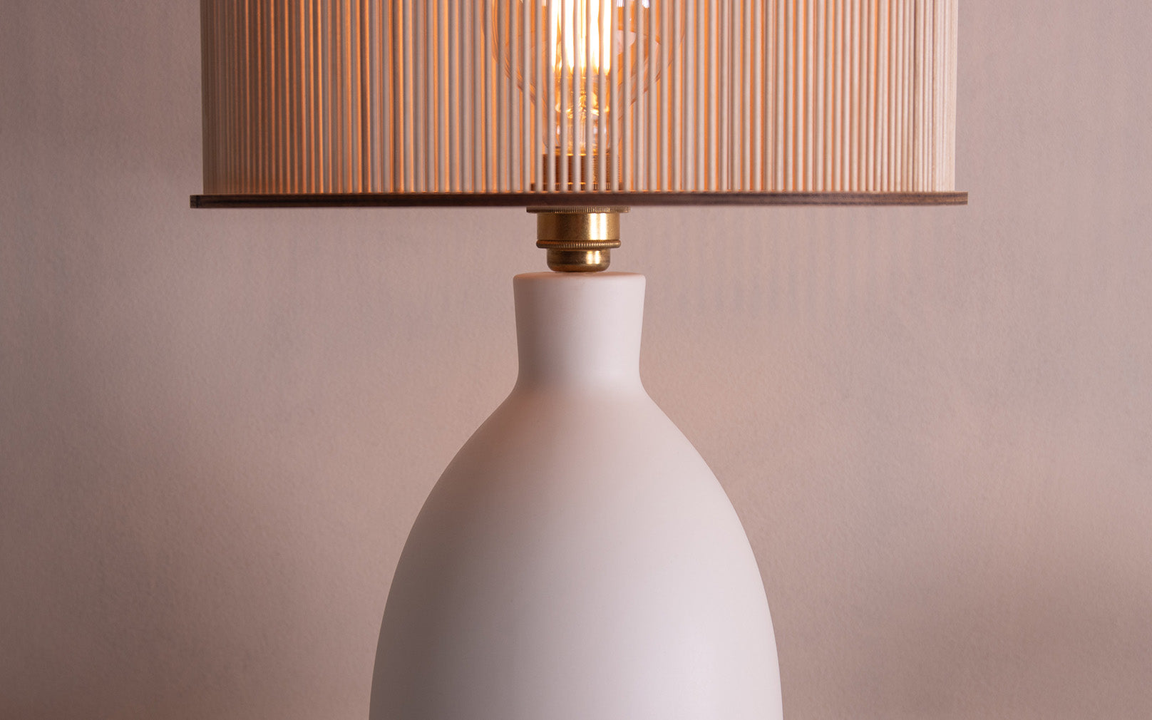 Main materials: Sustainably sourced birch ply and dowel, grey fabric flex with inline switch, ceramic earthenware base