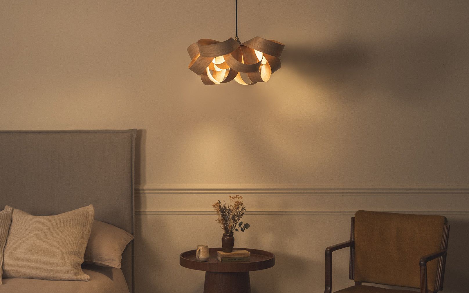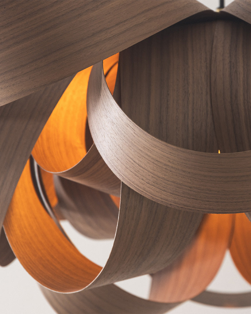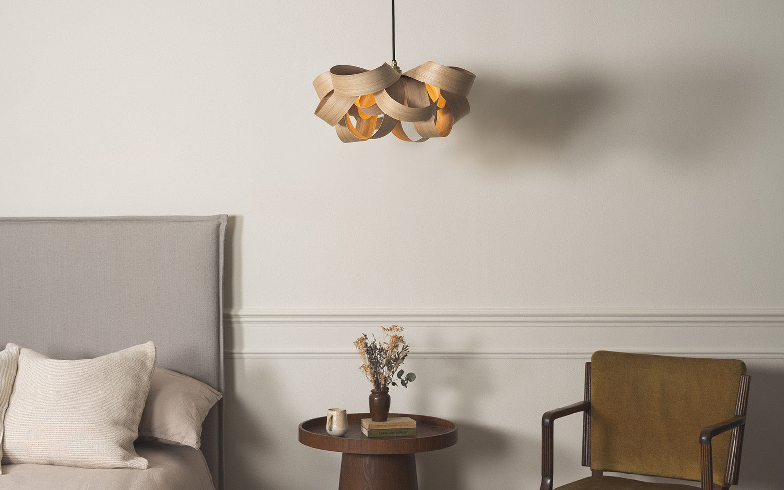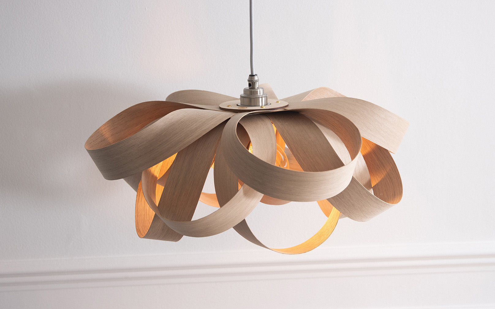 Hand curved from 16 lengths of sustainably sourced wood to provide an organic shape that emits a wonderful array of light and shadow. The Bloom Lighting range includes statement wooden lampshades, which hang beautifully above a dining table, bed, or create a welcoming radiance in your entranceway.