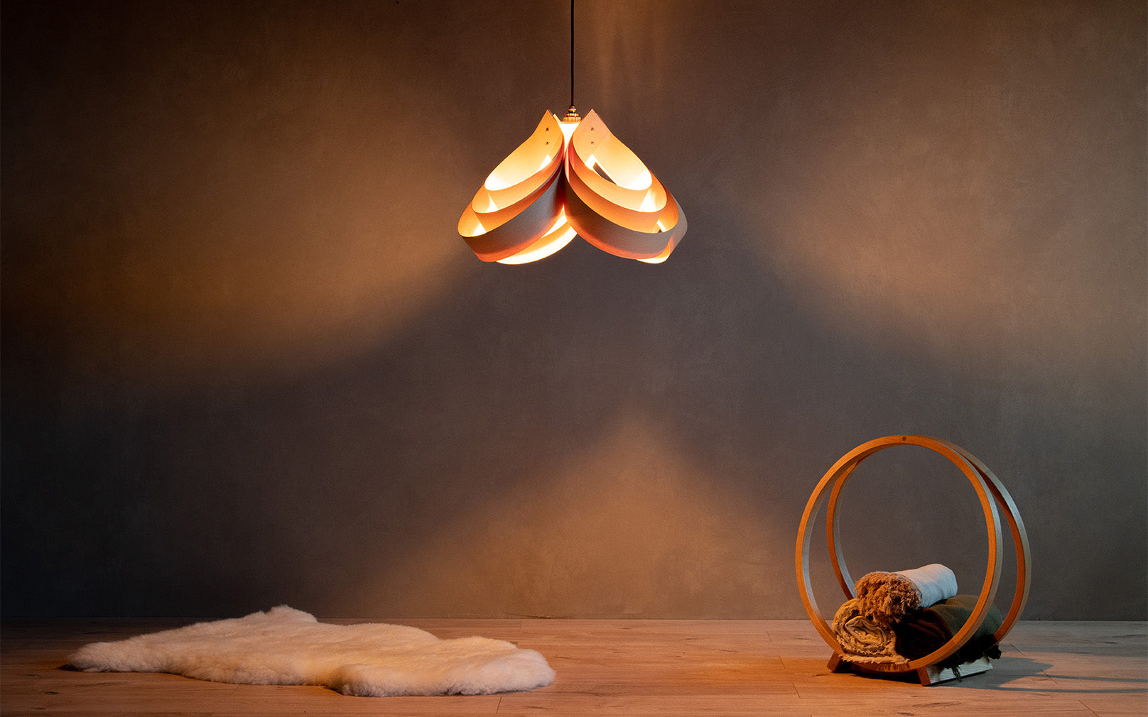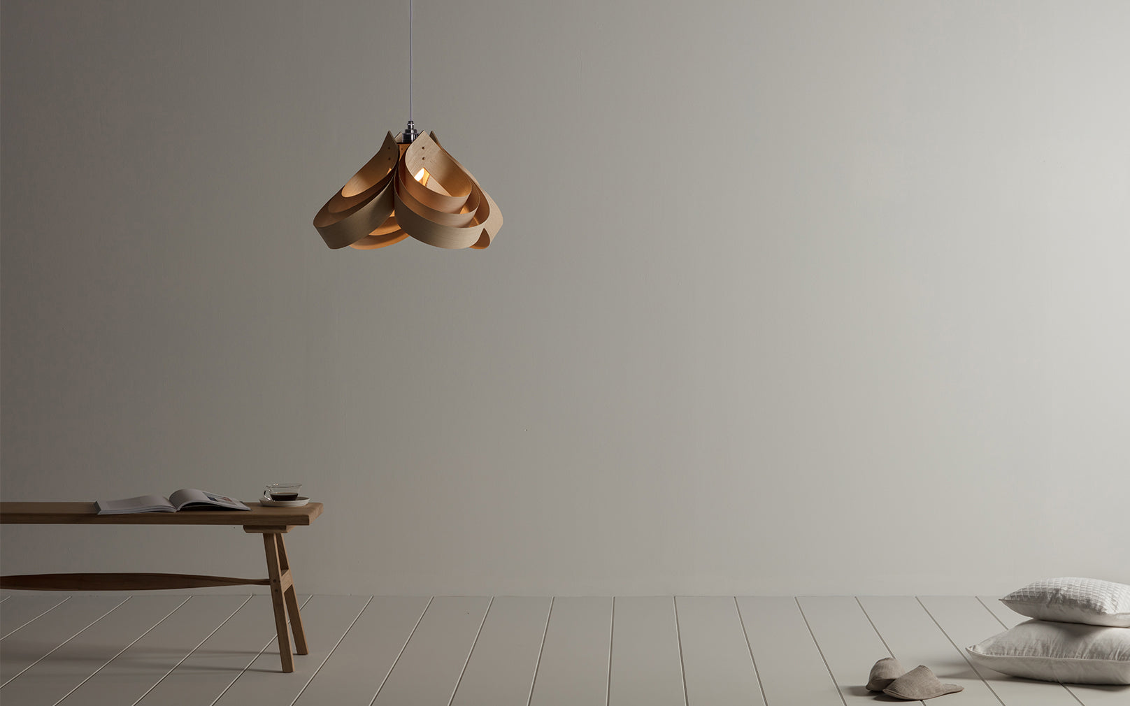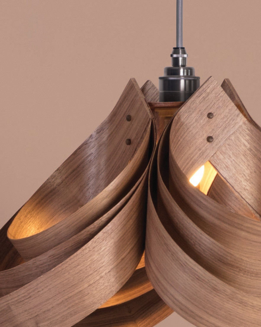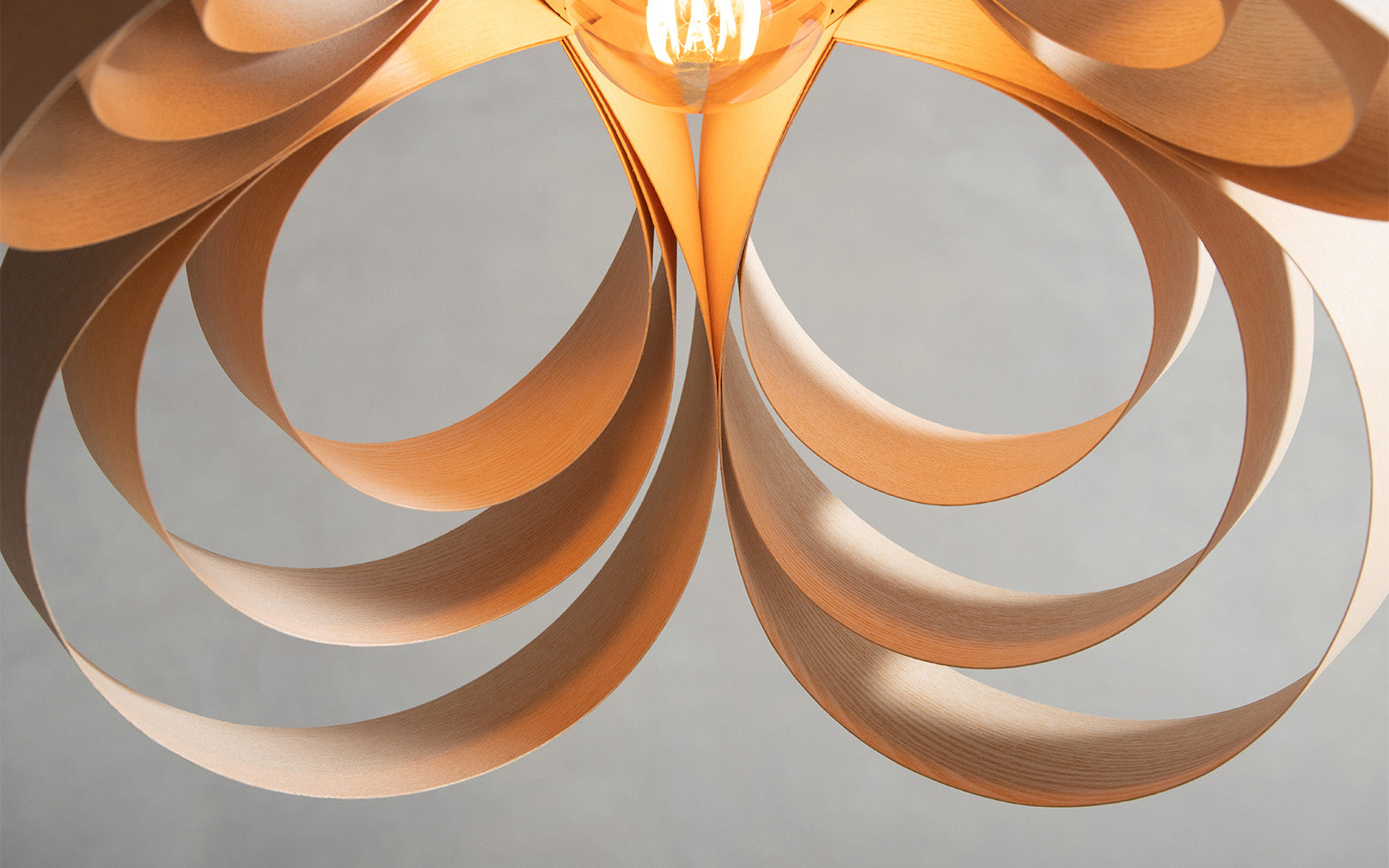 Handcrafted timber peaks and barrels. In its folds, light gathers and shadows are cast, creating focus and atmosphere. Sustainably sourced ash, oak, or walnut loop in layers to compliment, emphasise or elevate the space it claims. Soothing living spaces or bedrooms with its looping form, this wooden ceiling pendant invites comfort.