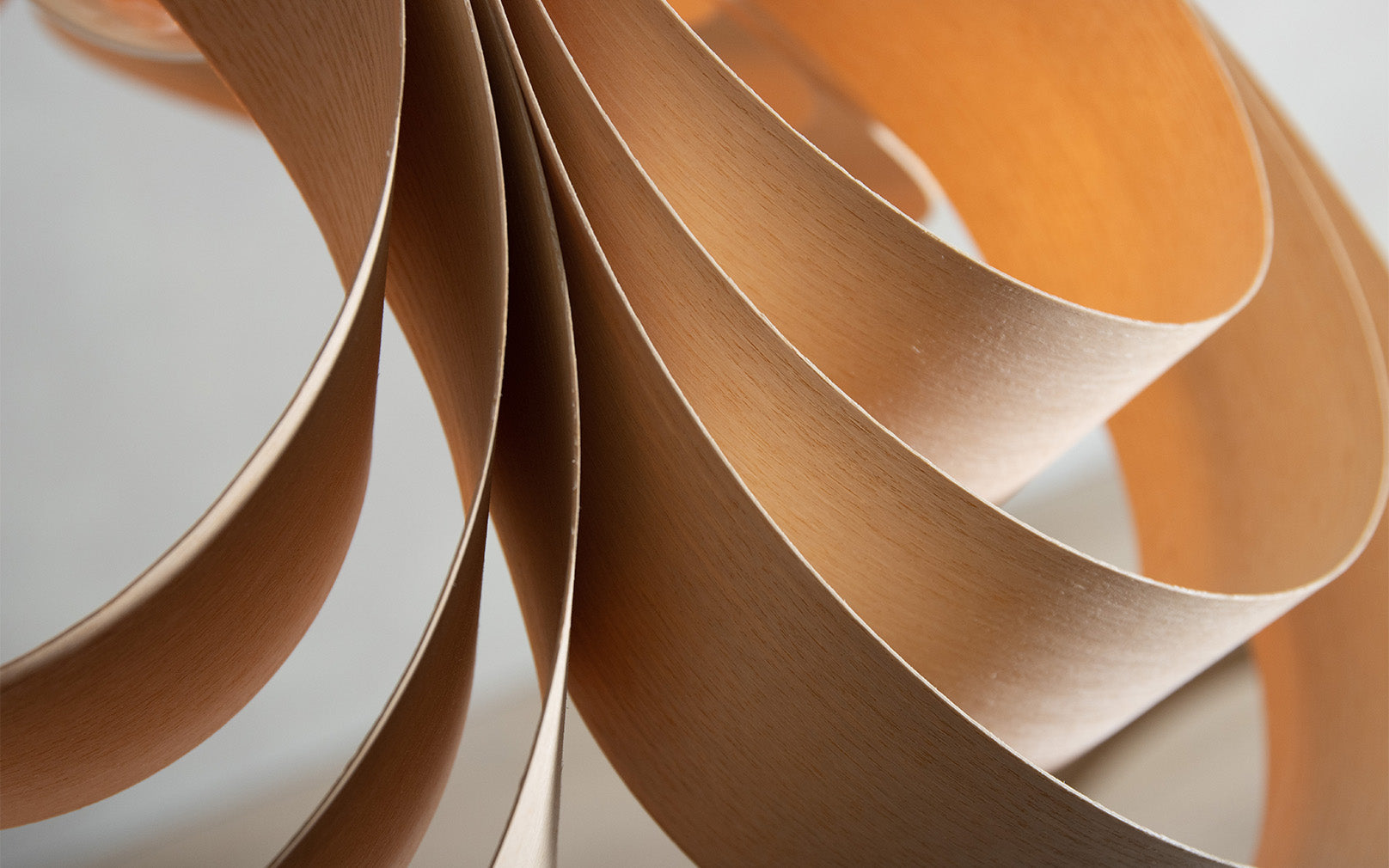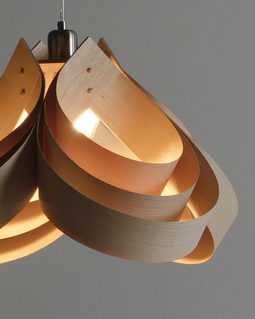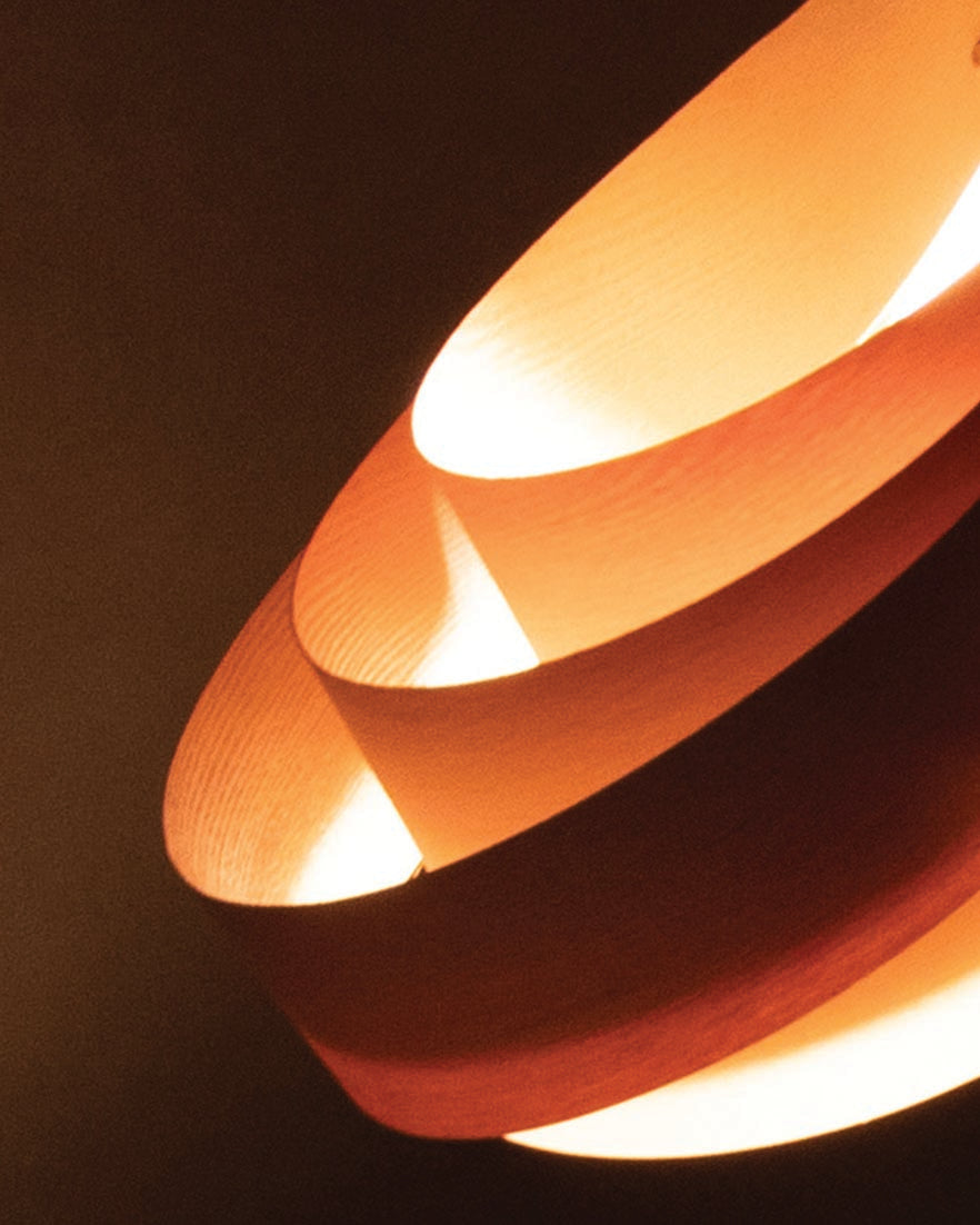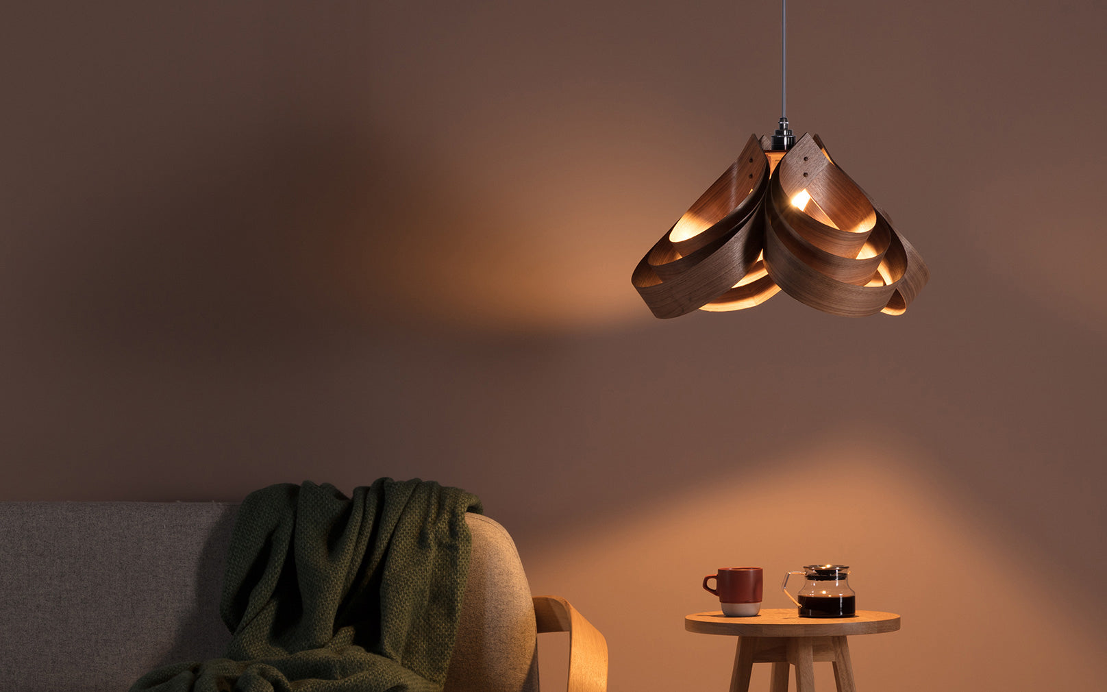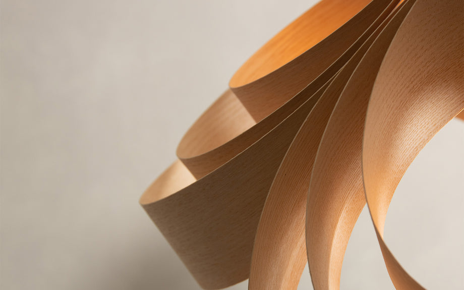 Handcrafted timber peaks and barrels. In its folds, light gathers and shadows are cast, creating focus and atmosphere. Sustainably sourced ash, oak, or walnut loop in layers to compliment, emphasise or elevate the space it claims. Soothing living spaces or bedrooms with its looping form, this wooden ceiling pendant invites comfort.