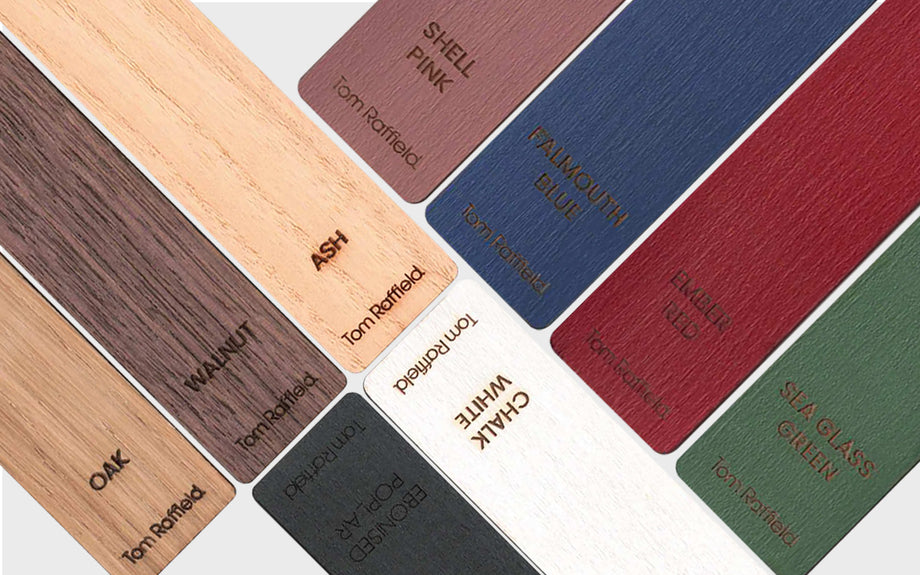 Get to know our beautiful selection of sustainably sourced materials and compare how they thrive in your space with a helpful sample pack. Our Cove coloured wood sample includes Sea Glass Green, Ember Red, Falmouth Blue, Chalk White and Shell Pink which are used in our Cove Lighting Range.
