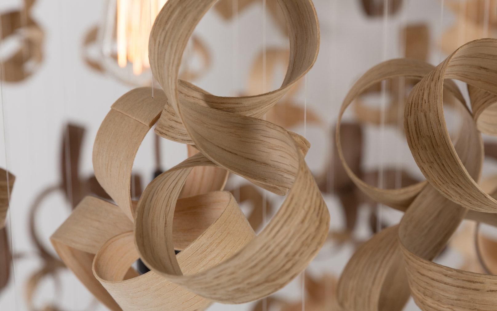 Wooden wings of sustainable ash, oak, and walnut, weightless to the eye, soar together. Each individual steam bent component is handcrafted by our skilled workshop team and suspended from a solid oak top plate to create show-stopping impact. Illuminated by three filament bulbs, each piece of the intricate design is in constant motion, creating a wooden chandelier unlike any other. Well suited for grand entrance-ways or open plan living spaces, the Flock Chandelier will always invite awe.