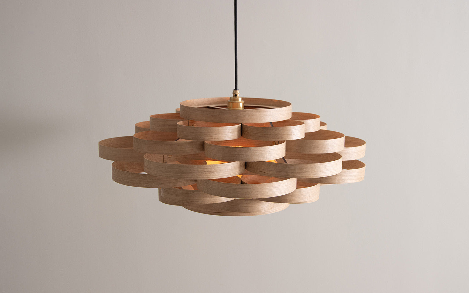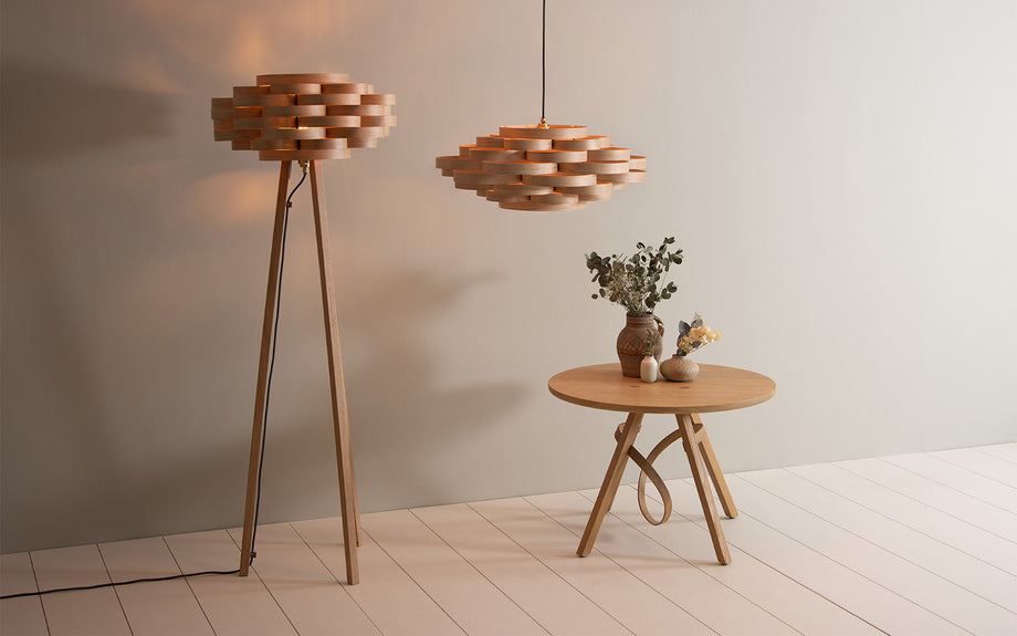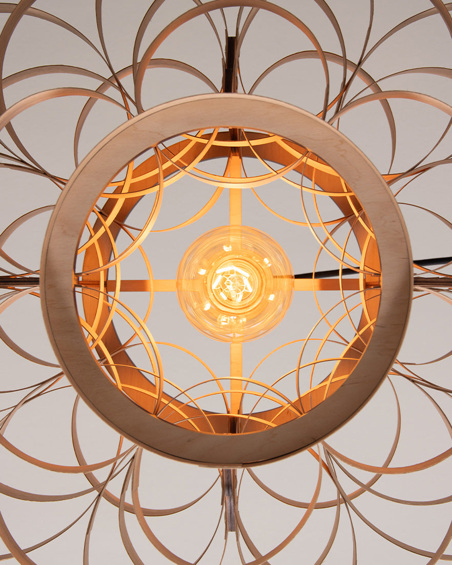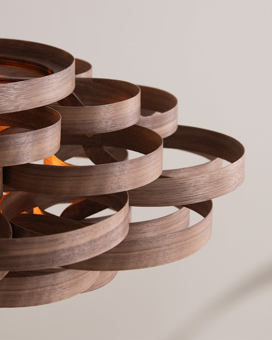 Meticulously crafted by hand, layered loops of sustainably sourced ash, oak, or walnut, weave together to produce this designer wooden ceiling light. Well suited for dining spaces, hallways, and bedrooms alike, the Gwenen Pendant effortlessly becomes the focal point of any room, casting a mesmerising pattern of light and shadows whilst radiating with an aura of wonder. Even when switched off, its organic labyrinth of wooden curves creates an extraordinary spectacle to admire.