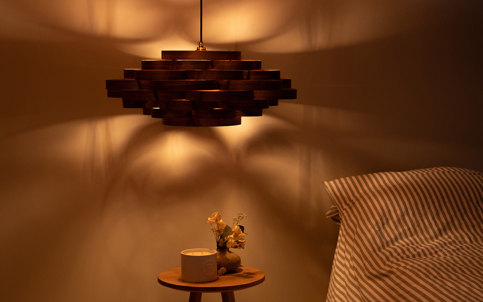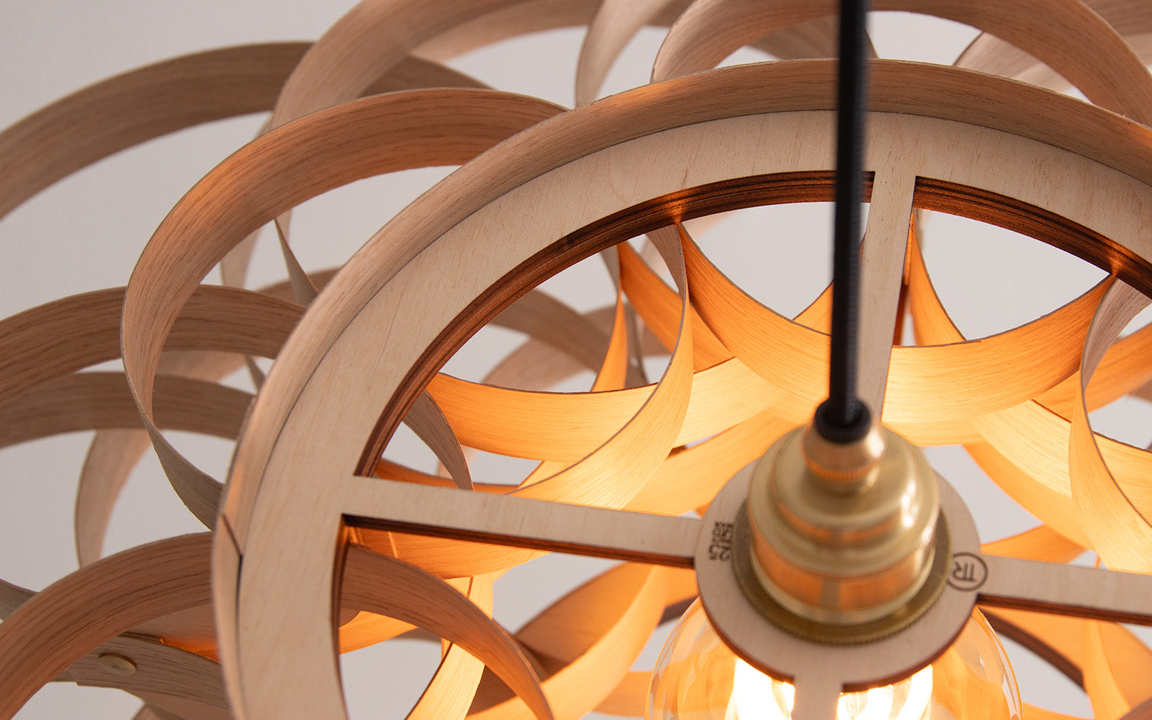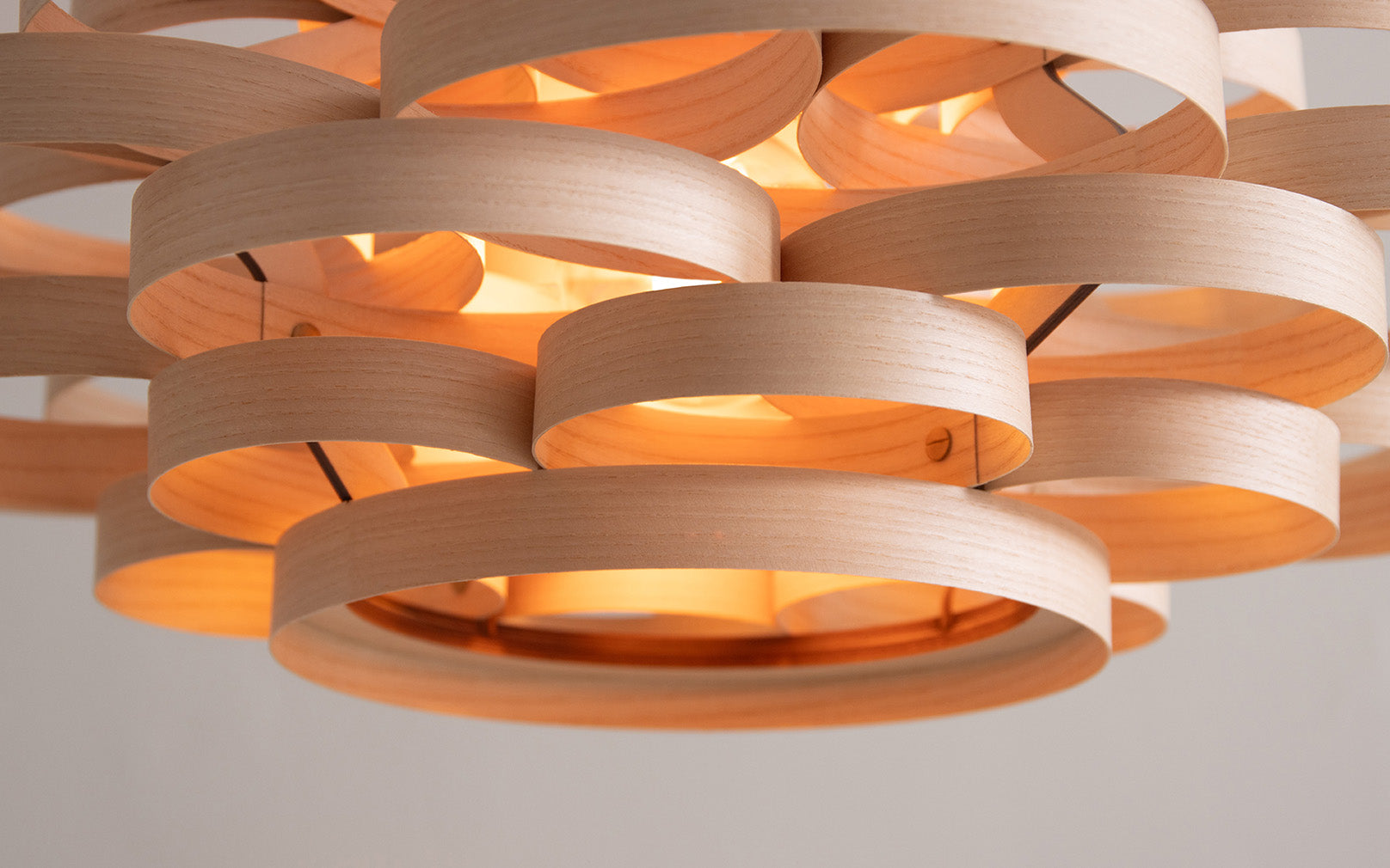 Meticulously crafted by hand, layered loops of sustainably sourced ash, oak, or walnut, weave together to produce this designer wooden ceiling light. Well suited for dining spaces, hallways, and bedrooms alike, the Gwenen Pendant effortlessly becomes the focal point of any room, casting a mesmerising pattern of light and shadows whilst radiating with an aura of wonder. Even when switched off, its organic labyrinth of wooden curves creates an extraordinary spectacle to admire.