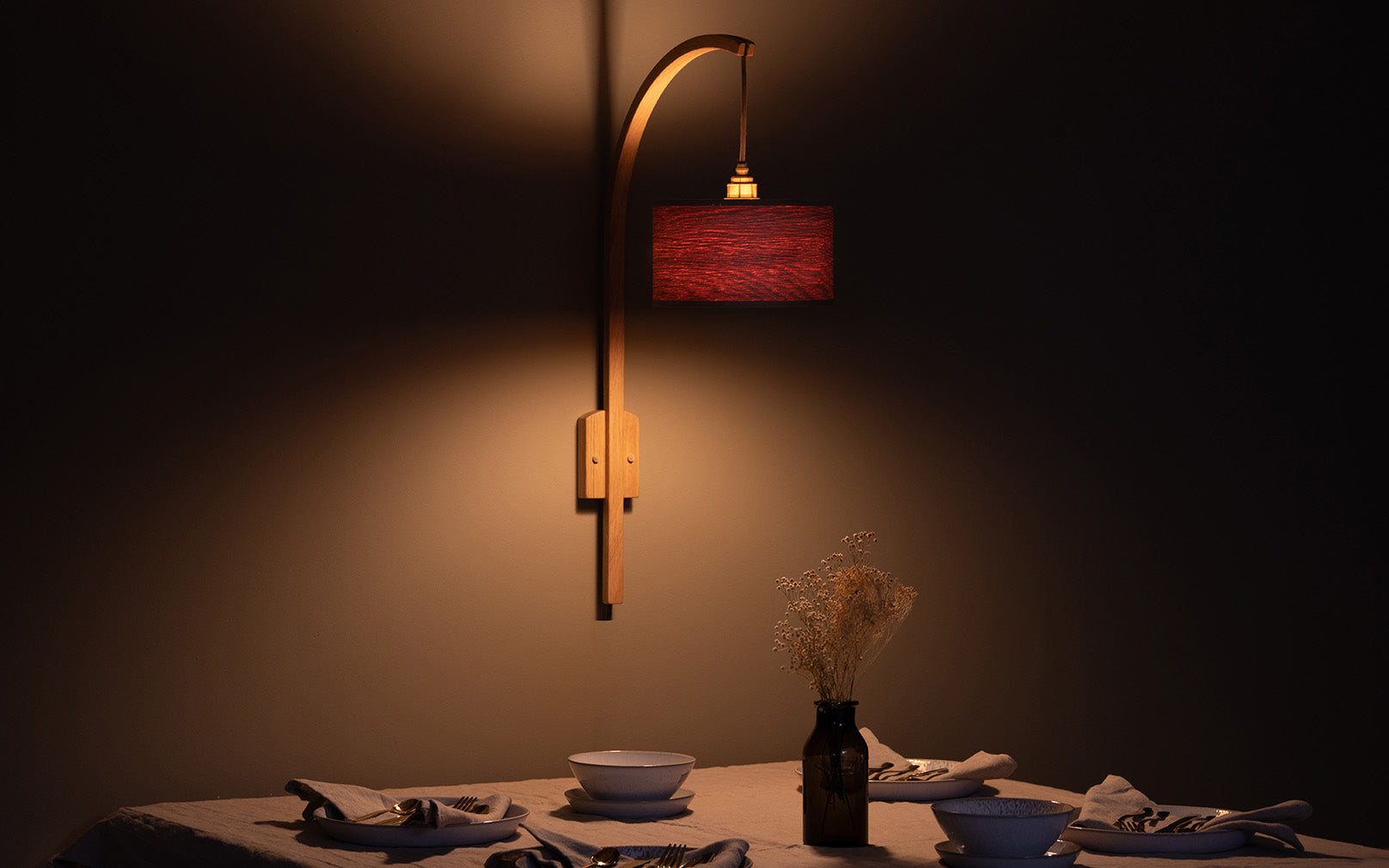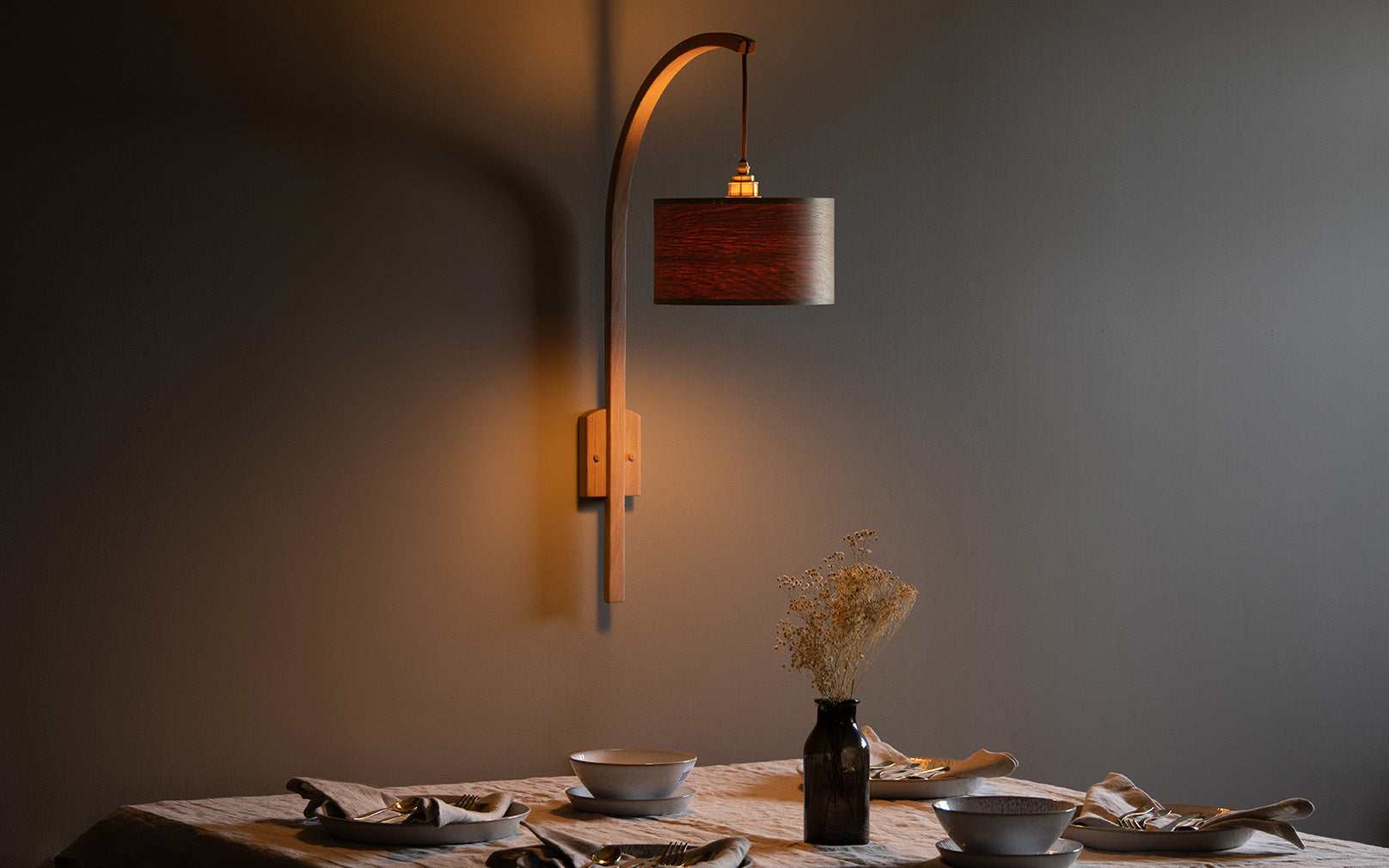 An arc of sustainably sourced oak grows up and out from a solid base, suspending the Kanna Drum Pendant at perfect height to display soft downlighting through your space. The Tilow’s steam bent design will divide and balance your interior with ease as it illuminates with a warm, welcoming glow. Whether invited into your home as dynamic dining room lighting or to brighten the path through your hallway, this Tilow and Kanna Pendant duo will extend unique, striking design to your walls.