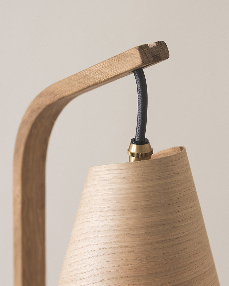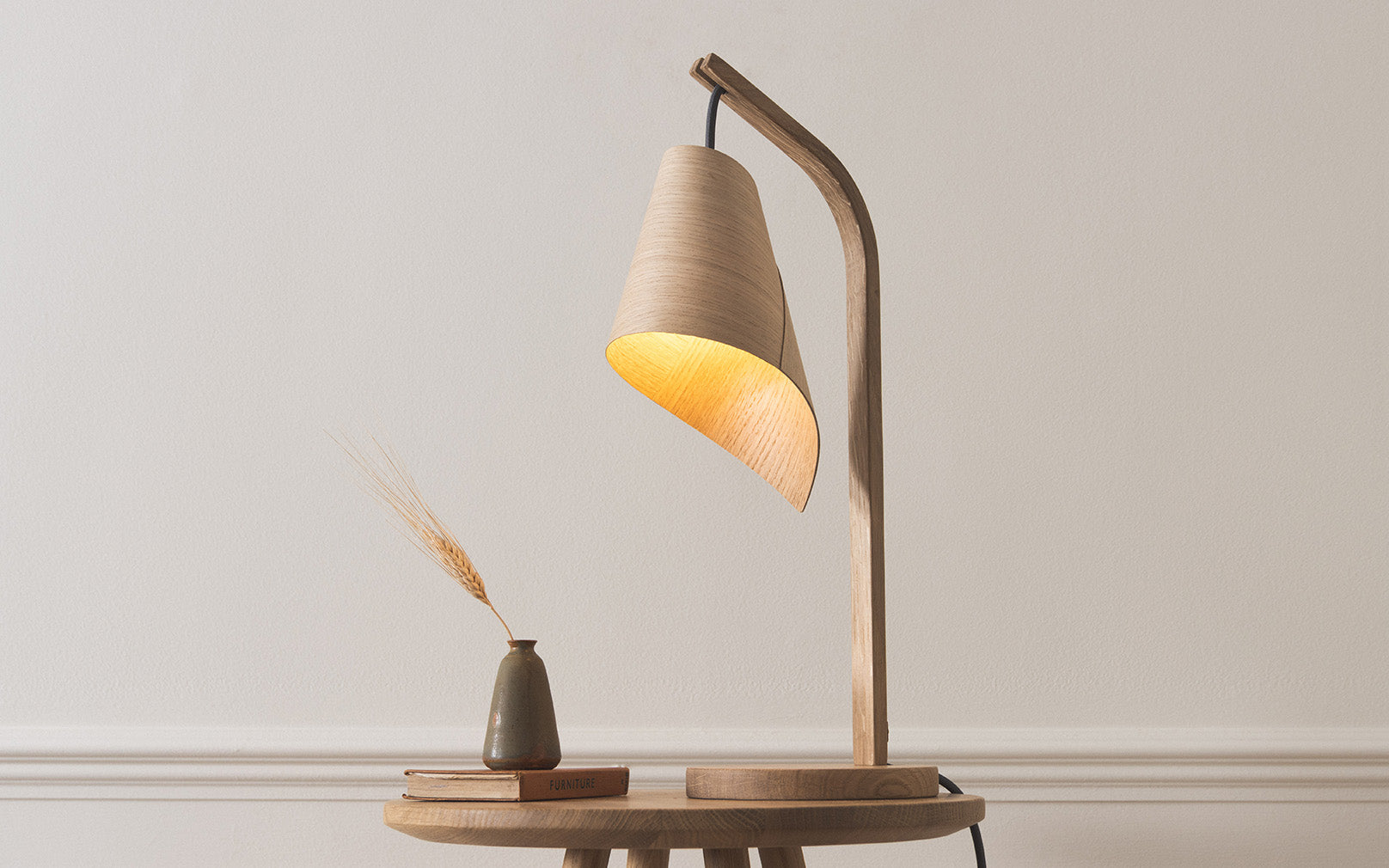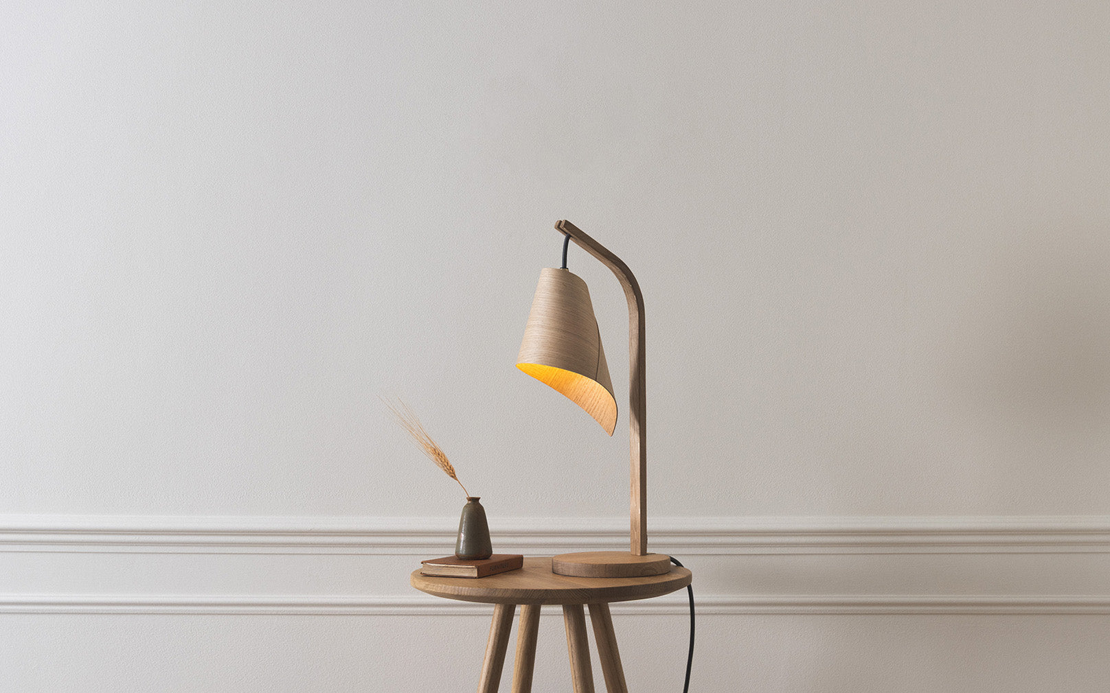 Taking inspiration from the natural, spiralling forms found along our Atlantic tide lines, the Keel Stem Table Light is a striking display of confident, modern design. Made from one isolated section, a wide piece of oak timber is arched by hand into a choreographed formation to create a pleasing tapered shade, hung from a steam bent solid oak stand. Producing a funnel of diffused downlight, the Keel Table Light’s inviting glow will bring serenity as a bedside light or directional light to a home office space.