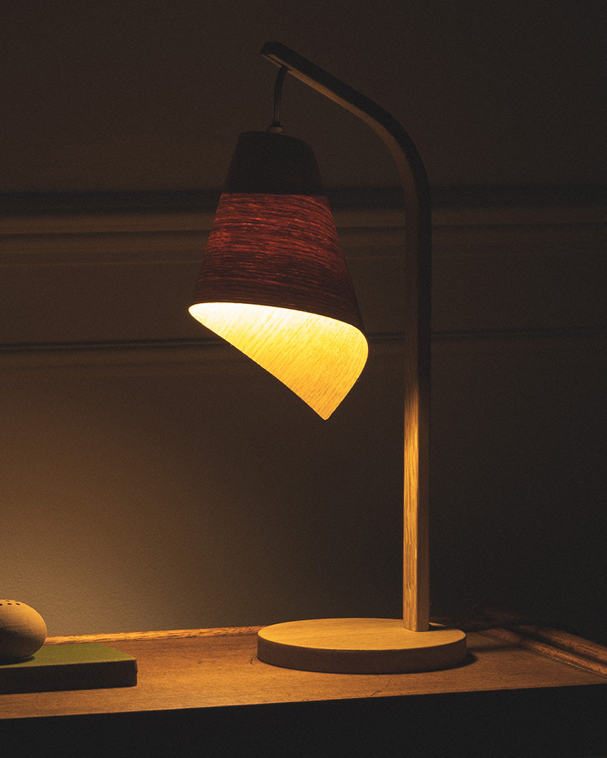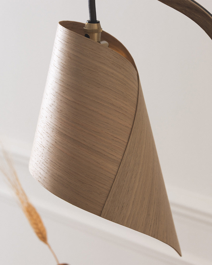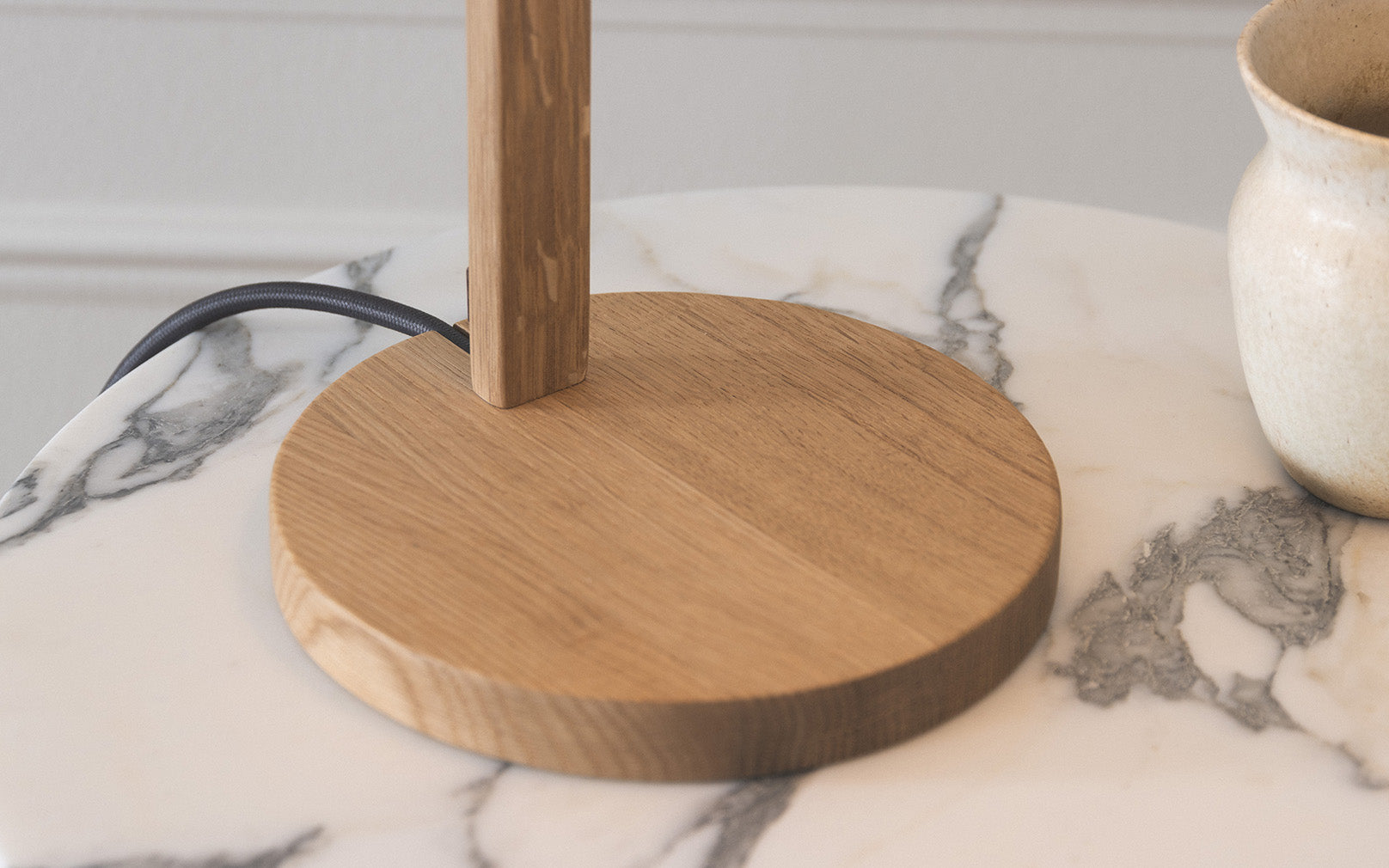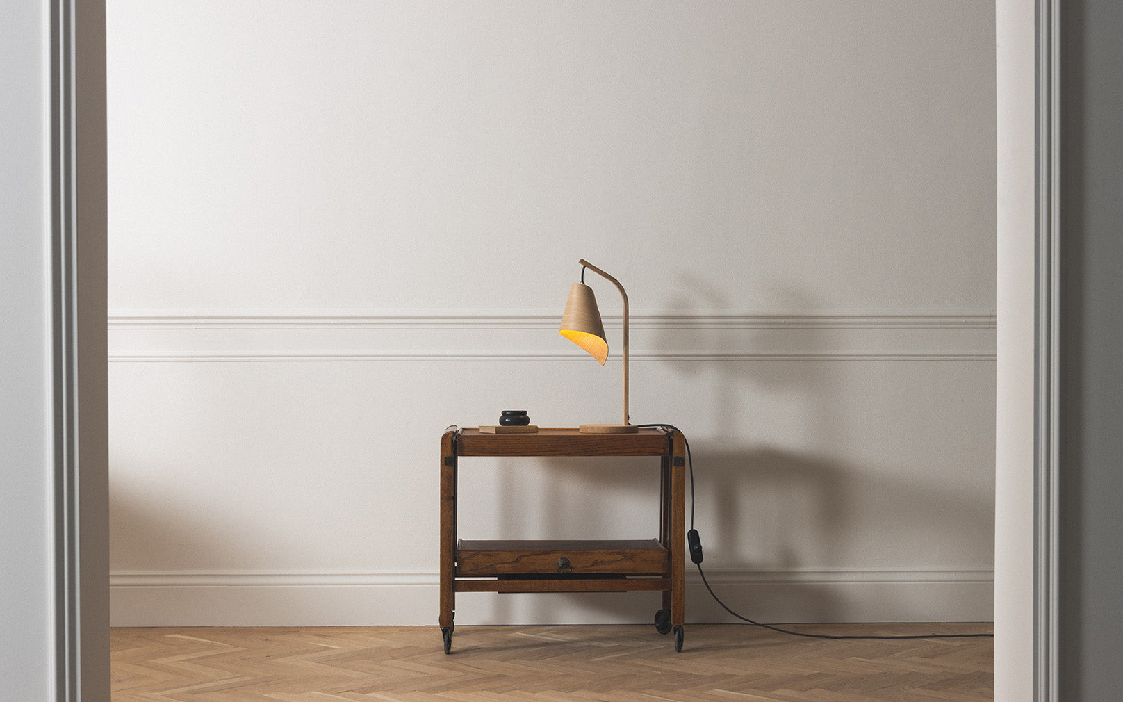 Taking inspiration from the natural, spiralling forms found along our Atlantic tide lines, the Keel Stem Table Light is a striking display of confident, modern design. Made from one isolated section, a wide piece of oak timber is arched by hand into a choreographed formation to create a pleasing tapered shade, hung from a steam bent solid oak stand. Producing a funnel of diffused downlight, the Keel Table Light’s inviting glow will bring serenity as a bedside light or directional light to a home office space.