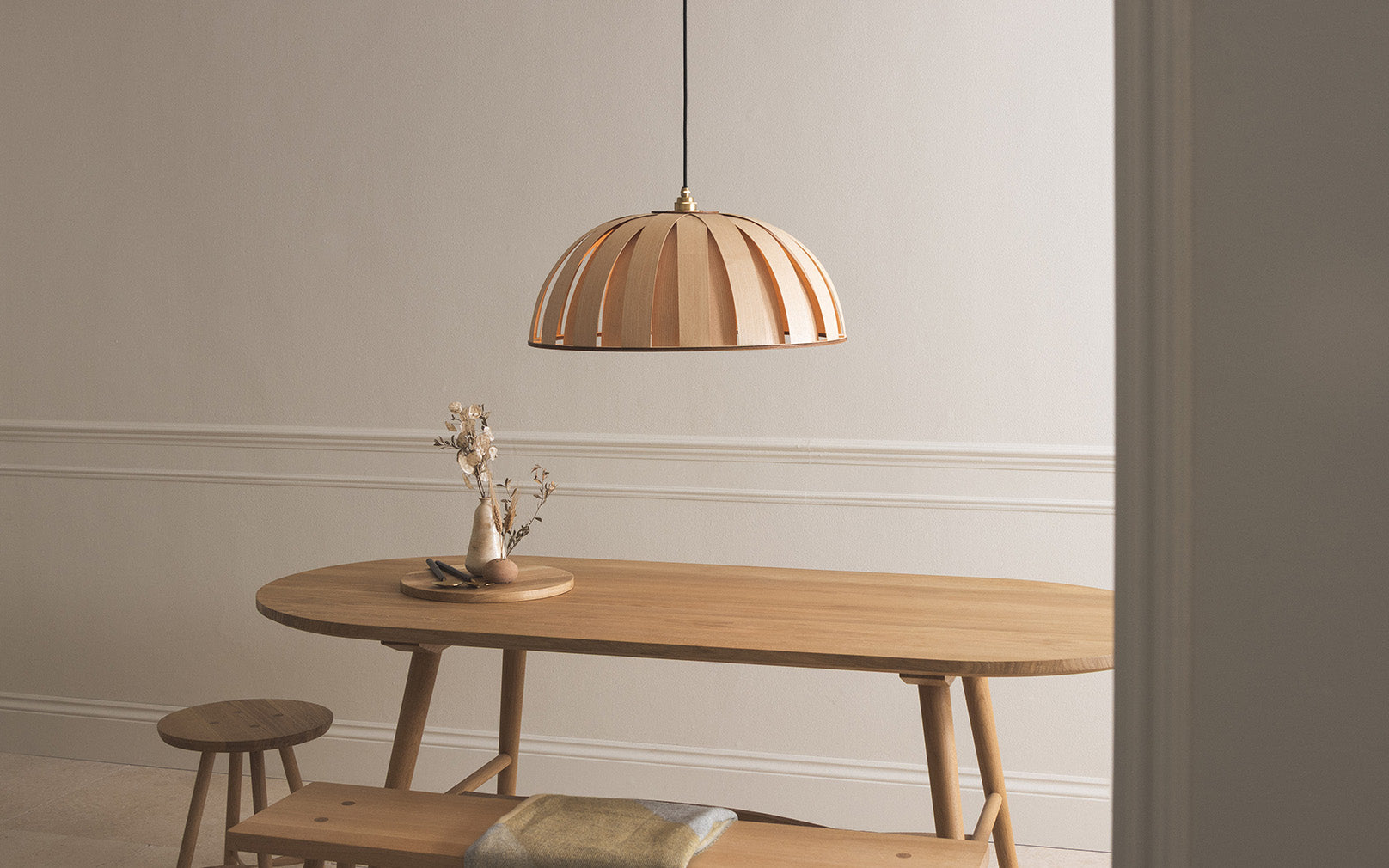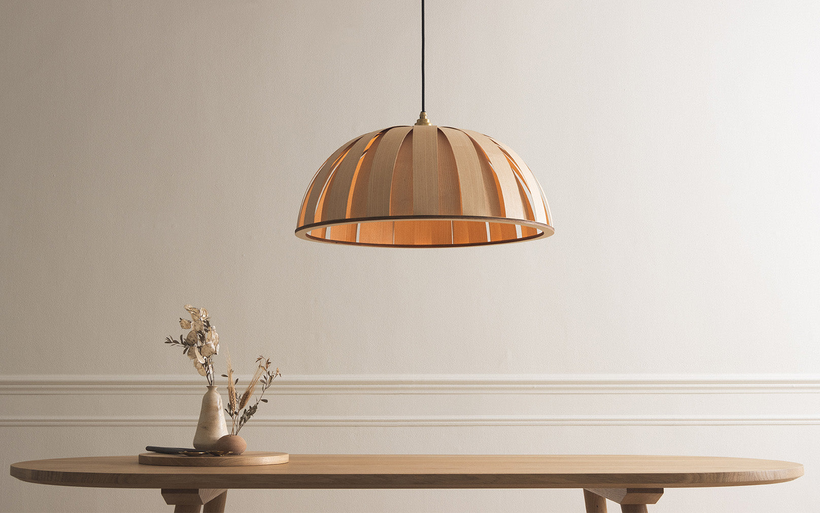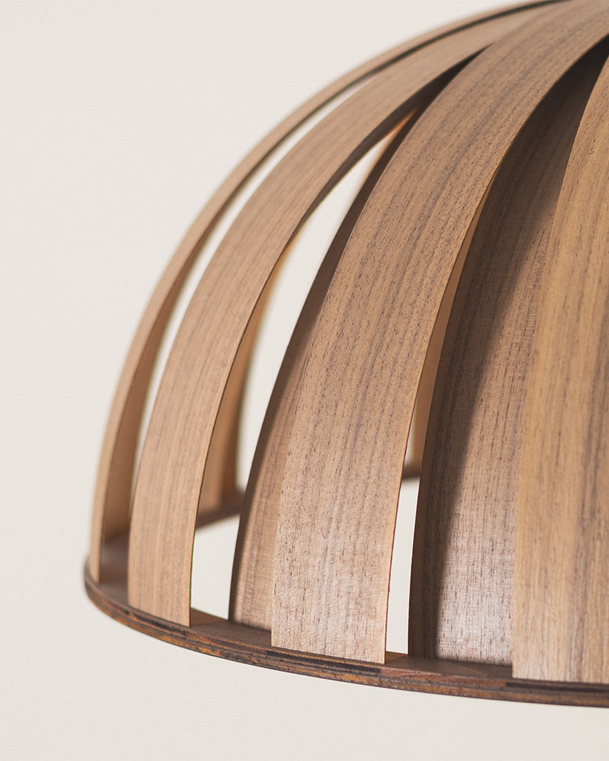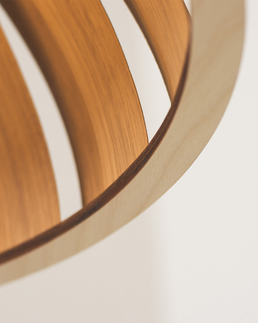With a distinctive radial pattern veiling the bulb within, 36 interlocking curves of wood are bound together by laser cut birch frames, allowing a soft glow of light to emit through each seam, scattering slices of light across the room. With a choice of sustainably sourced ash, oak or walnut, this striking wooden lampshade rests beautifully in dining or living spaces, creating a serene and sculptural focal point.