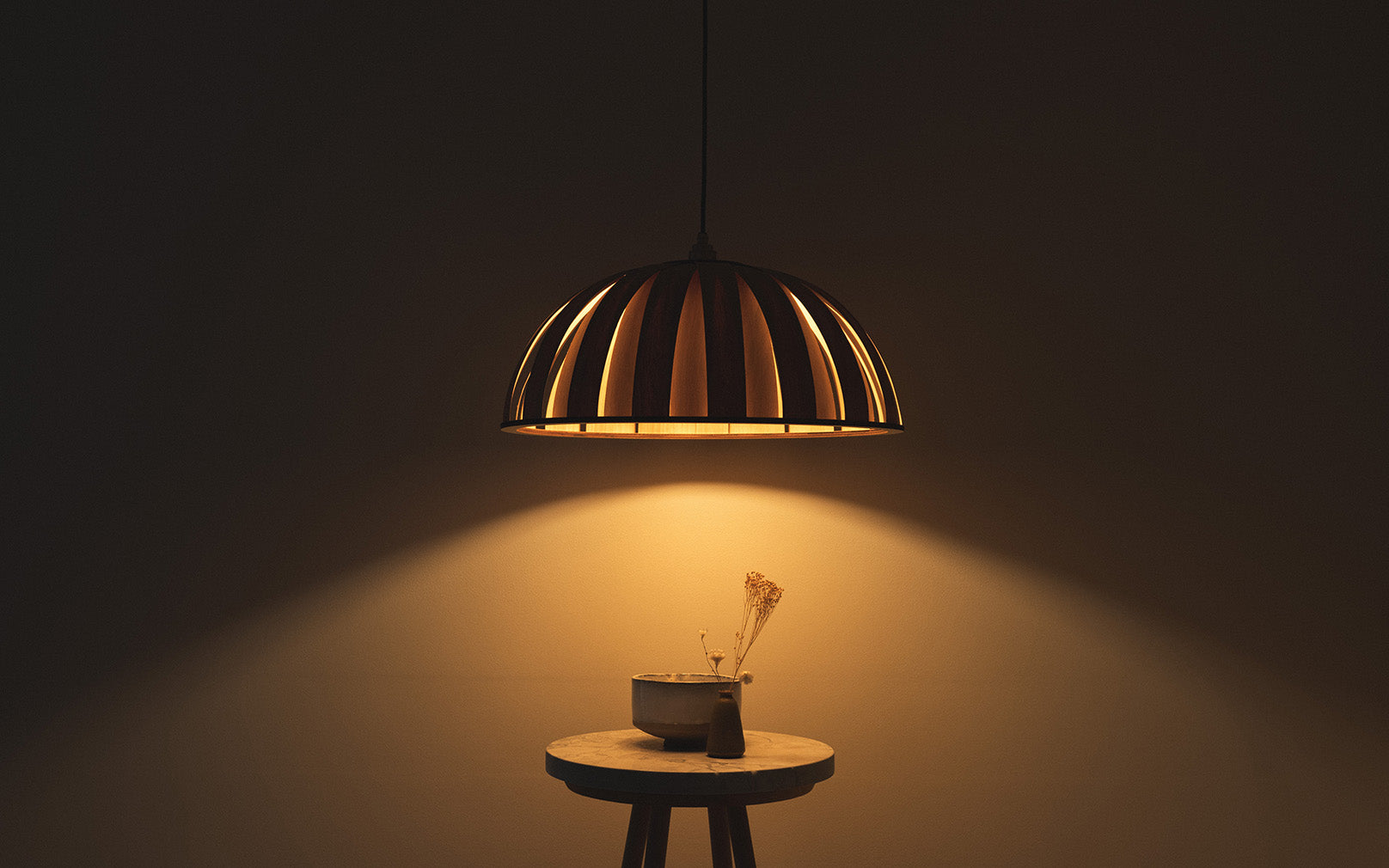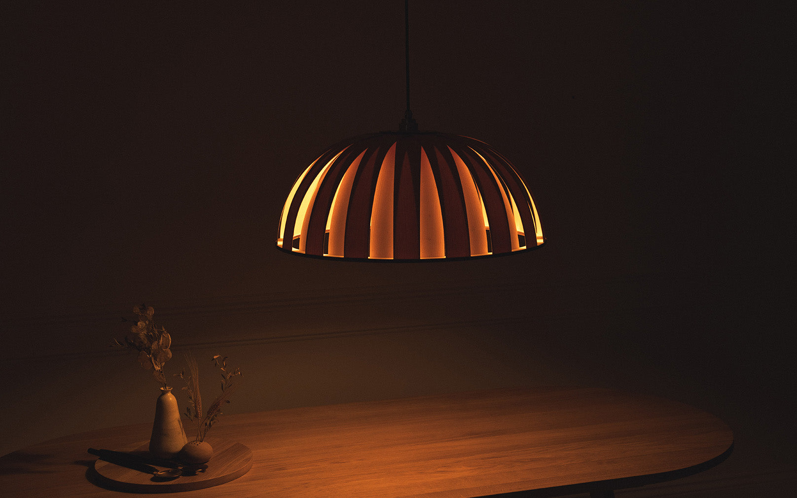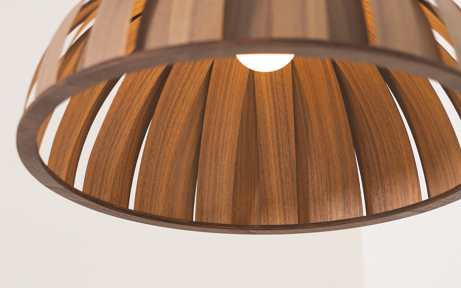 With a distinctive radial pattern veiling the bulb within, 36 interlocking curves of wood are bound together by laser cut birch frames, allowing a soft glow of light to emit through each seam, scattering slices of light across the room. With a choice of sustainably sourced ash, oak or walnut, this striking wooden lampshade rests beautifully in dining or living spaces, creating a serene and sculptural focal point.