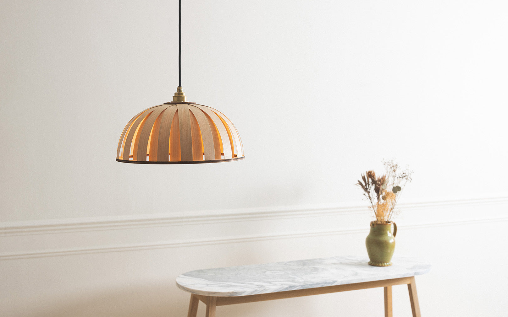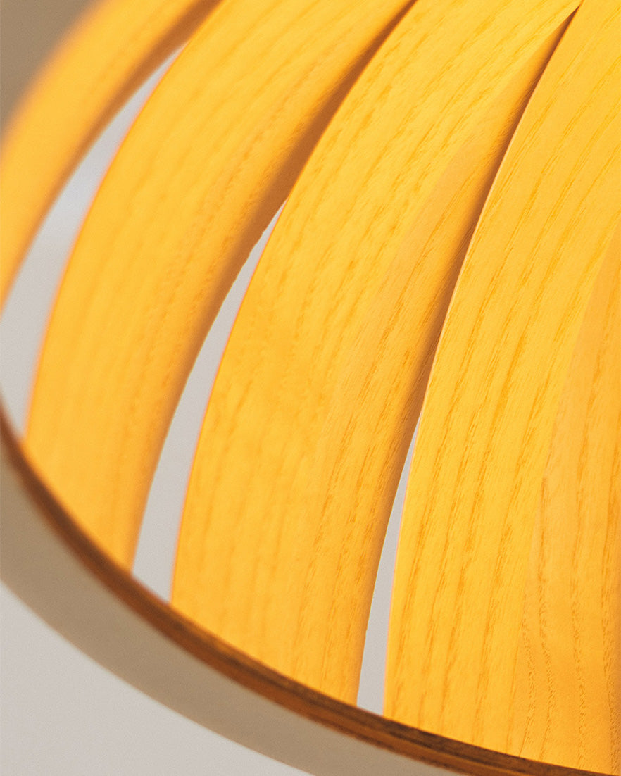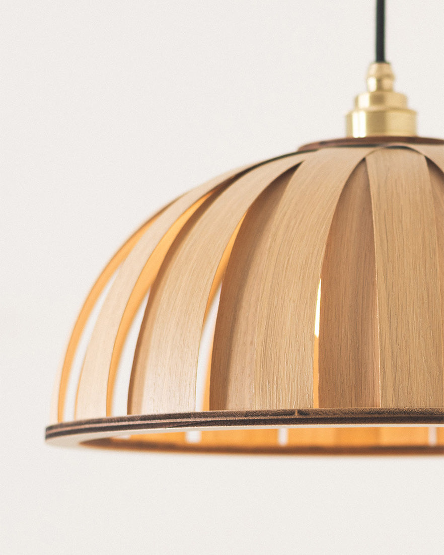 With a distinctive radial pattern veiling the bulb within, 36 interlocking curves of wood are bound together by laser cut birch frames, allowing a soft glow of light to emit through each seam, scattering slices of light across the room. With a choice of sustainably sourced ash, oak or walnut, this striking wooden lampshade rests beautifully in dining or living spaces, creating a serene and sculptural focal point.