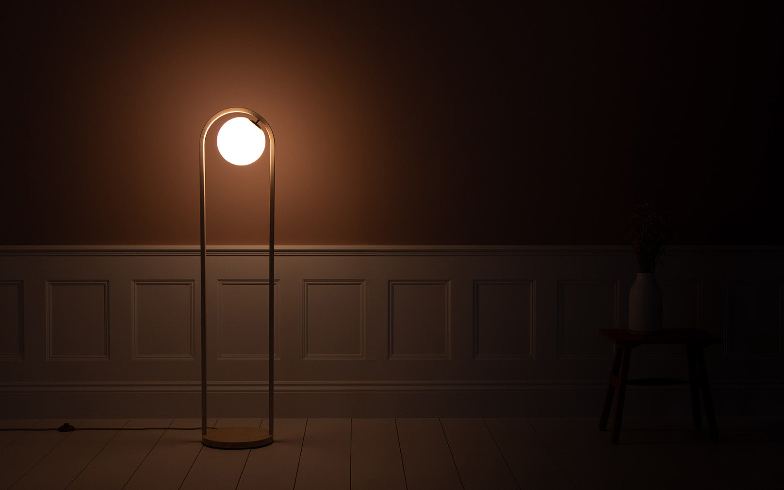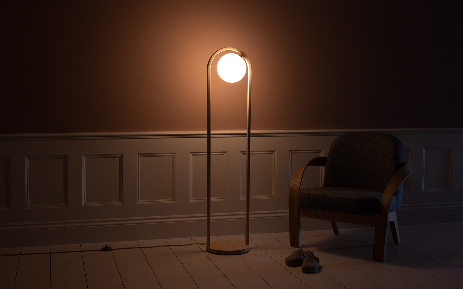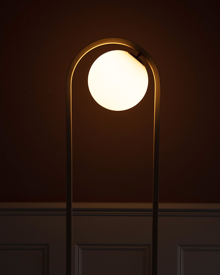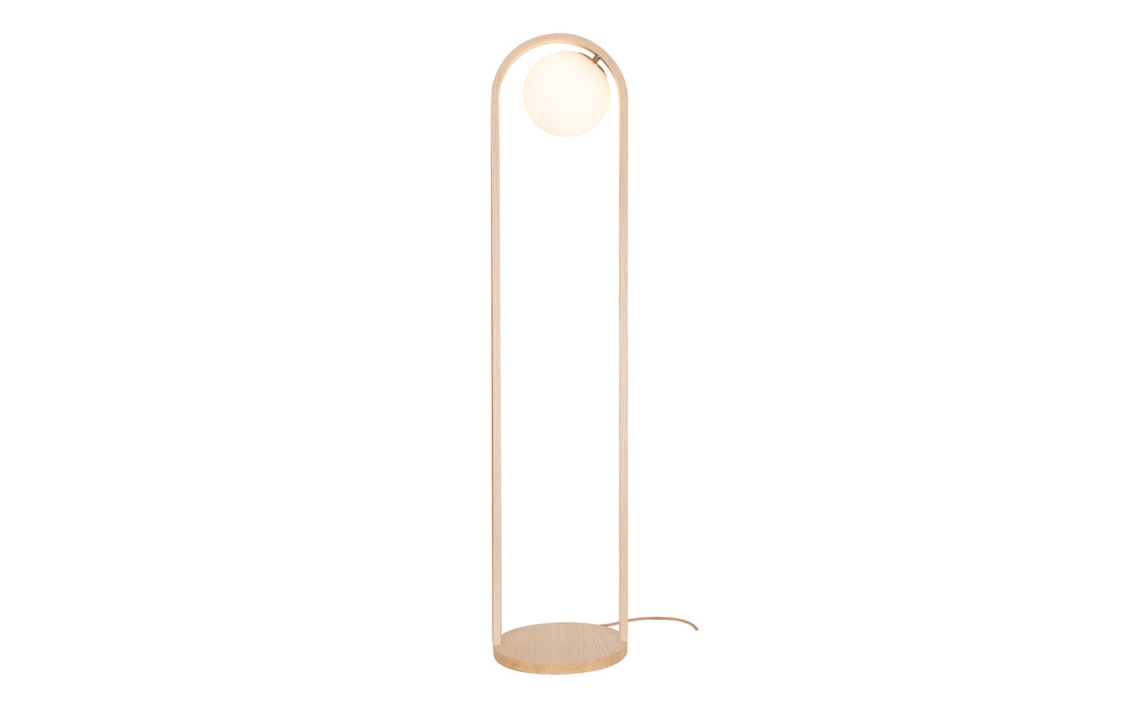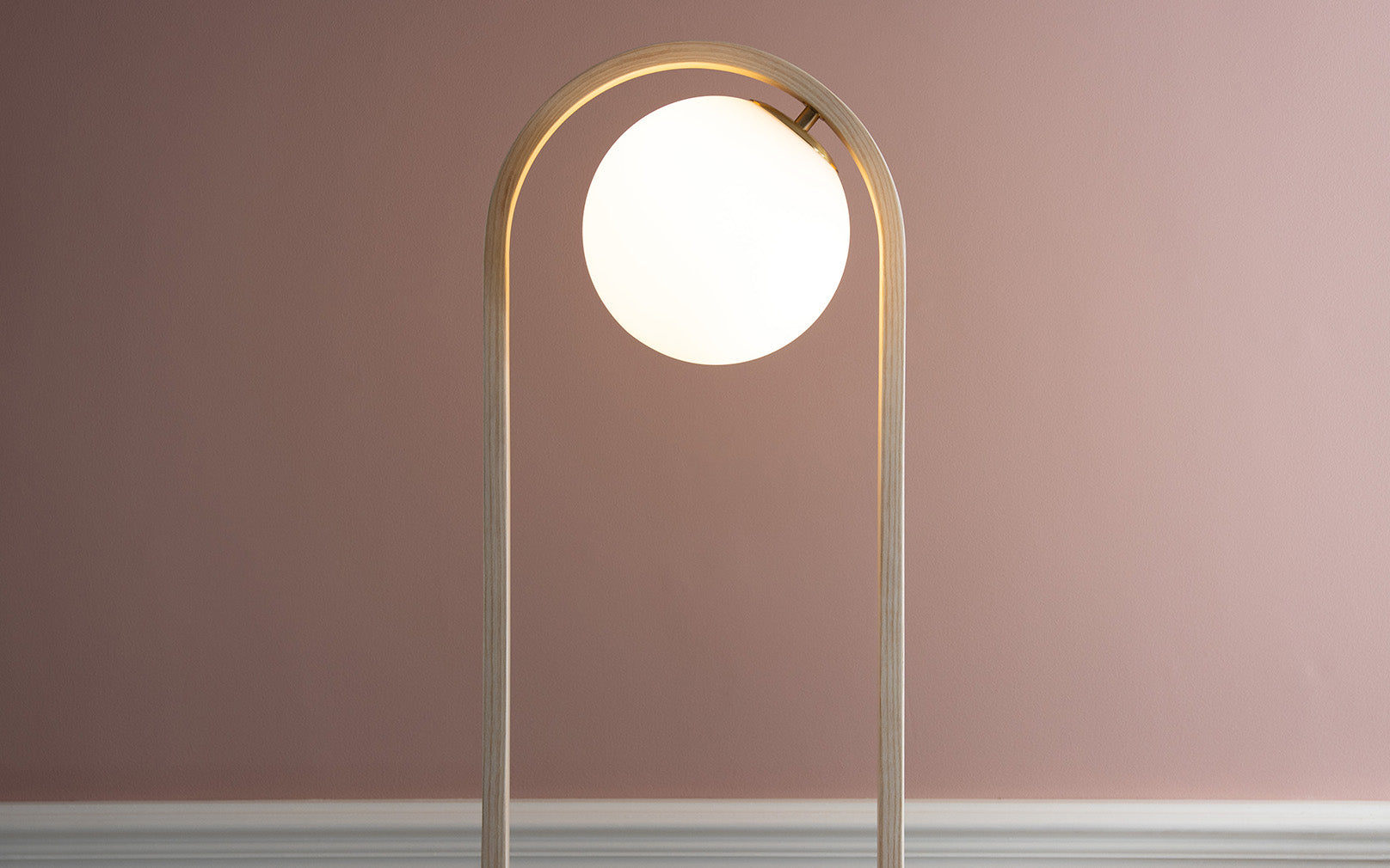 Meaning ‘Moon’ in Cornish, the Loer Floor Light showcases a translucent glass orb with clouded bands of warm celestial white light which suspends within a sleek arch of supple ash wood. Held in place by brass detailed fixings that reflect the soft illustrious glow of the spherical globe when illuminated, the opulent, wooden floor light looks equally as eye-catching when switched off.