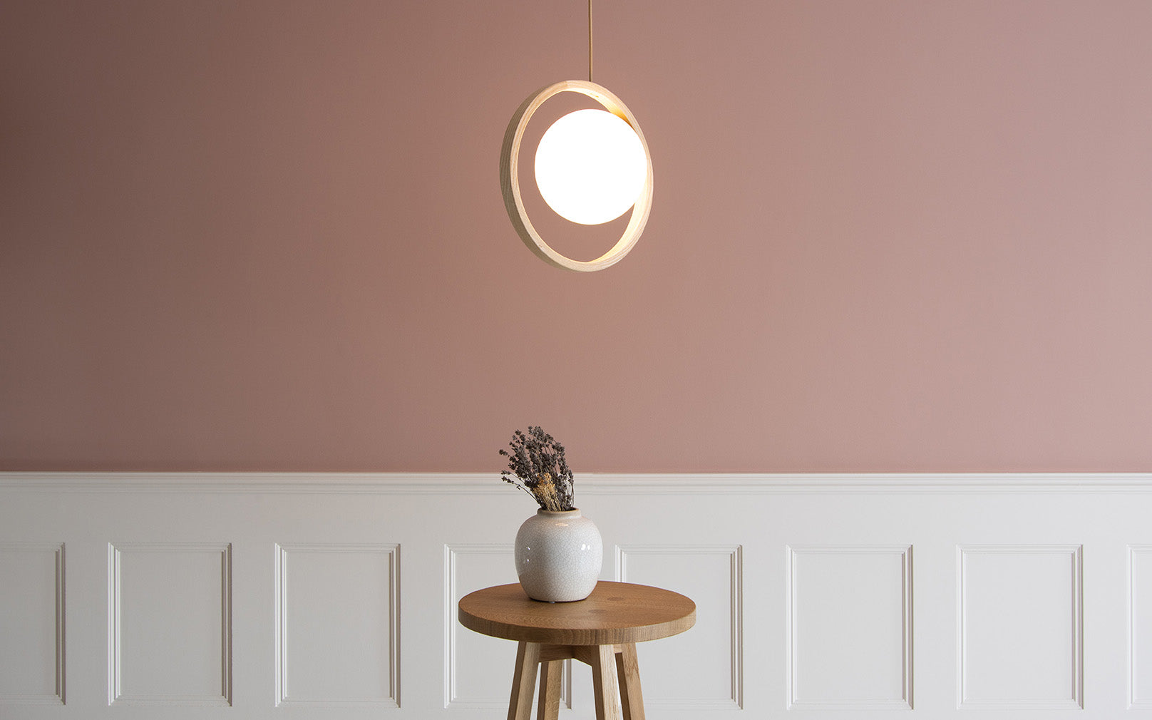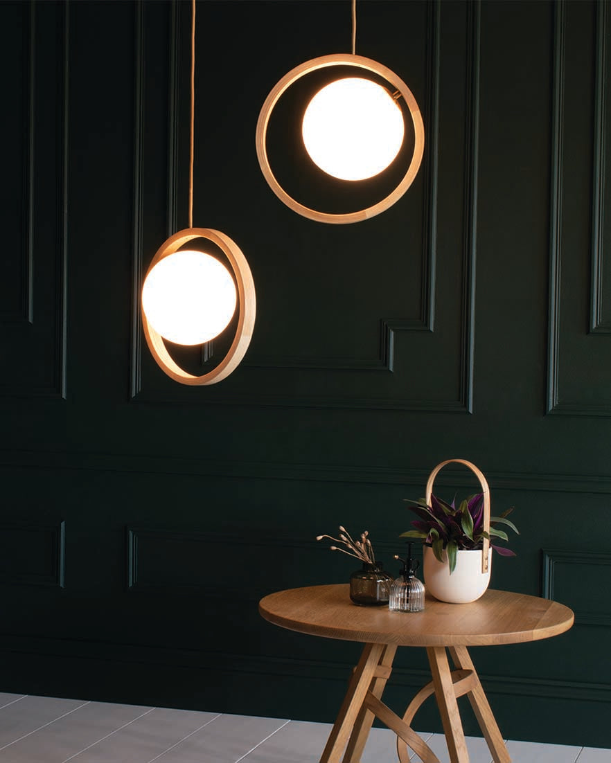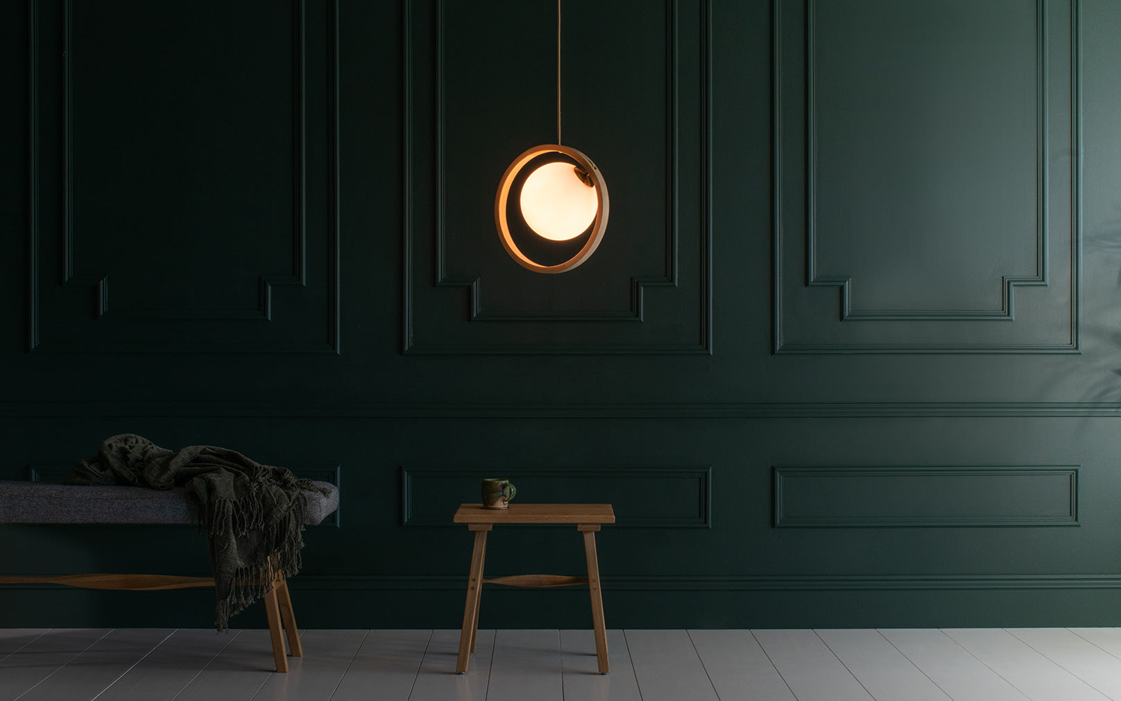 Meaning ‘Moon’ in Cornish, the Loer Pendant showcases a translucent glass orb with clouded bands of warm celestial white light which suspends within a sleek halo of supple ash wood. Held in place by brass detailed fixings that reflect the soft illustrious glow of the spherical globe when illuminated, the opulent Loer Pendant looks equally as eye-catching when switched off. This contemporary wooden light is suited to an array of interiors and property styles and looks particularly striking suspended in clusters.