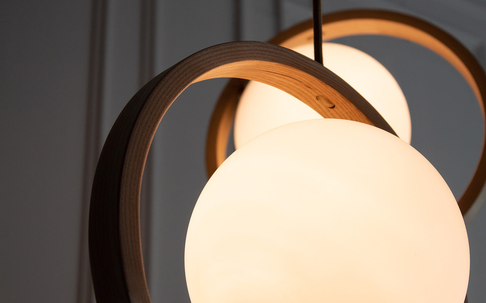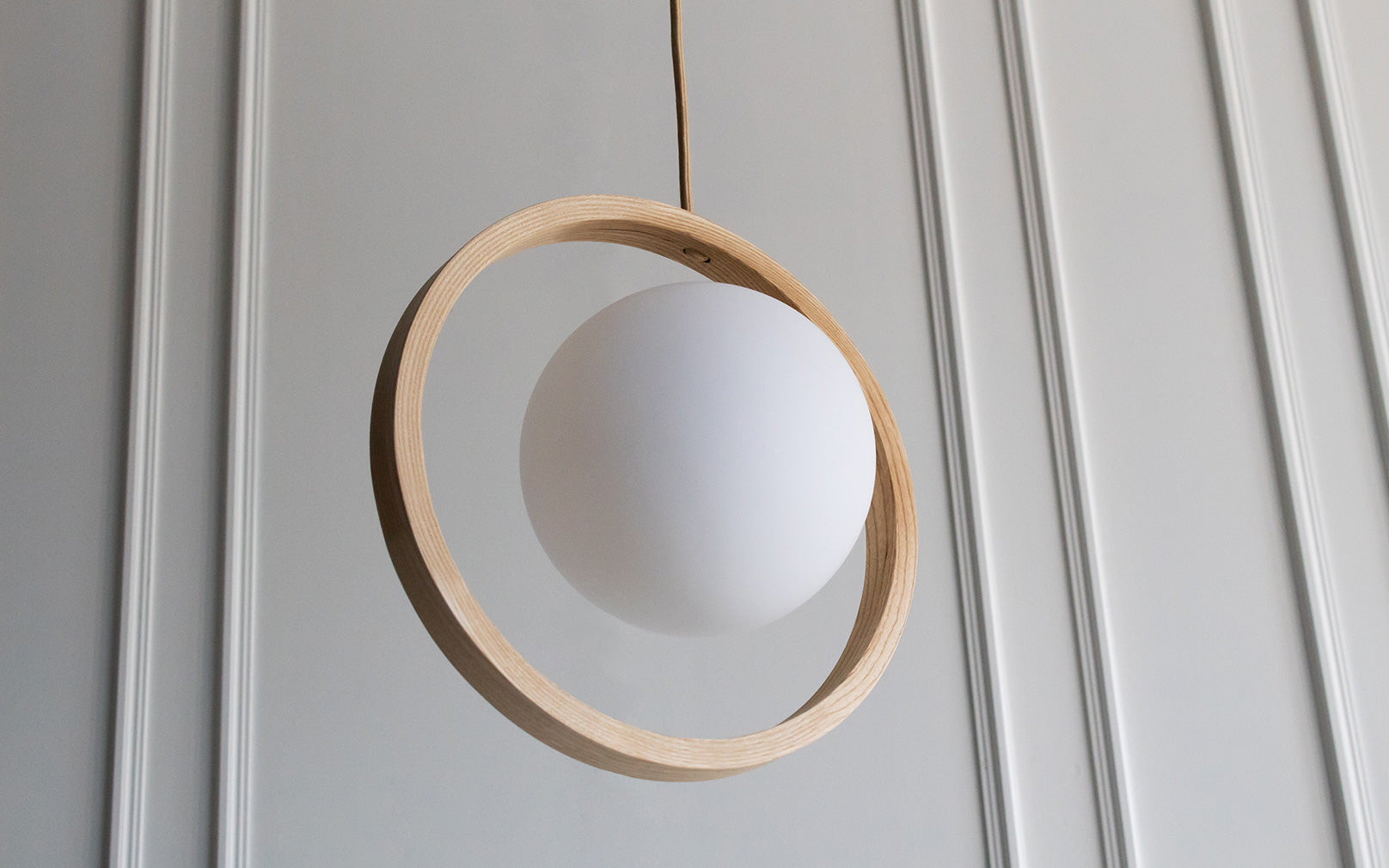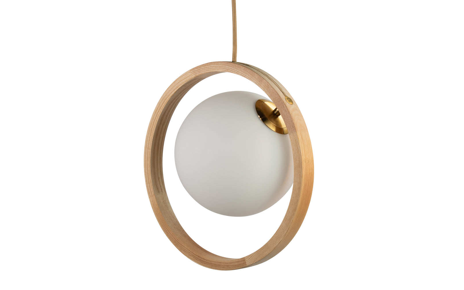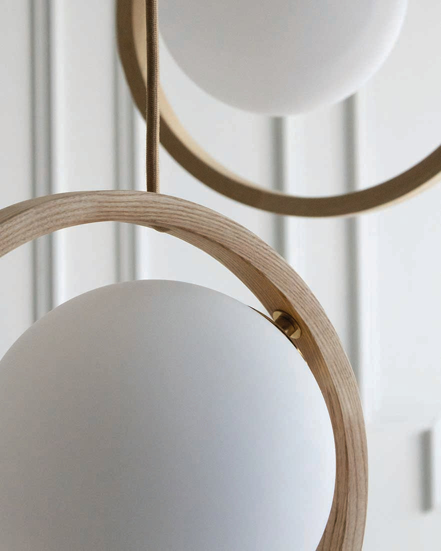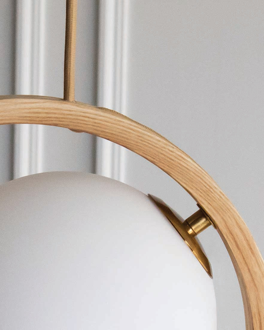 Inspired by the elliptical orbits of the planets and moons that line the inner edges of our vast solar system, the Loer Pendant Light brings weightless illumination to any space it reaches. Combining beautiful translucent glass, sustainable steam bent ash wood and brushed metallic brass, the Loer showcases minimal, nature-inspired design at its finest.