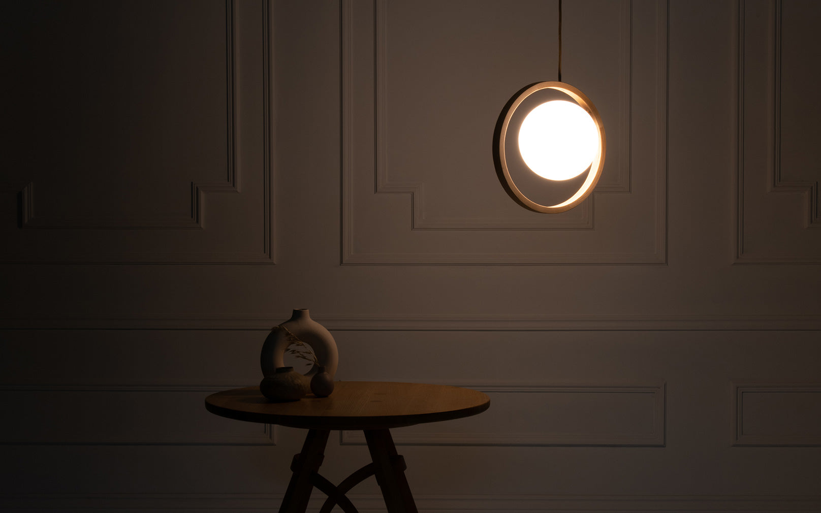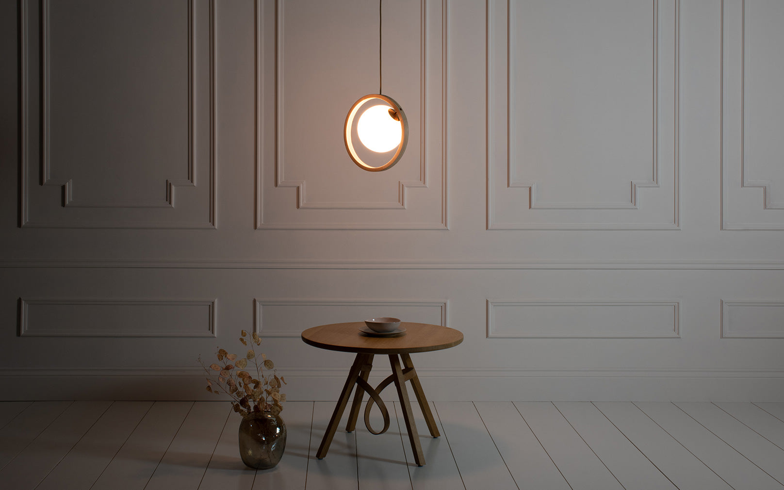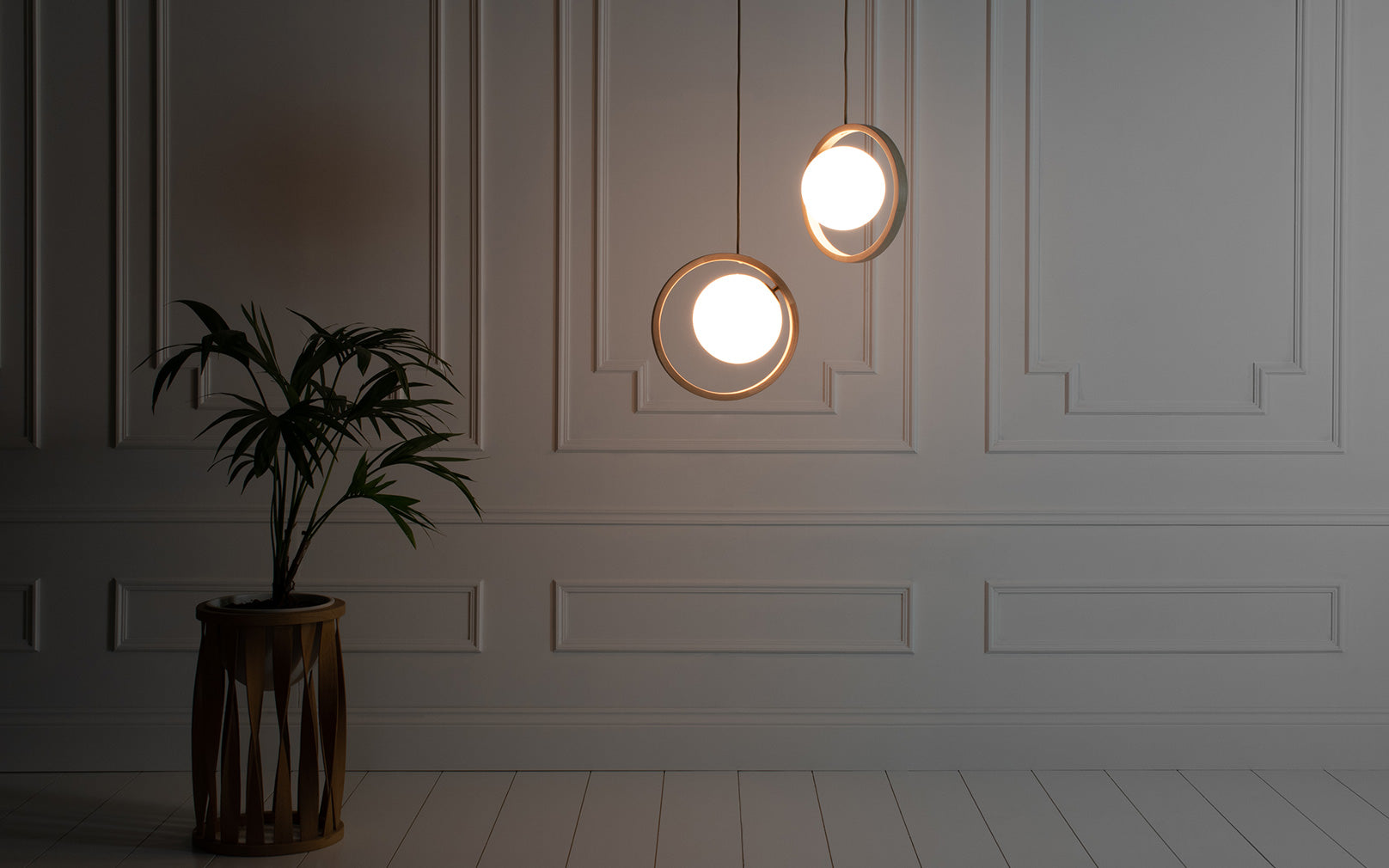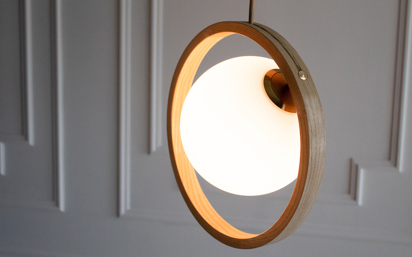 Inspired by the elliptical orbits of the planets and moons that line the inner edges of our vast solar system, the Loer Pendant Light brings weightless illumination to any space it reaches. Combining beautiful translucent glass, sustainable steam bent ash wood and brushed metallic brass, the Loer showcases minimal, nature-inspired design at its finest.