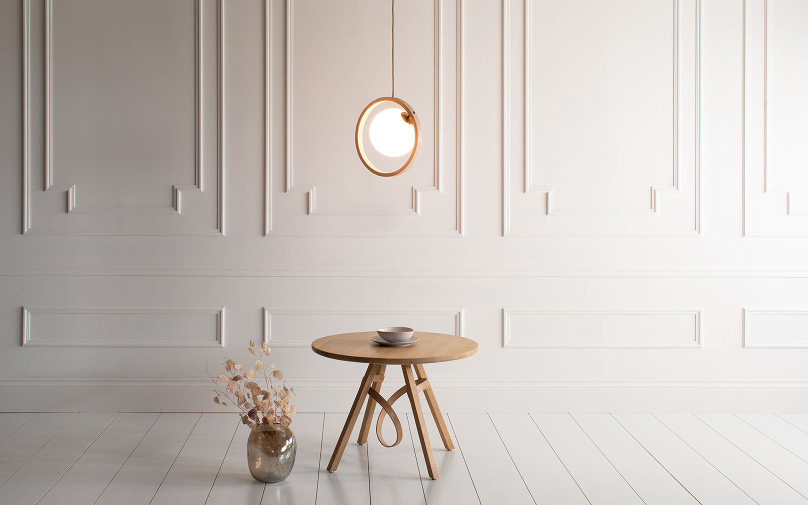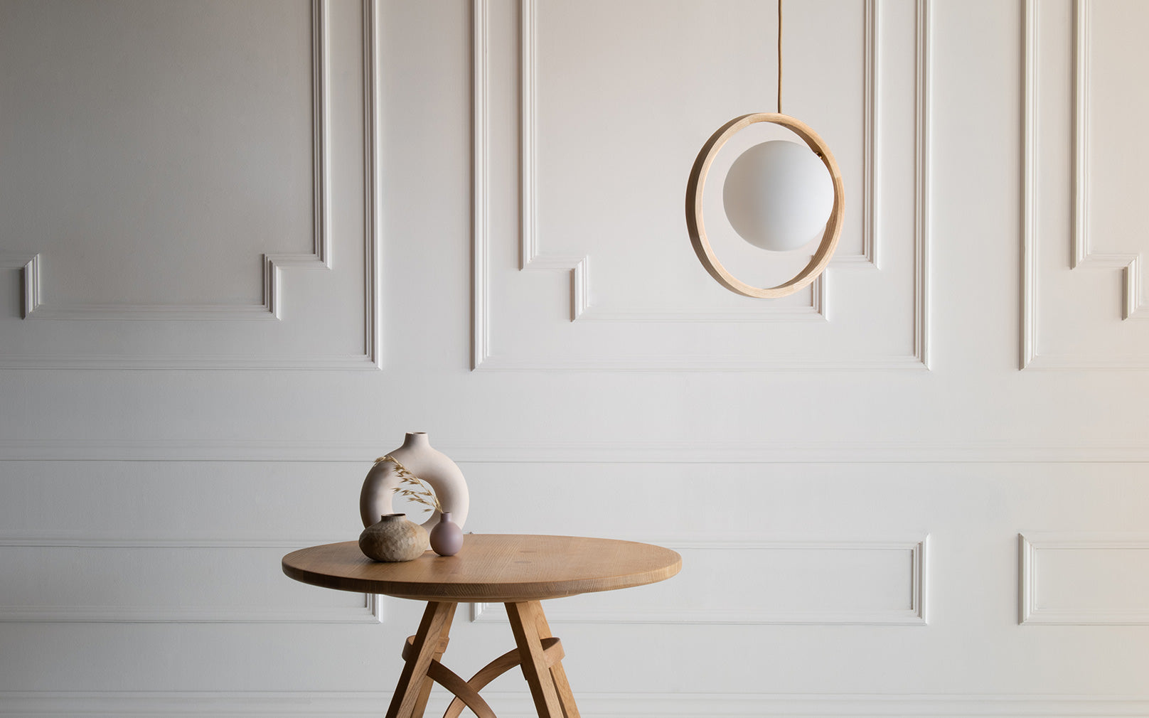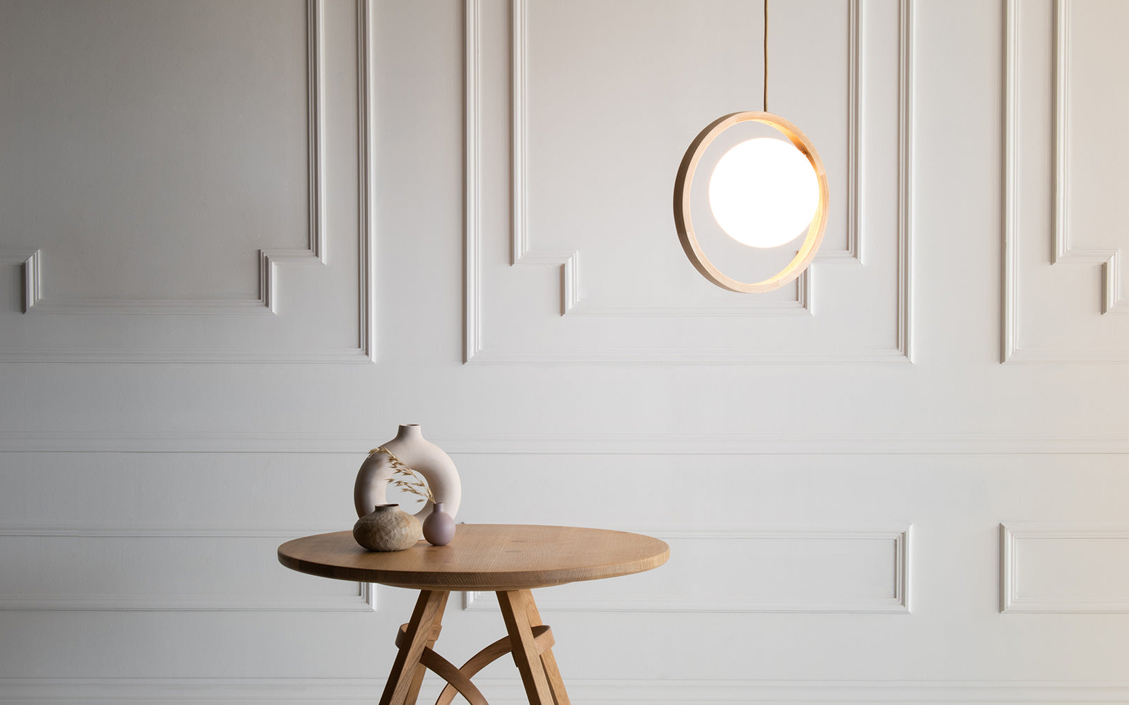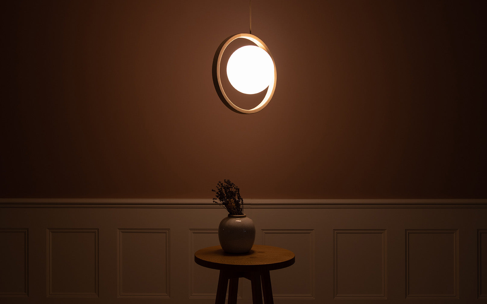 Inspired by the elliptical orbits of the planets and moons that line the inner edges of our vast solar system, the Loer Pendant Light brings weightless illumination to any space it reaches. Combining beautiful translucent glass, sustainable steam bent ash wood and brushed metallic brass, the Loer showcases minimal, nature-inspired design at its finest.