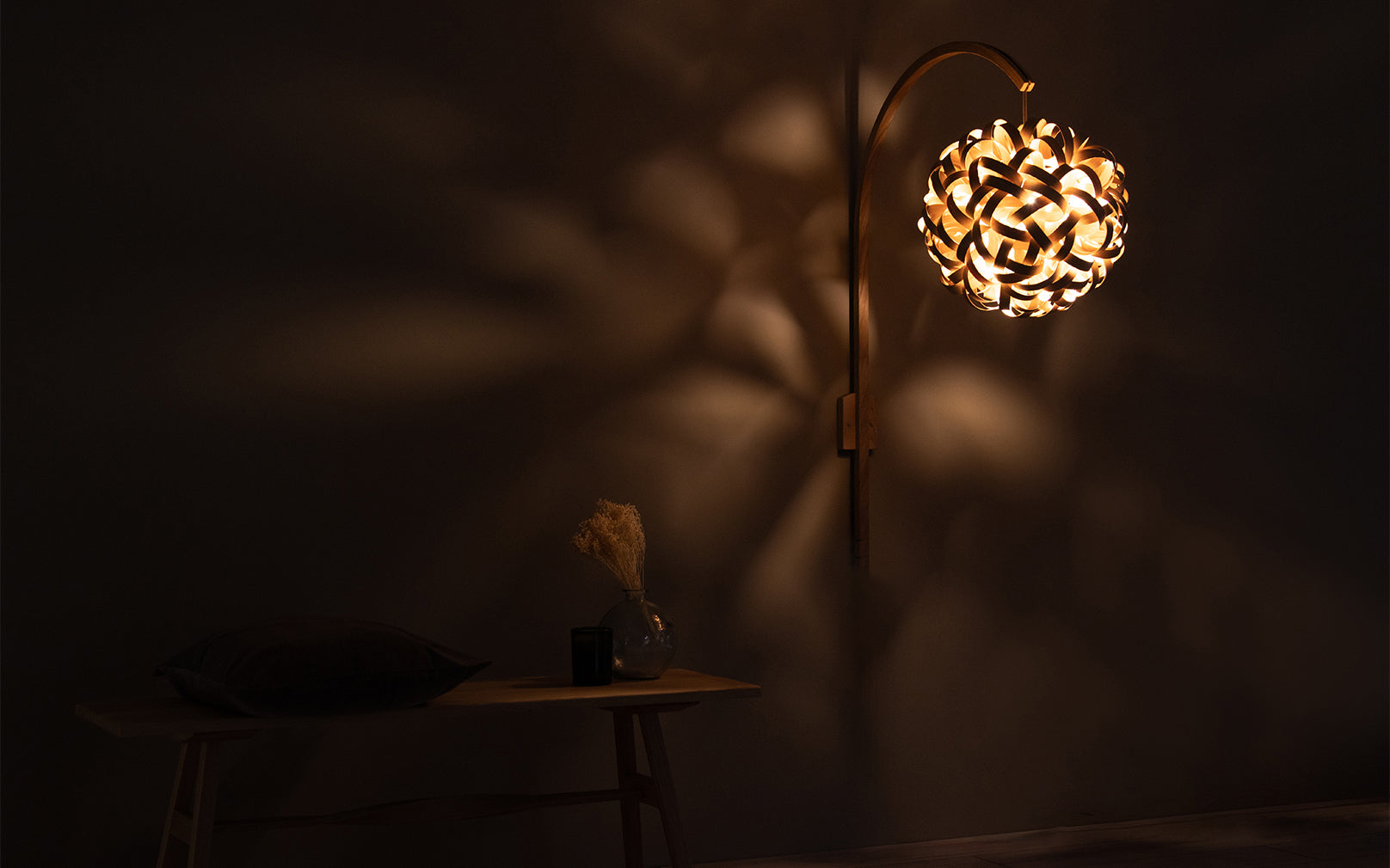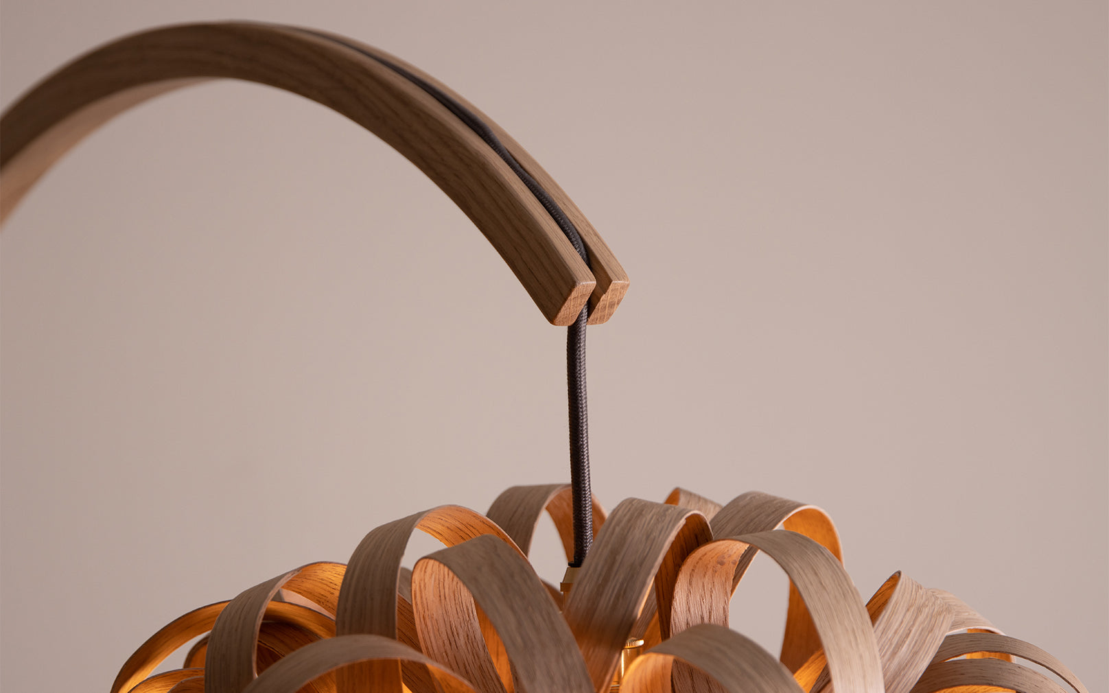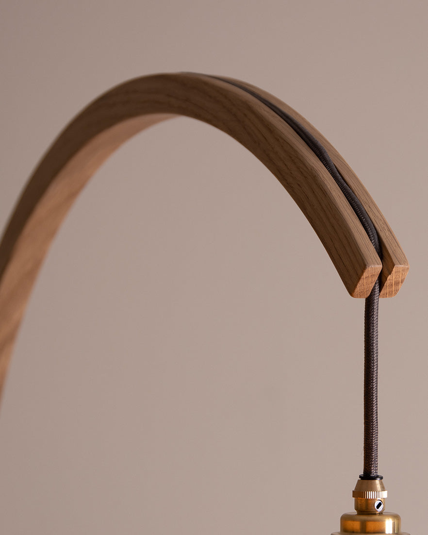 An arc of sustainably sourced oak grows up and out from a solid base, suspending the No. 1 Pendant at perfect height to display a dramatic display of light and shadow across your space. The Tilow’s steam bent design will divide and balance your interior with ease as it illuminates with a warm, welcoming glow. Whether invited into your home as dynamic landing lighting or calming texture to your living space, this Large Tilow and No. 1 Pendant duo extends unique, striking design to your walls.