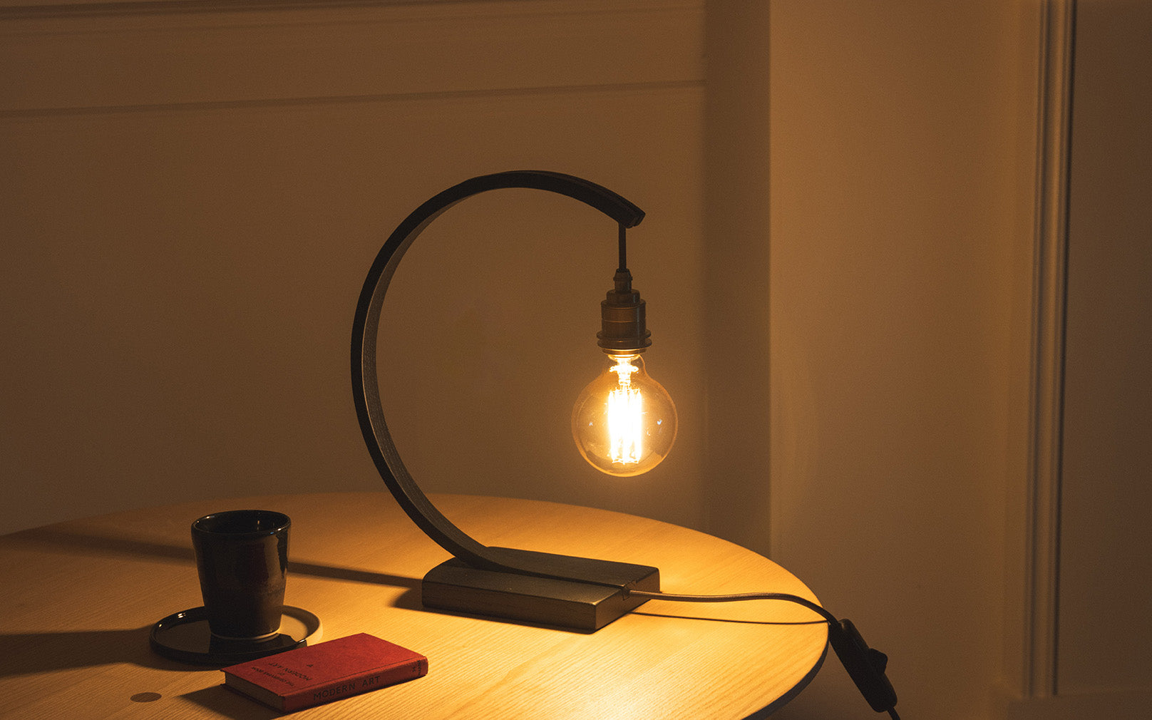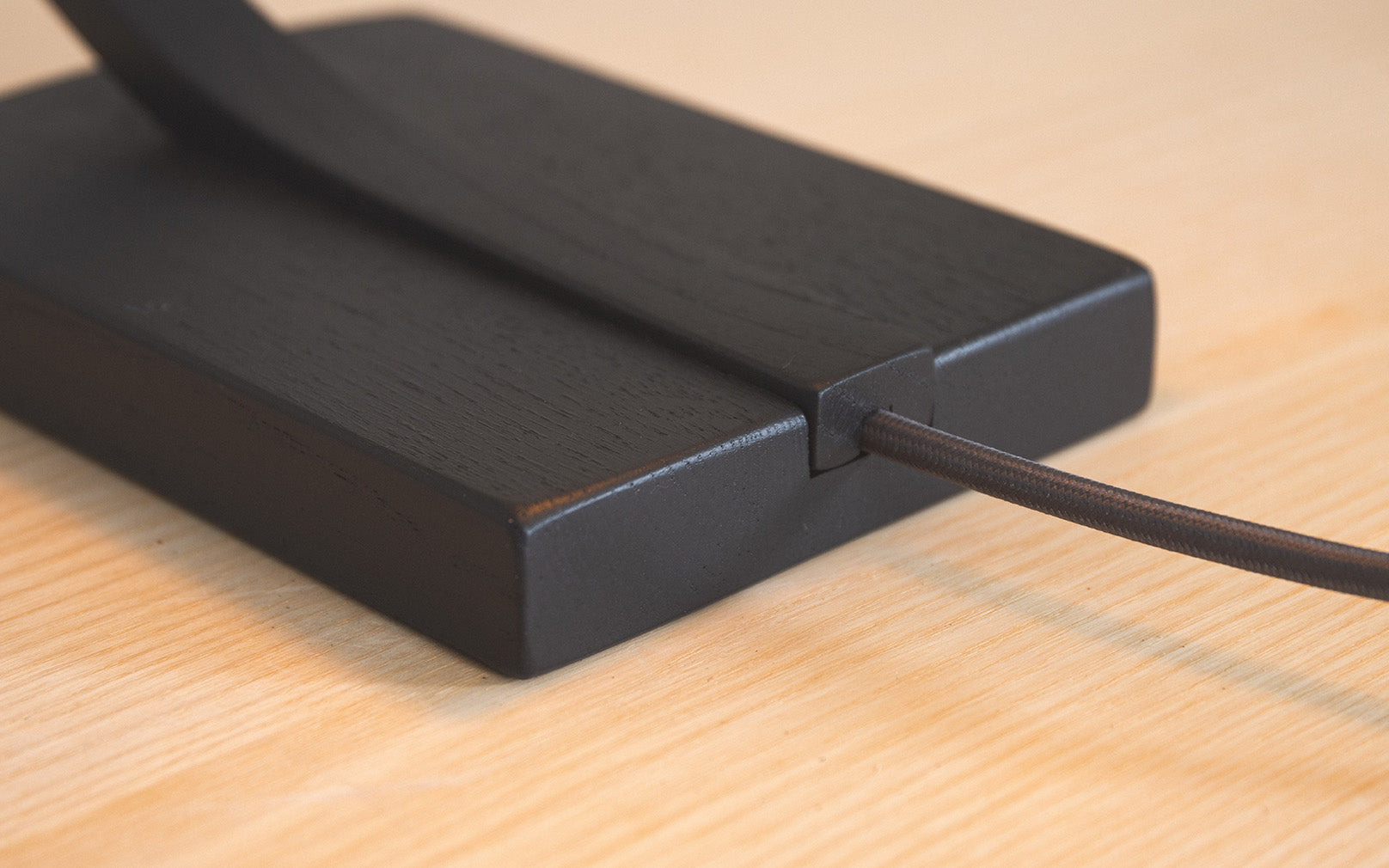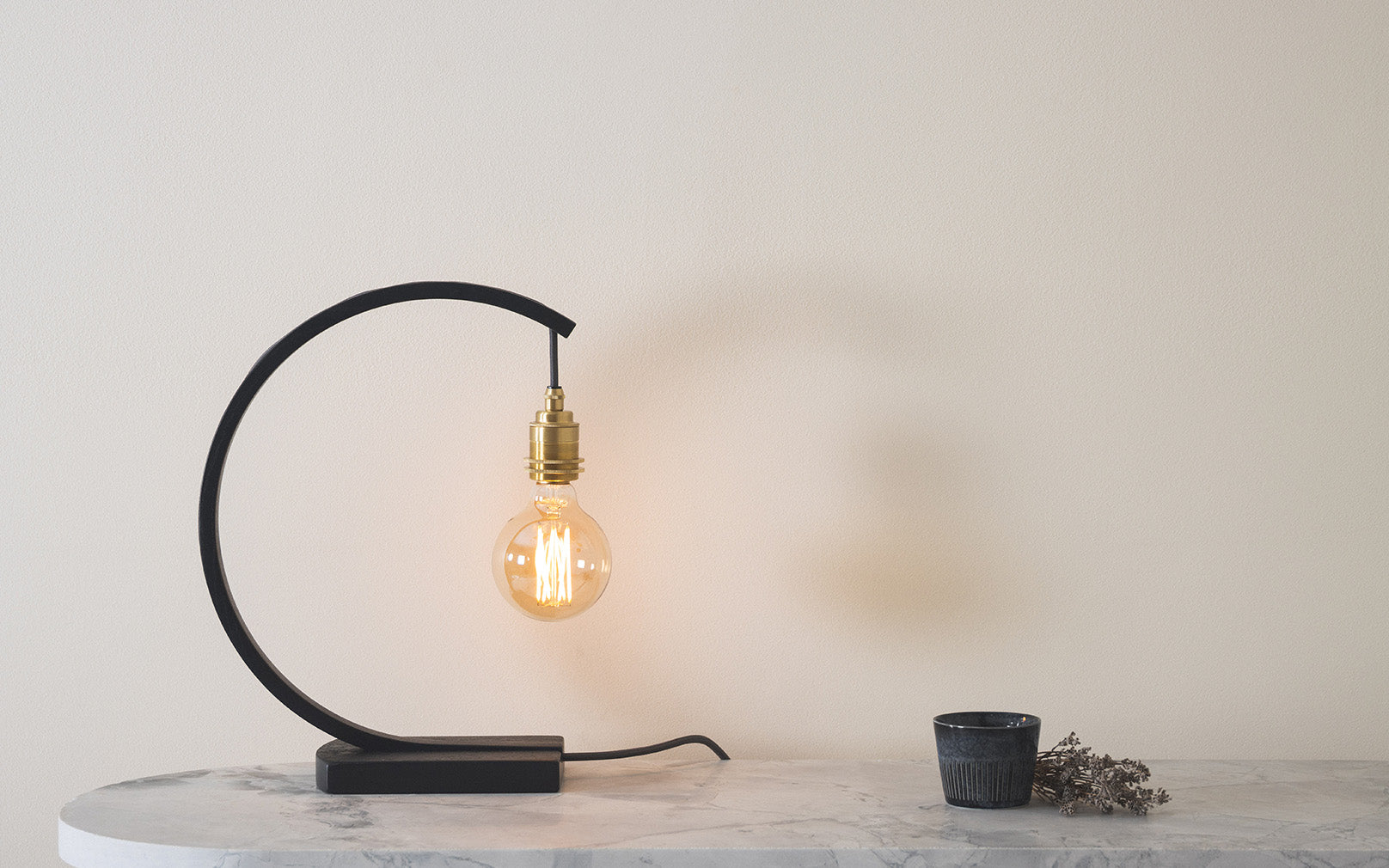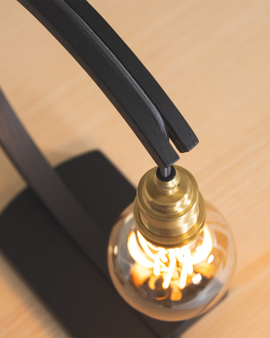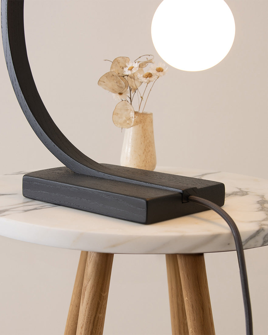 Modern. Refined. Enticing. An arching curve of steam bent, black ebonised oak arches from its roots to showcase an exposed bulb which casts a boundless glow. Use the statement Noctis Hanter Table Light to restore calm within bustling kitchens, hallways or living spaces. Radiating light in all directions, the wooden table lamp blends an inviting ambience with a sharp design aesthetic.