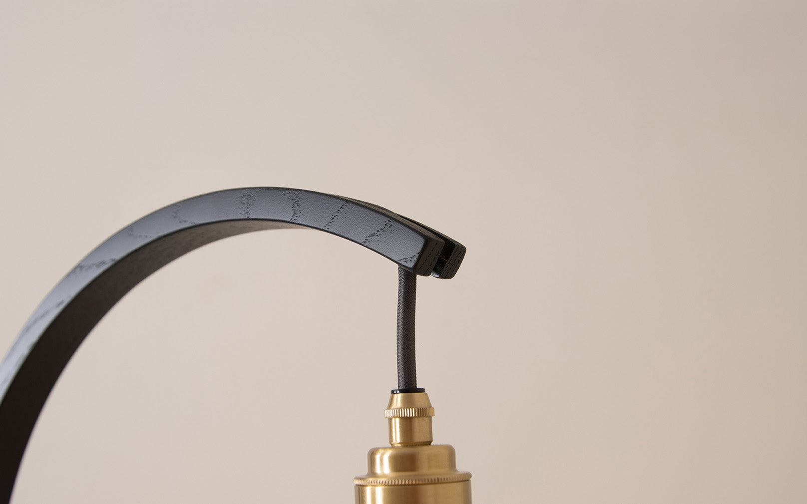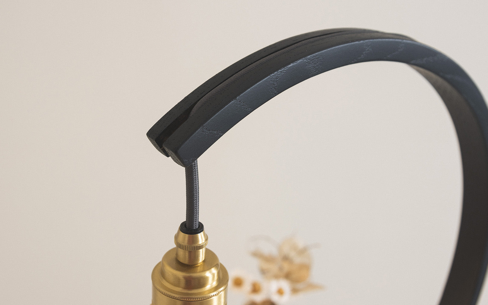 Main materials: Ebonised wood. Brass bulb holder, grey flex, inline switch.
