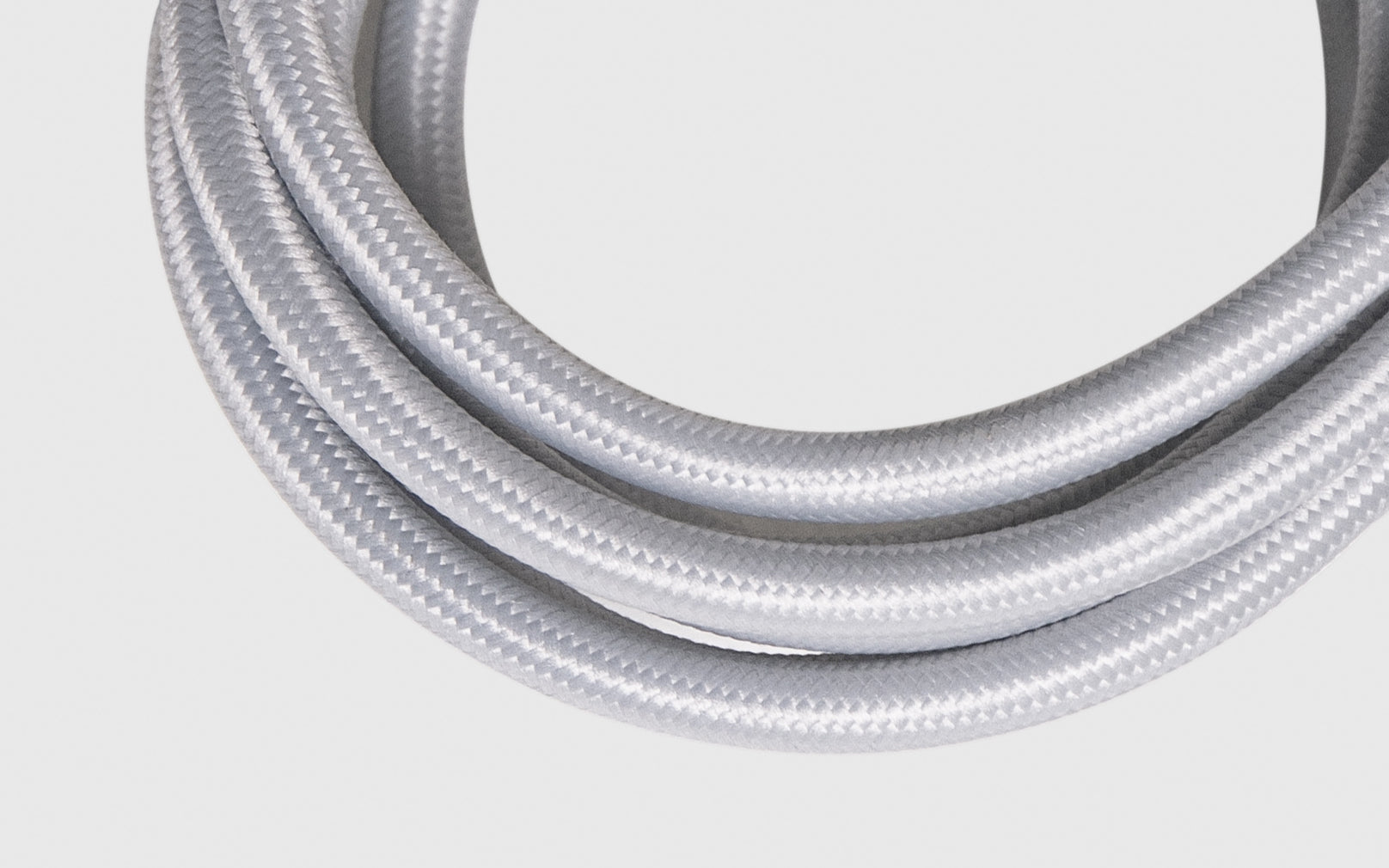 Main materials: silver metal bulb holder, grey fabric flex, silver metal ceiling rose