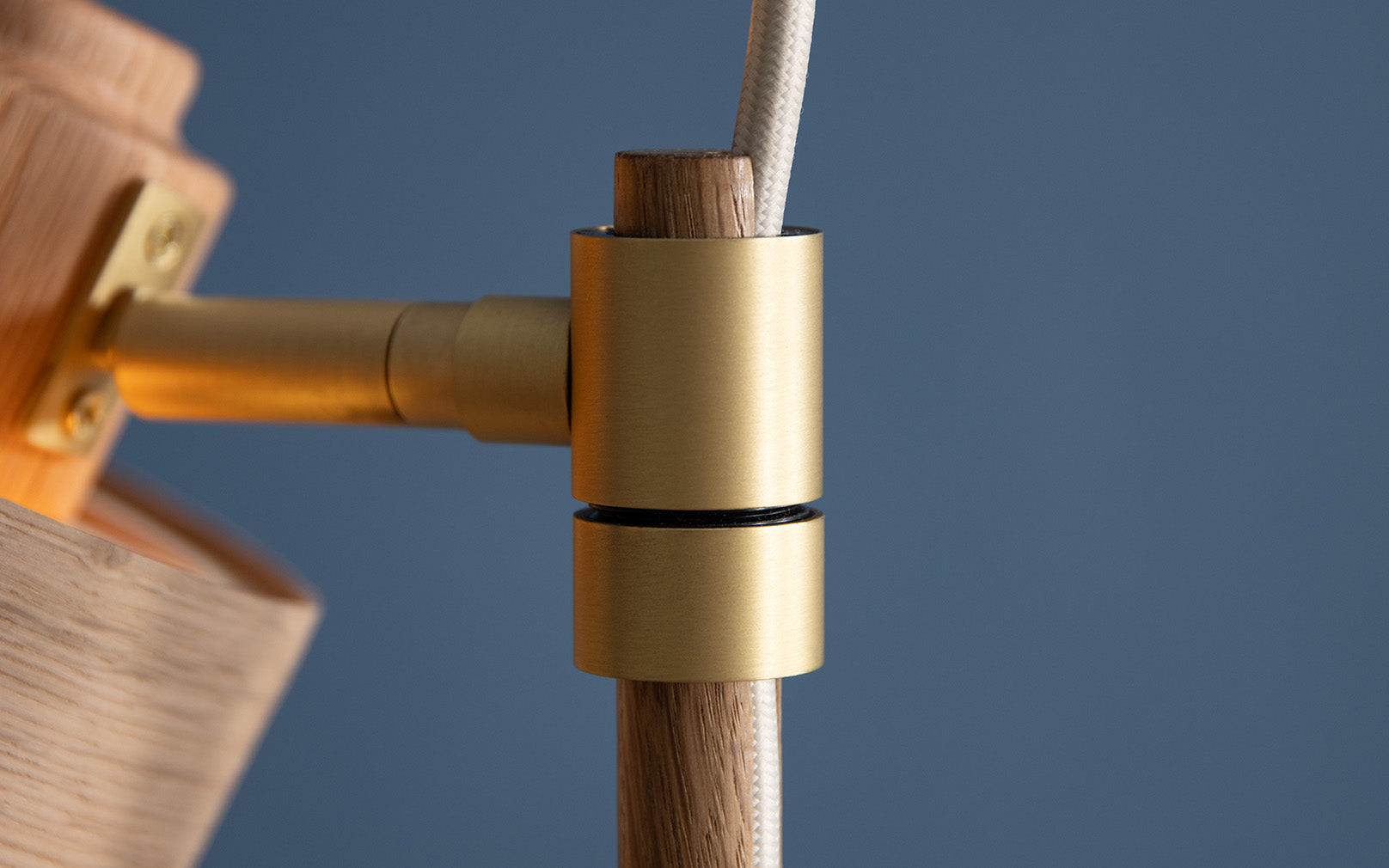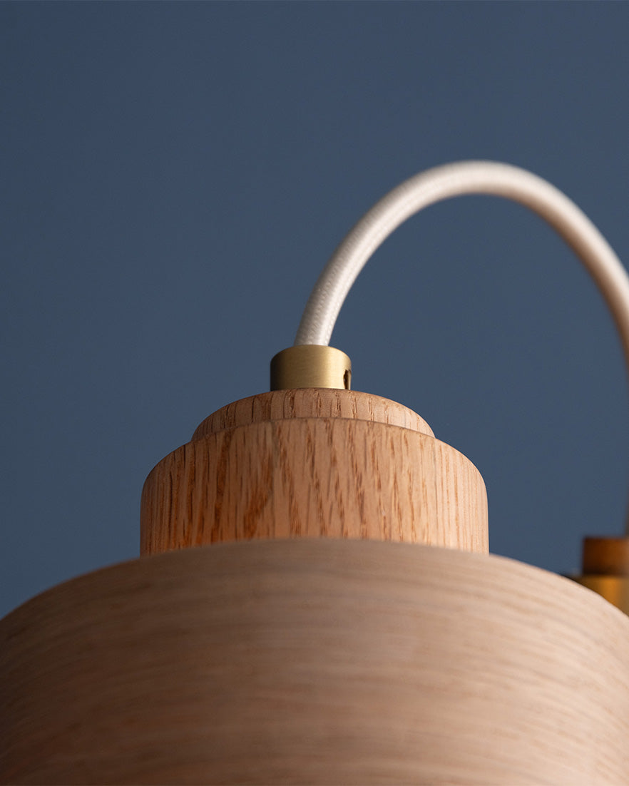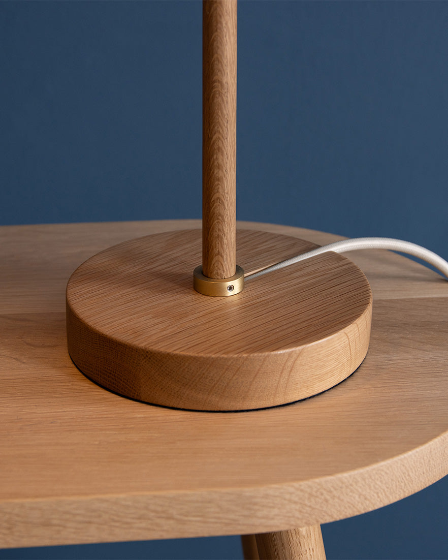 Materials: Sustainably sourced oak base plate and bulb holder, cream fabric flex. Sustainably sourced oak shade, birch plywood, brass screws