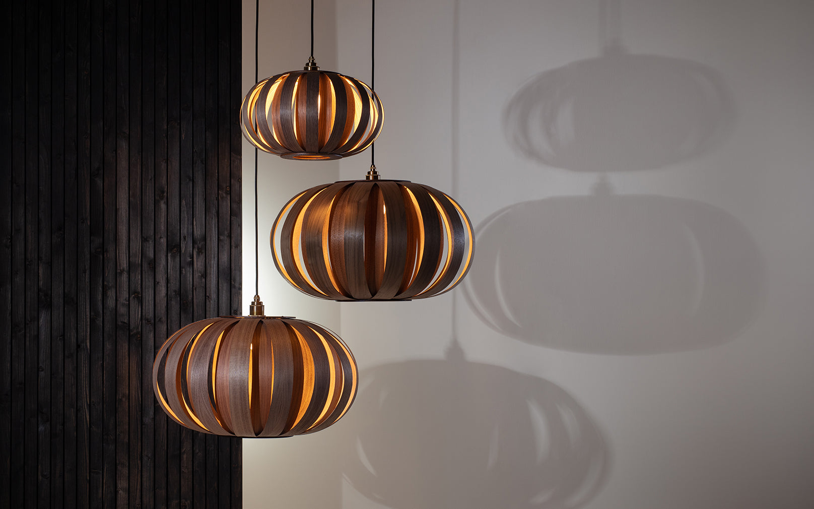 A trio of pendants from our iconic Urchin Lighting Range gracefully cascade to create pools of brightness in the dark. Streams of light escape through the seams of ninety-six lengths of fused ash, oak or walnut wood producing beams of delicate, eye catching warmth. Designed to ensure that the light bulb inside is completely concealed behind curving wooden petals, our Urchin Pendants create a dynamic cluster ceiling light that suits those who prefer soft, ambient light.