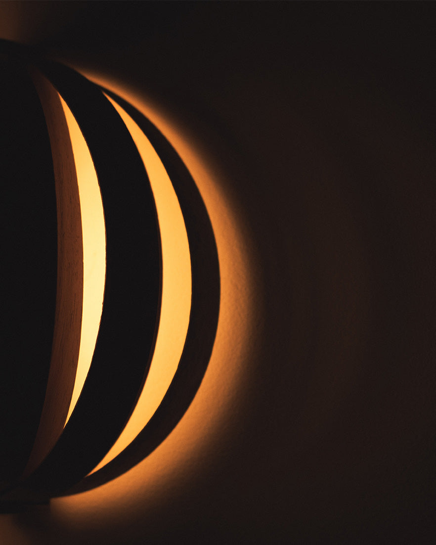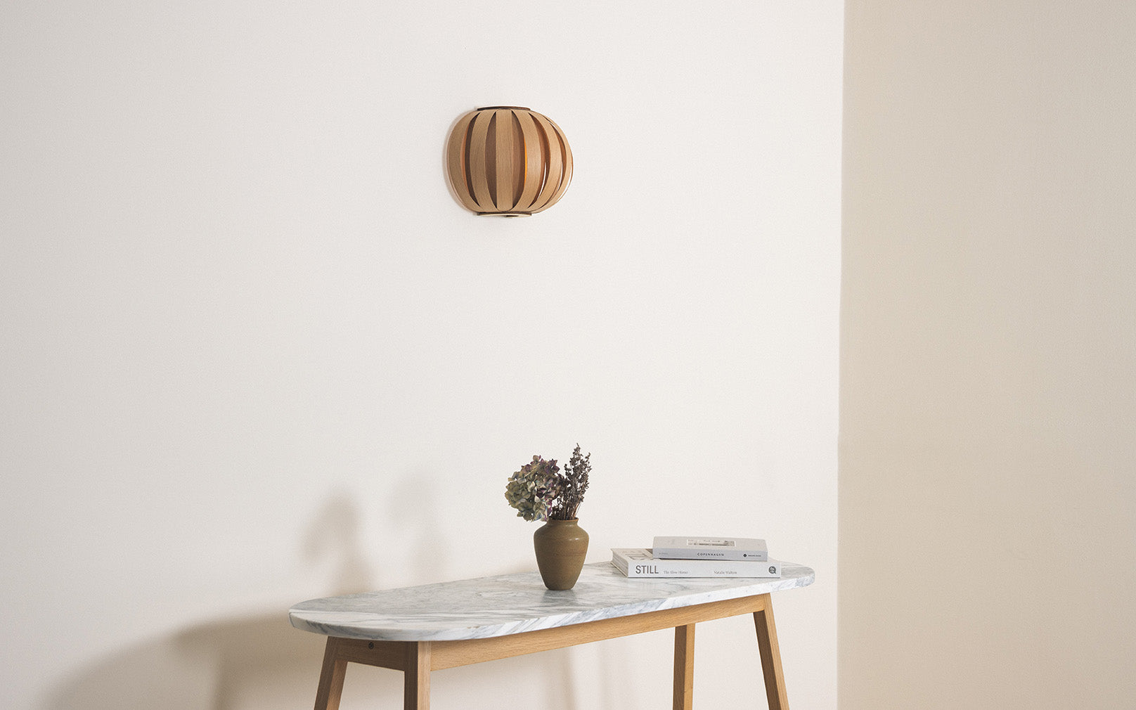 Warm light gathers between strips of wood. Flexed to the brink then fixed into an organic sphere inspired by sand combed shells, our Urchin Lighting Range brings atmosphere in abundance.